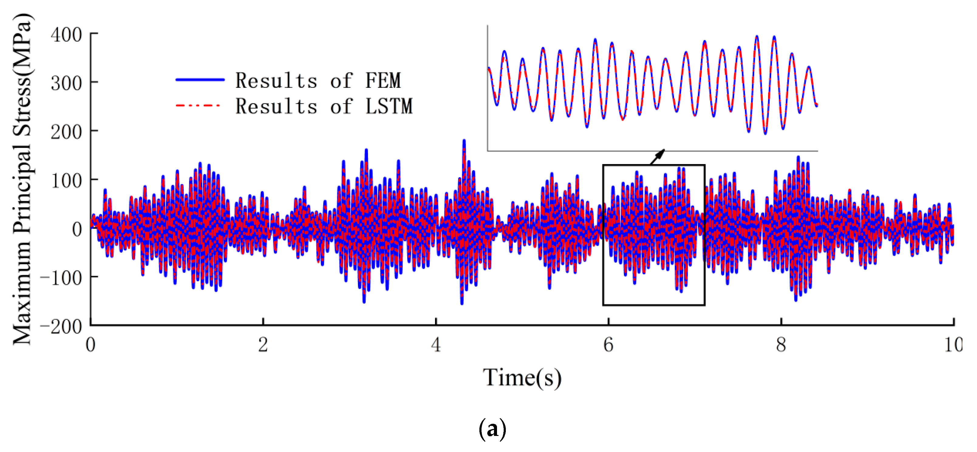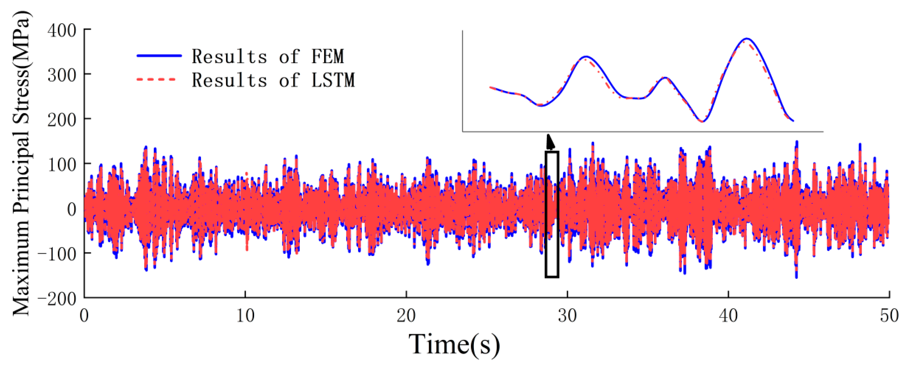 ). The trained LSTM surrogate model was then employed to predict stress responses in critical regions under load spectra of varying durations: 30 s, 60 s, …, 240 s, respectively. FEM calculations were simultaneously performed under corresponding loading conditions to generate benchmark data for comparison. As shown in