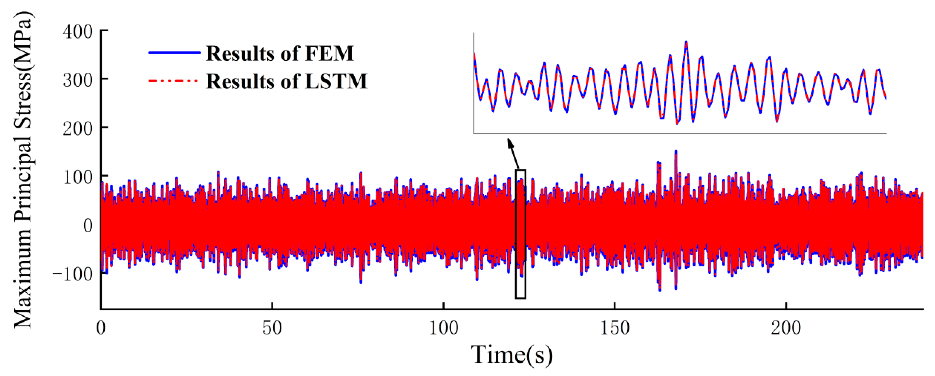 between the stress response predictions from the LSTM surrogate model and FEM across durations ranging from 30 to 240 s demonstrates that the surrogate model’s predictive accuracy remains unaffected by prediction duration, maintaining