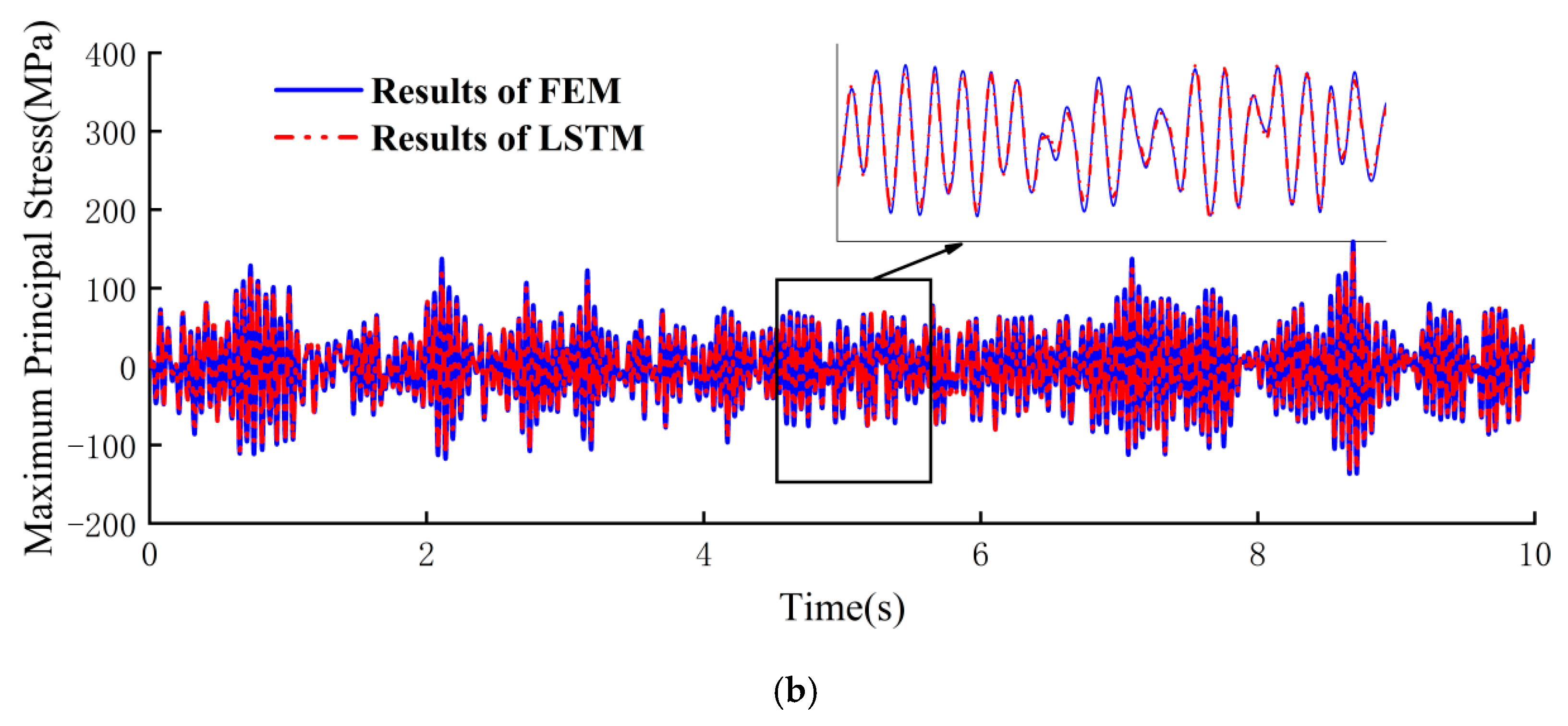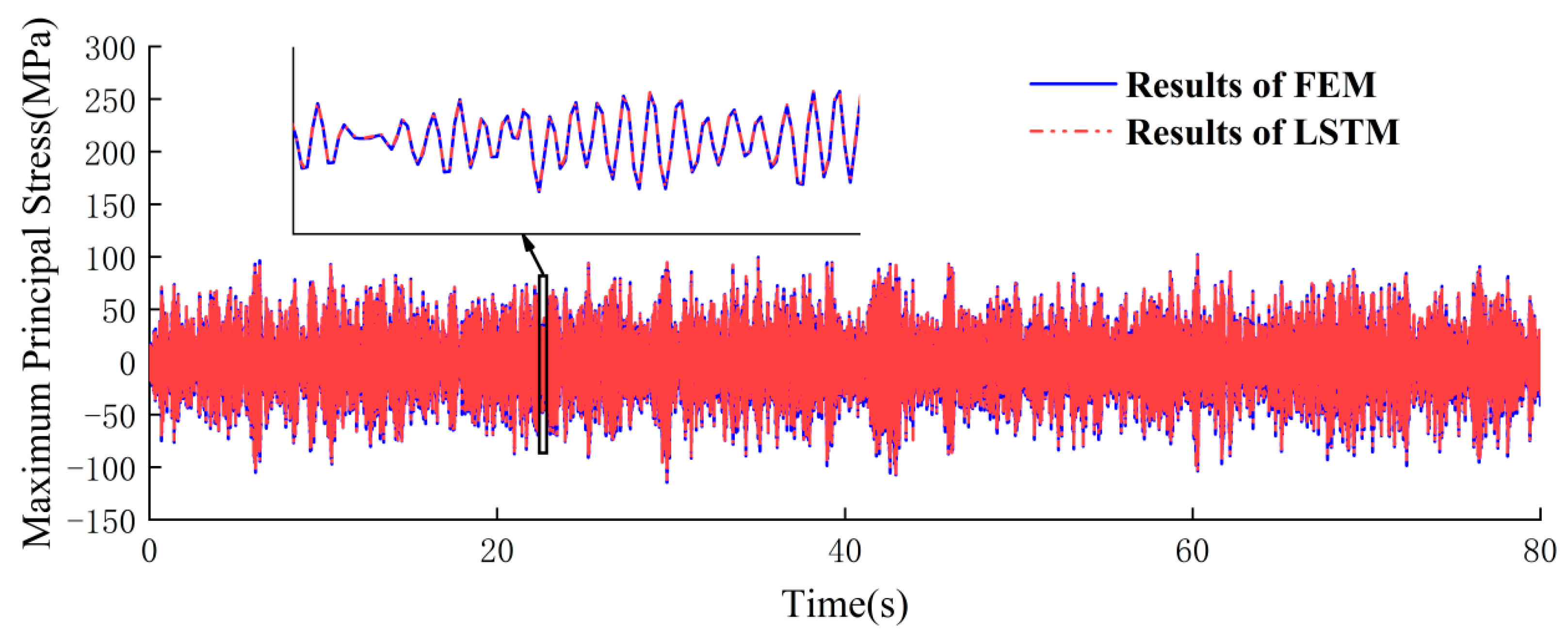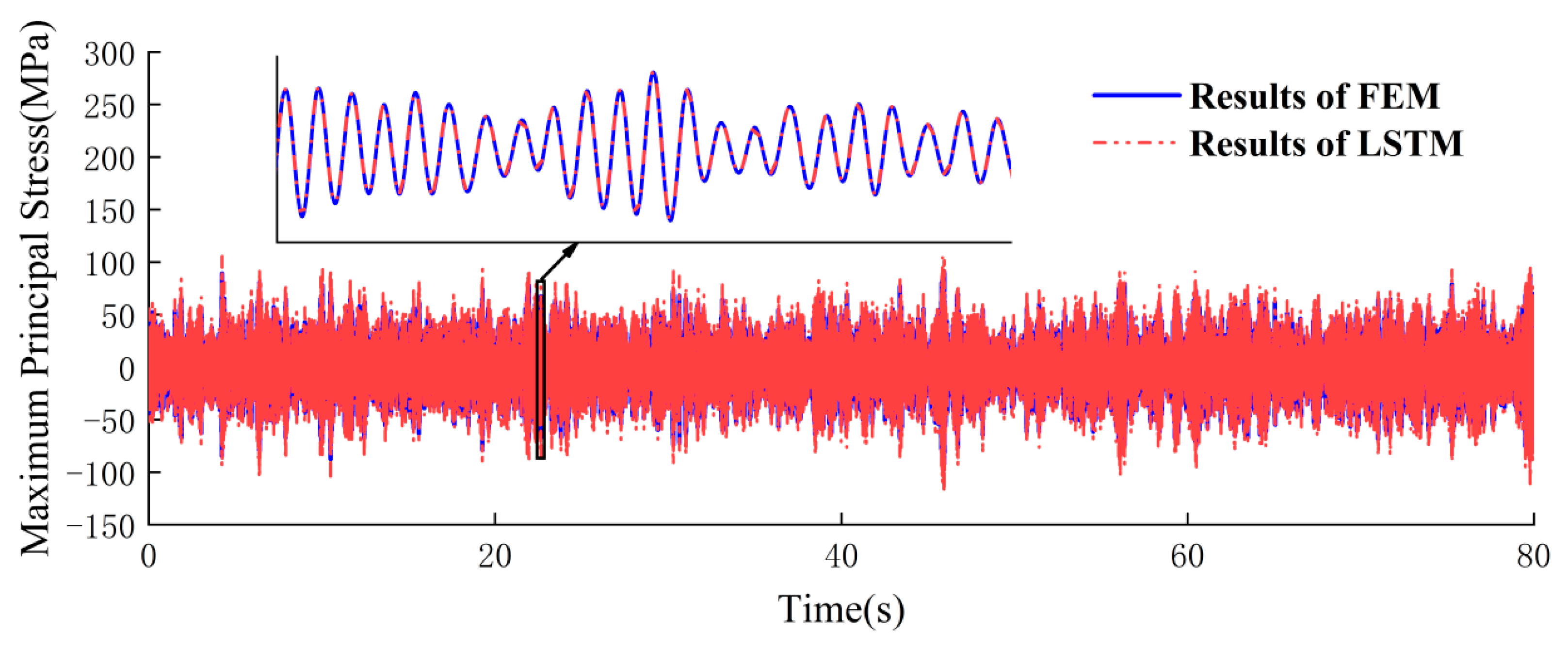 Figure 11. Under prolonged excitation, the LSTM surrogate model predictions maintain a high level of agreement with FEM calculations in waveform patterns. Notably, FEM computations for 240 s load excitation required 95 h, whereas the LSTM surrogate model achieved equivalent results in merely 3 s. These results demonstrate that the surrogate model, when trained on short-duration data to predict long-duration load-induced response signals, exhibits high accuracy and a significant efficiency advantage.