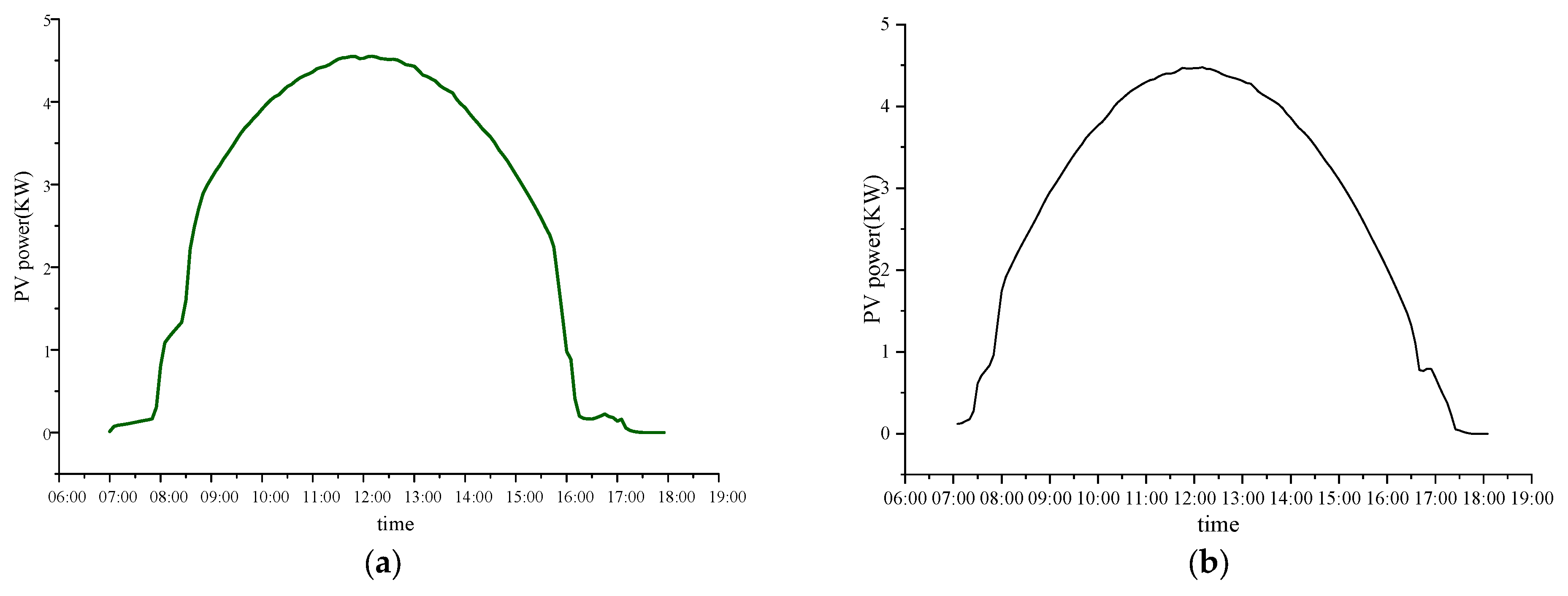 Figure 4. Photovoltaic power generation data for a certain day: (a) one day in April 2022; (b) one day in October 2022.