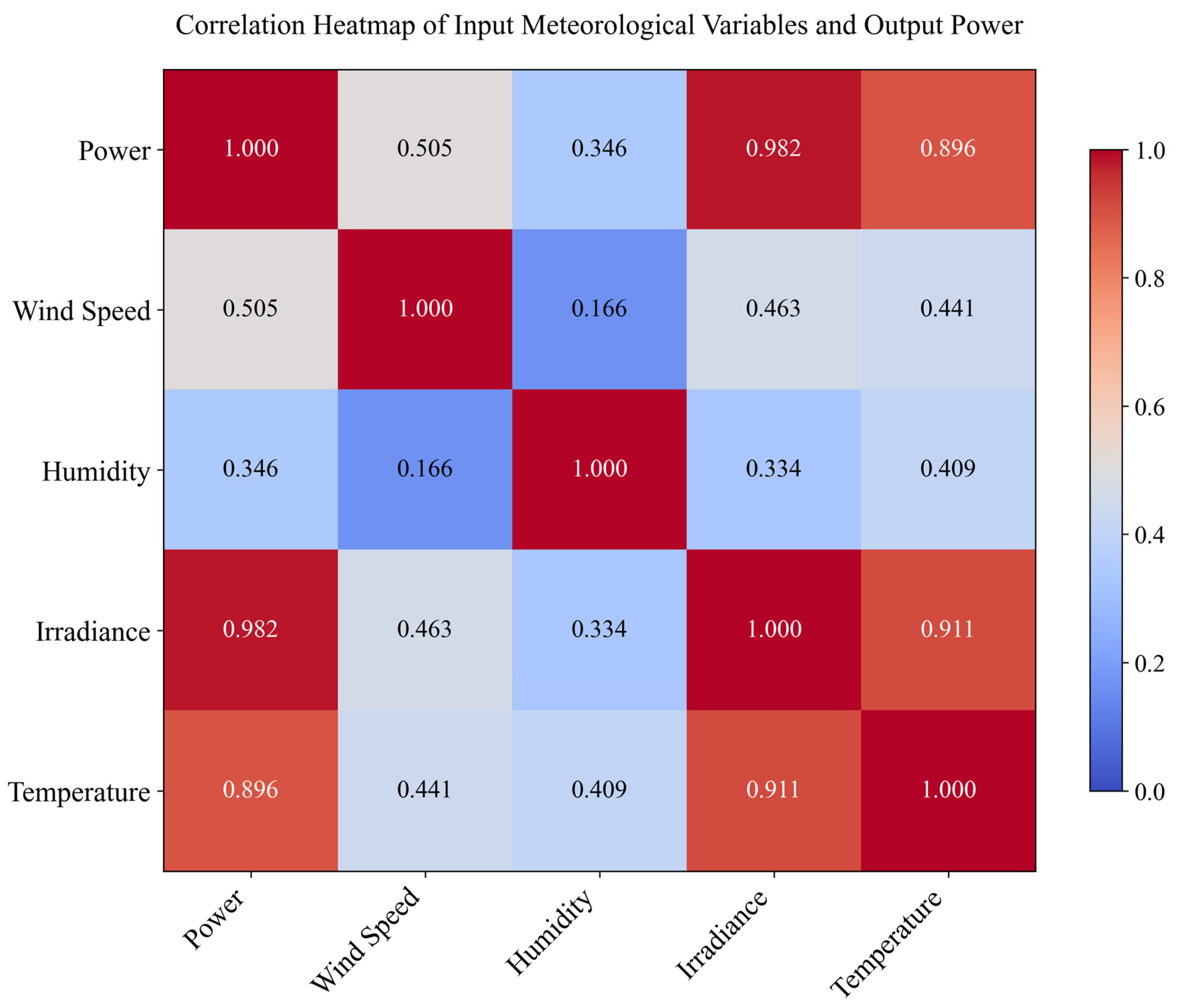 To explore the physical relationships between meteorological inputs and PV power generation, a comprehensive correlation analysis was conducted among all candidate features and the measured PV output. As illustrated in Figure 5.