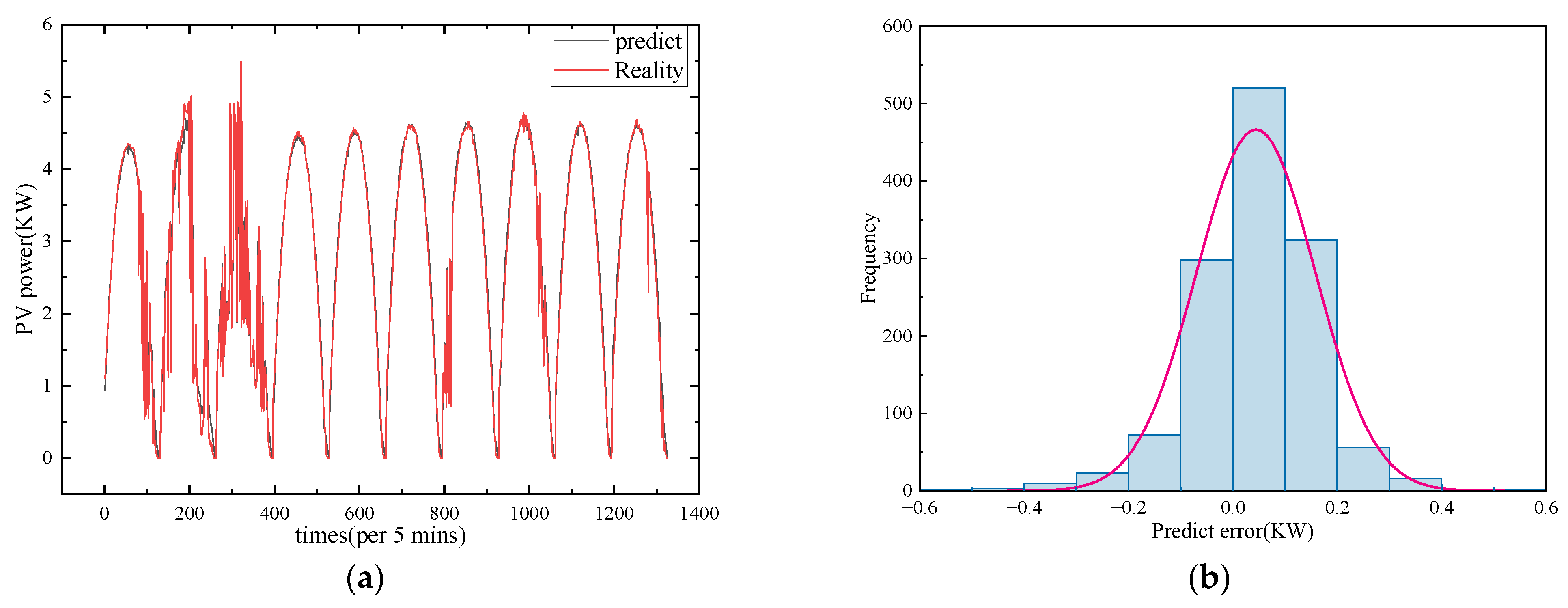 Figure 6a shows the prediction results and actual photovoltaic power values of the GBMDF over ten days after 256 training iterations, while Figure 6b shows the prediction error histogram and the fitted normal distribution curve. From Figure 6, we can see that the GBMDF performs exceptionally well in short-term photovoltaic power prediction. The approximately normal error distribution indicates that the model’s prediction error is random and lacks systematic bias, which is an important indicator of the model’s robustness.