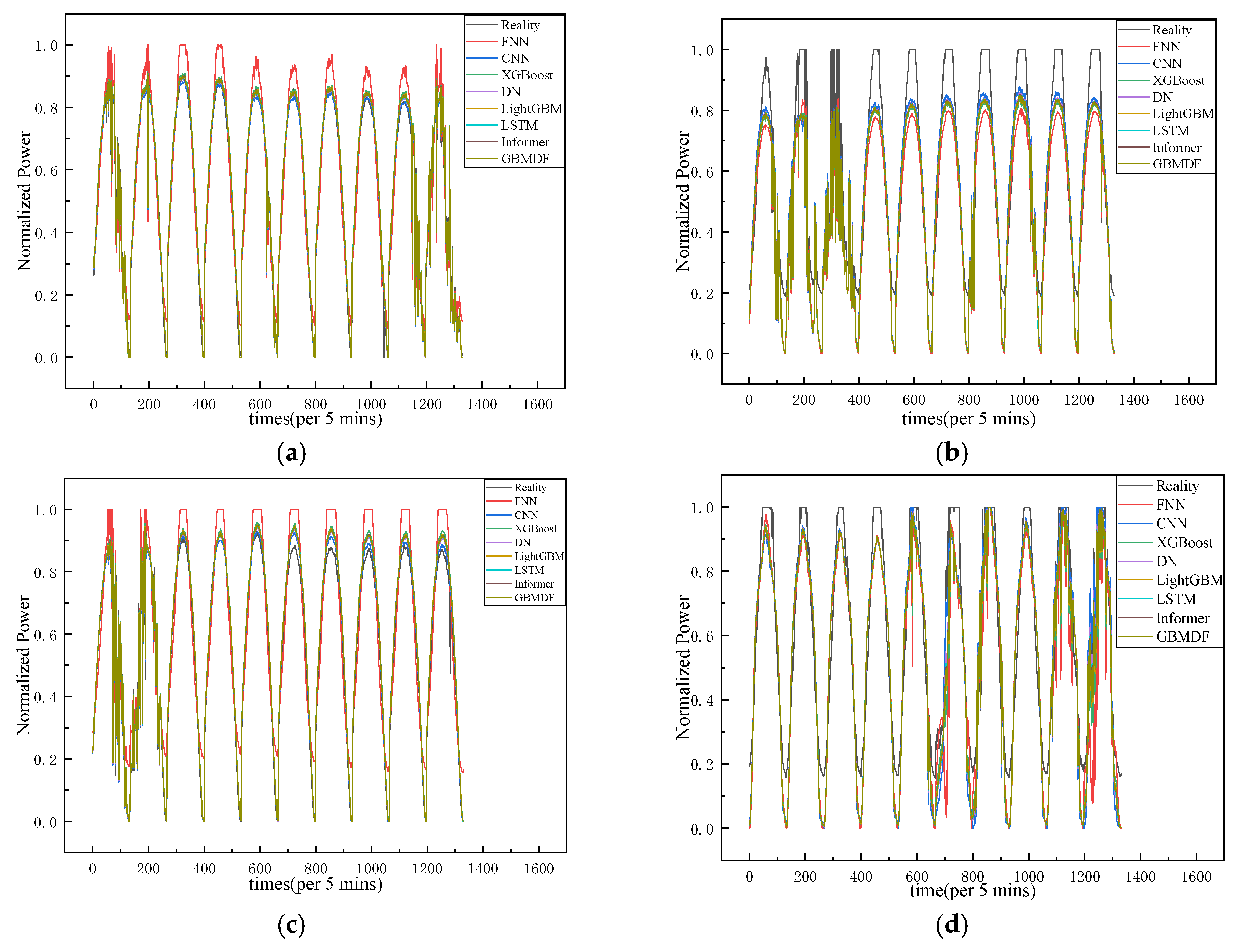 To further evaluate the predictive performance of the GBMDF architecture, we conducted a comparative analysis with several classical models using identical datasets and validation protocols. Figure 7 illustrates the prediction curves for FNN, CNN, XGBoost, DN, LightGBM, LSTM, Informer, and GBMDF, alongside the normalized actual PV power curve. All candidate models underwent hyperparameter optimization tailored to the specific data characteristics and available computational capacity, ensuring a robust and fair comparison under consistent experimental conditions.