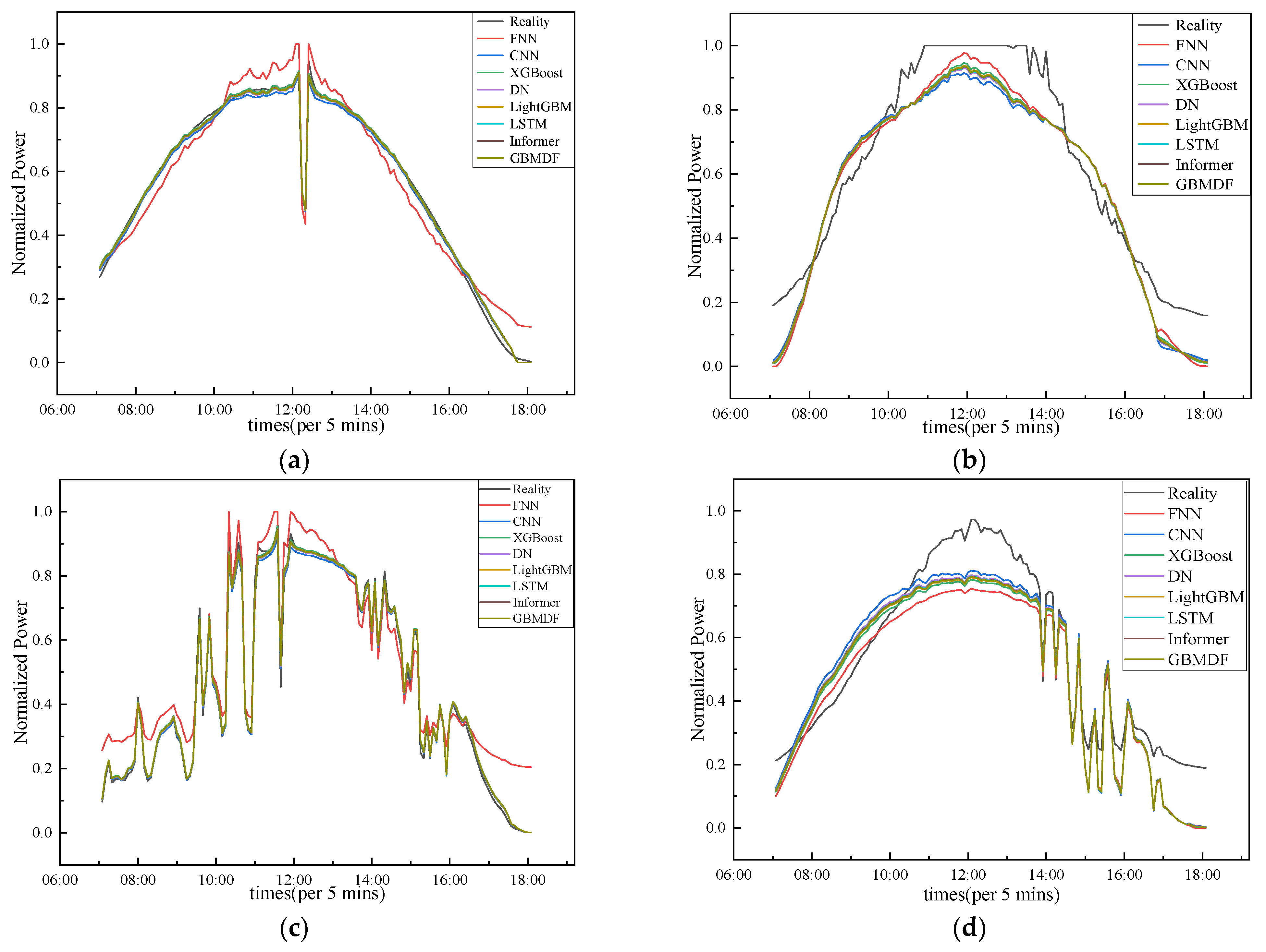 This section first outlines the benchmark models utilized for comparative experimental analysis. Following this, a detailed case study is conducted to examine the PV power forecasting performance achieved through different algorithmic methodologies. Finally, empirical verification is carried out to evaluate the effectiveness of the GBMDF in improving the predictive precision of other forecasting models.