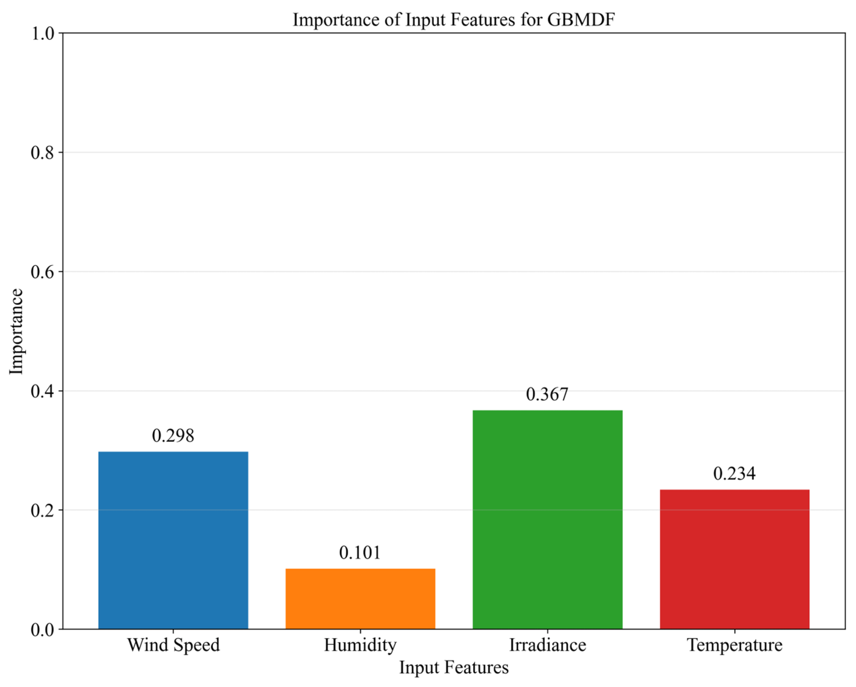 A noteworthy and seemingly counter-intuitive observation arises when comparing the correlation analysis (Figure 5) with the model’s feature importance scores (Figure 9). While Temperature exhibits a strong linear correlation with Power (r = 0.896), its importance score (0.234) is ranked lower than that of Wind Speed (0.298), which has a more moderate correlation (r = 0.505). We posit that this discrepancy does not indicate a flaw in the model but rather highlights the sophisticated way in which the GBMDF model handles multicollinearity among input features.