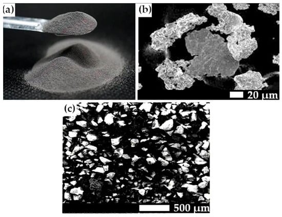 ShKh15 steel powder after magnetic separation: (a)—general view of the cleaned ShKh15 steel powder; (b)—ShKh15 steel particles; and (c)—separated abrasive particles after magnetic separation of grinding waste.