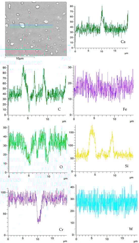 As microstructural studies have shown, carbides are fairly evenly distributed within the metallic matrix (Figure 4b and Figure 5a), preventing the negative phenomenon known as carbide liquation. This uniformity results from the specific features of the matrix formation, which develop from individual metallic particles of purified ShKh15 steel powder. It is well established [21,22] that the influence of alloying elements on a material’s characteristics depends strongly on the method through which they are introduced. For example, chromium tends to form a highly heterogeneous, coarse structure when added as a pure powder during composite fabrication [21,22,25,26]. This behavior is a product of the slow dissolution of chromium in the iron matrix due to its strong tendency to oxidize and form carbides. Moreover, the use of pure Cr powder (especially in large quantities) can cause dimensional growth of samples during sintering, as chromium readily reacts with oxygen. These factors significantly complicate the production of composites containing pure chromium powders, requiring additional protective measures against oxidation and excessive carbide formation (e.g., the inability to use endogas atmospheres) and subsequent mechanical machining of oversized parts.