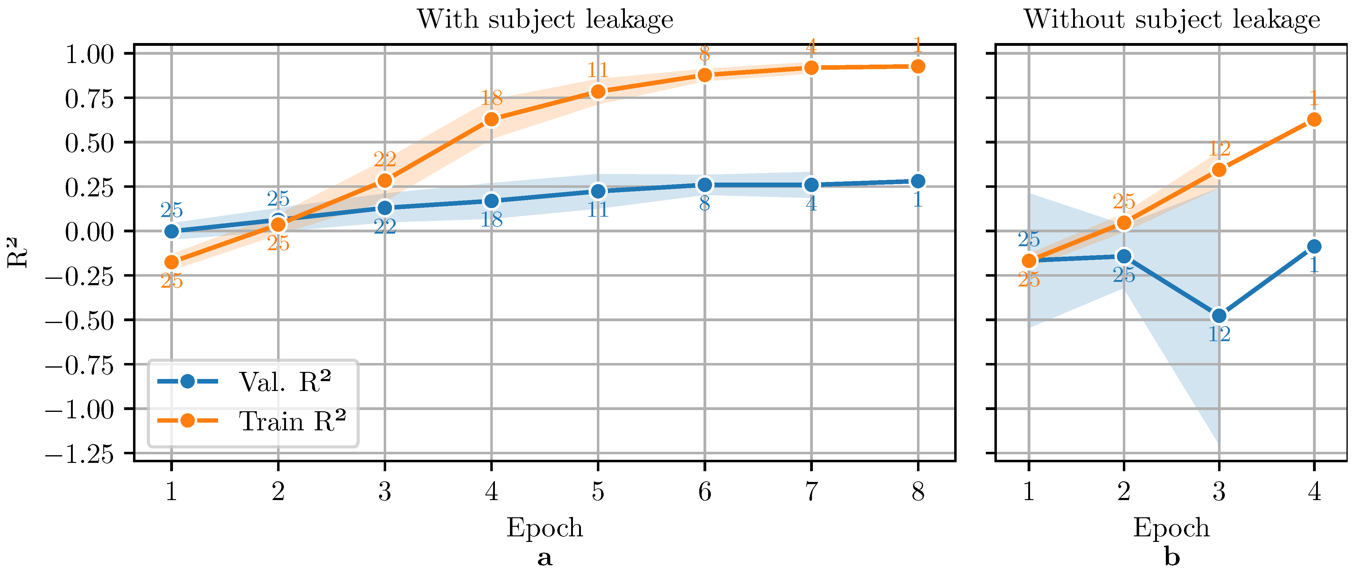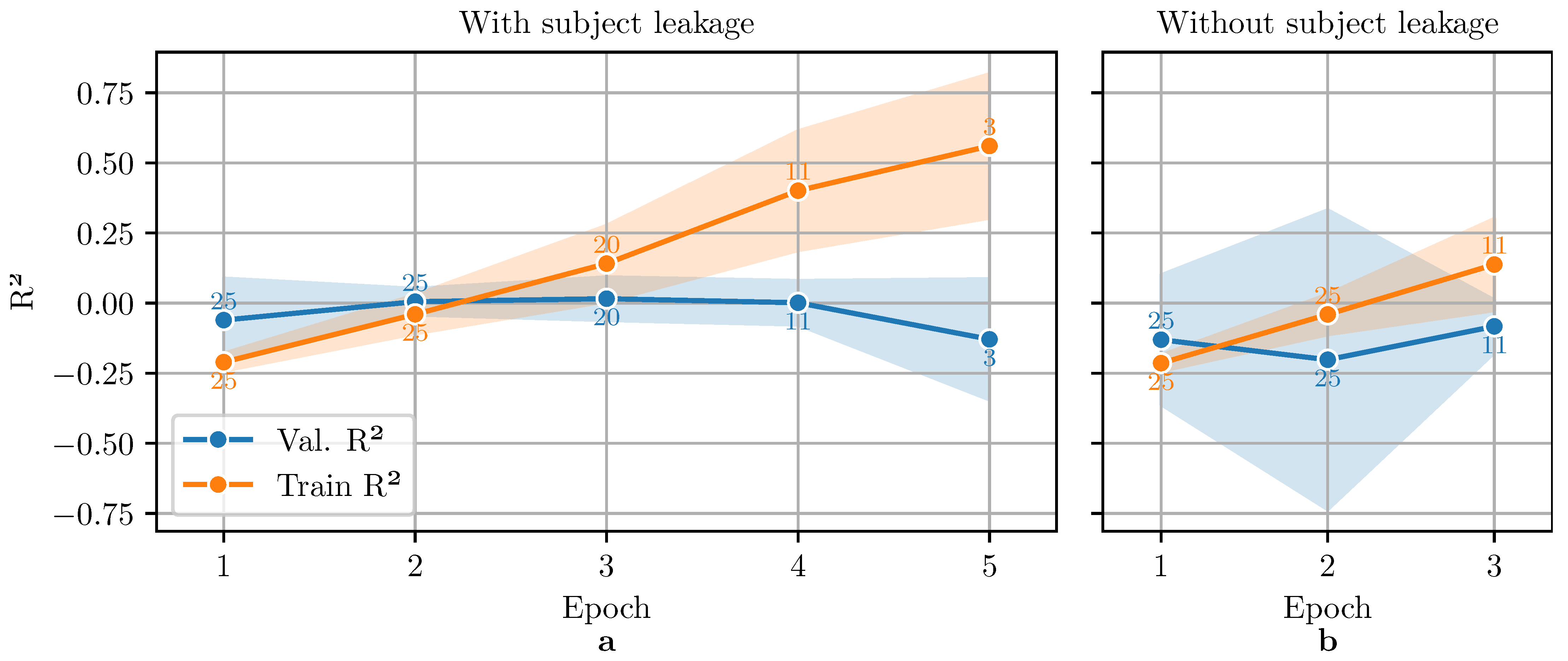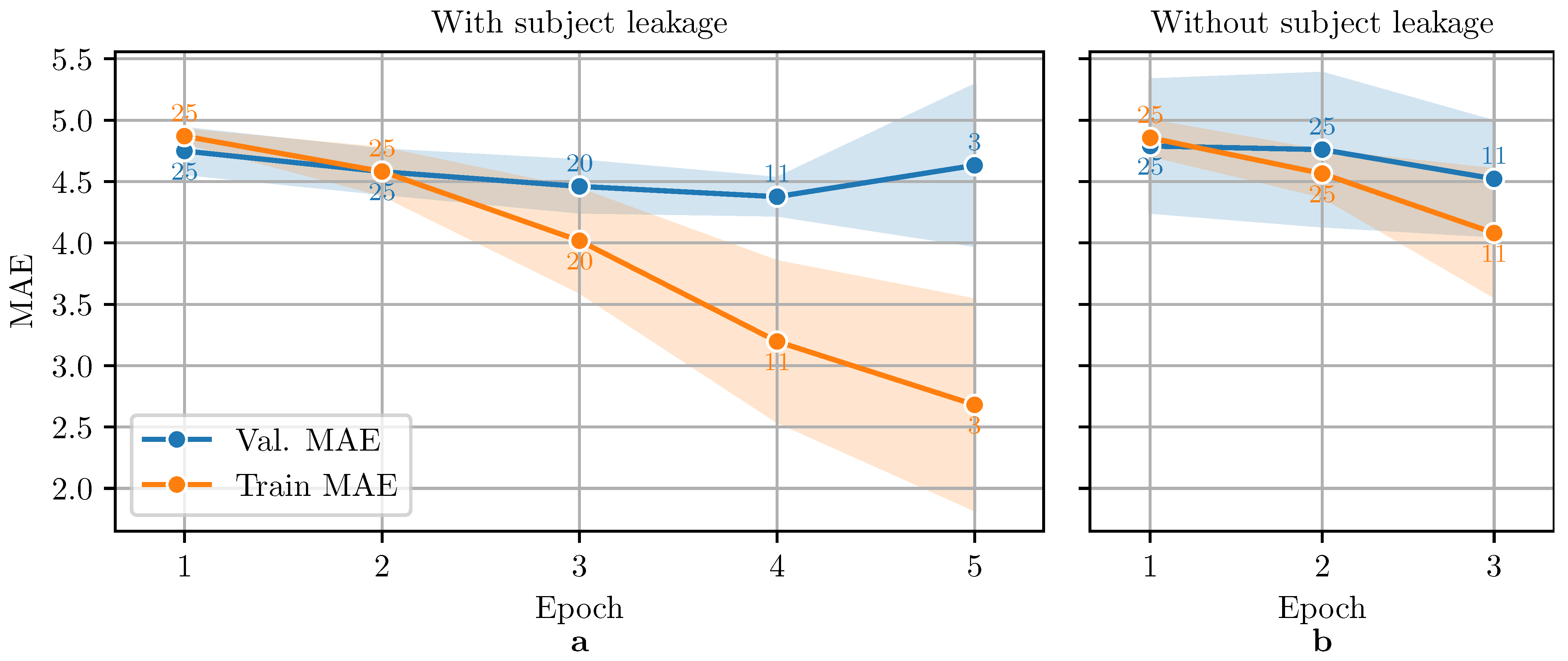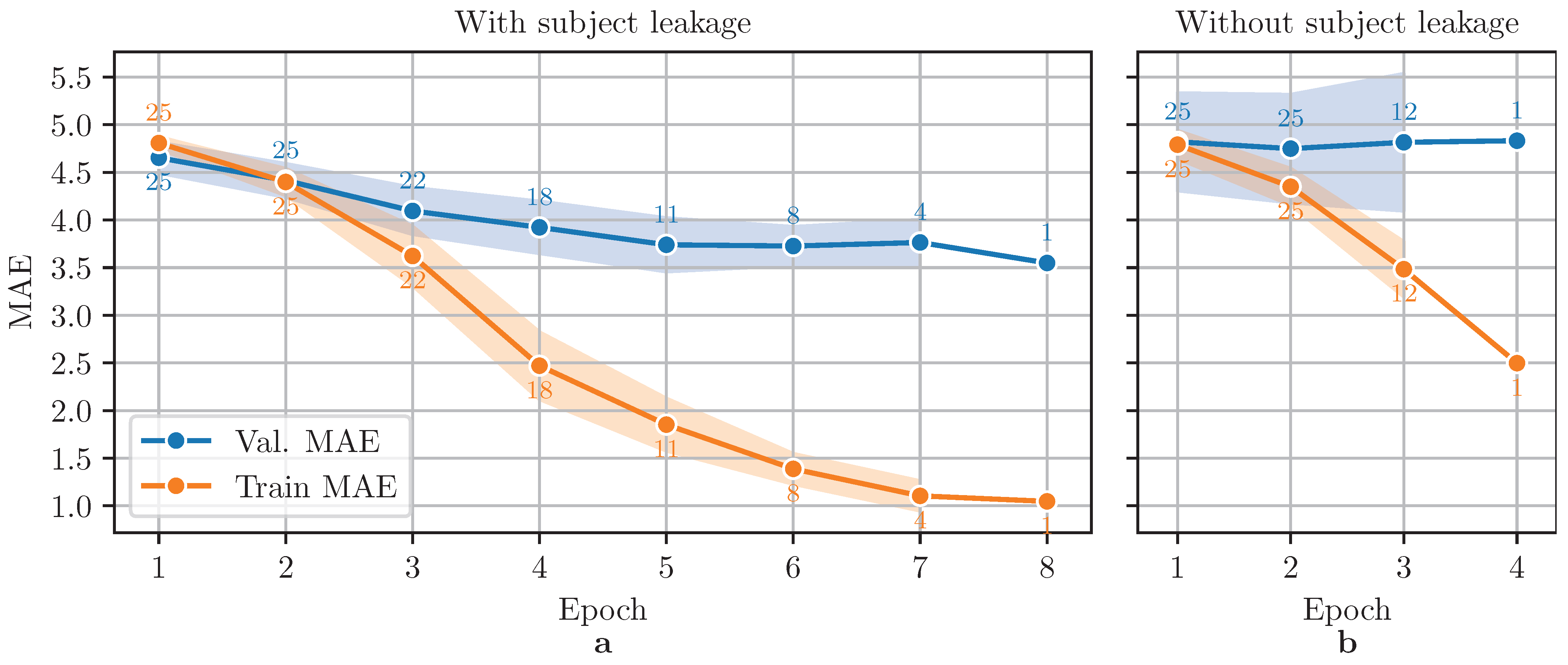 - How does subject leakage between training and evaluation partitions affect the measured performance of machine learning models?
