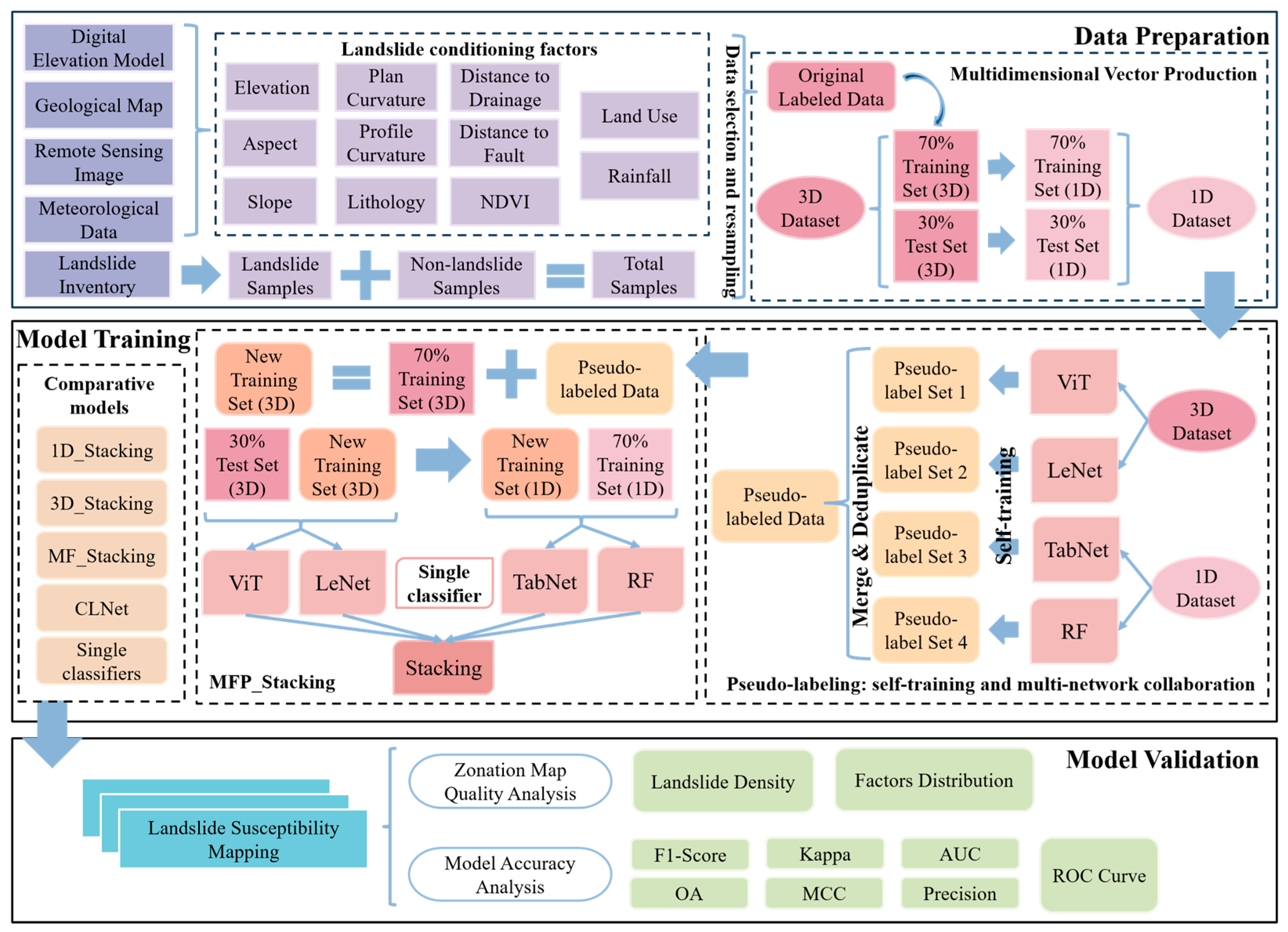 Chicago/Turabian StyleLi, Xinyu, Lina Xu, Ke Wu, Huize Liu, and Dandan Zhou. 2026. "Landslide Susceptibility Mapping Using a Stacking Model Based on Multidimensional Feature Collaboration and Pseudo-Labeling Techniques" Applied Sciences 16, no. 1: 430. https://doi.org/10.3390/app16010430