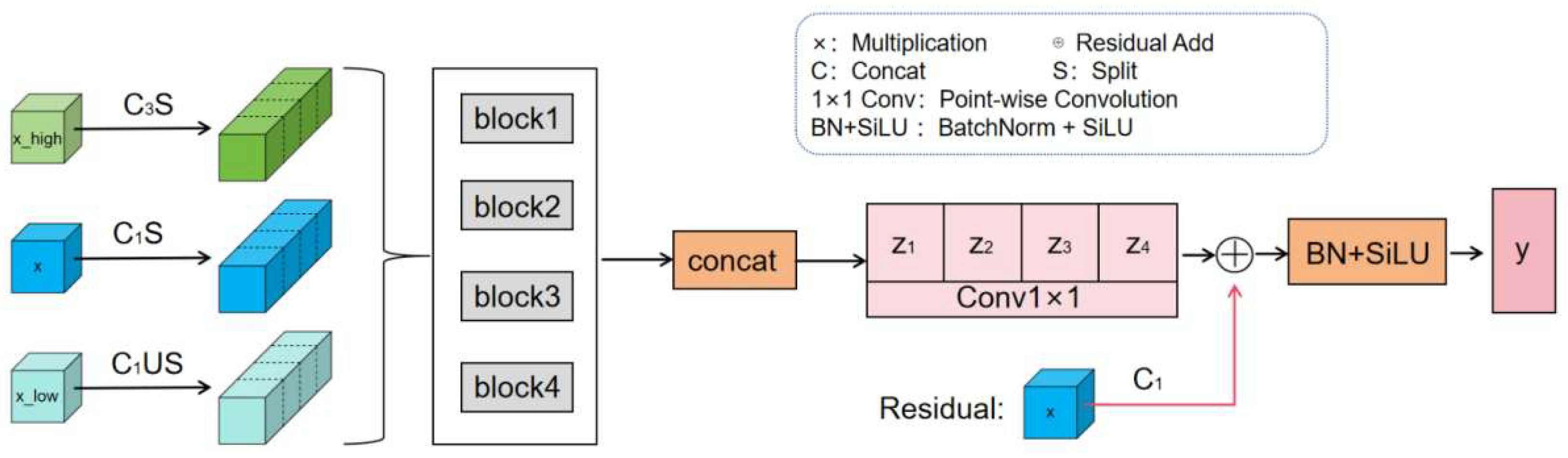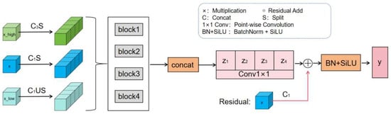 The outputs of all blocks are concatenated and then integrated through a 1 × 1 convolution, followed by adding the aligned residual features X. The final output is obtained through batch normalization (BN) and SiLU activation: