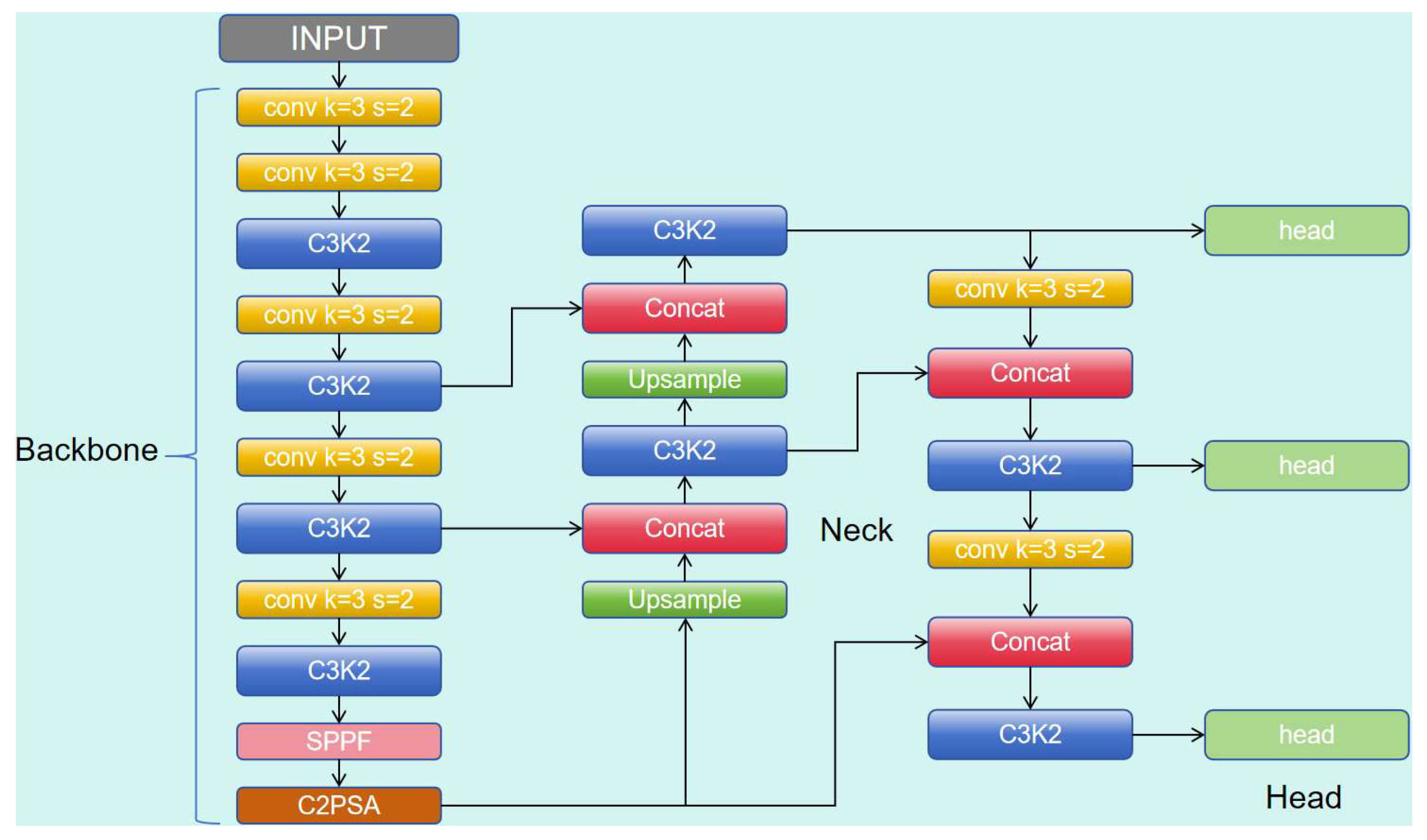 YOLOv11 serves as the baseline for our model, a high-performance detector built on a Backbone-Neck-Head architecture. As shown in Figure 1, the Backbone, inspired by CSPNet, efficiently extracts hierarchical features. The Neck adopts an enhanced FPN-PAN structure, incorporating C3k2 and C2PSA modules for effective multi-scale feature fusion. Specifically, C3k2 facilitates efficient cross-stage feature propagation, while C2PSA improves feature selectivity through a channel-to-point attention mechanism. The decoupled Head independently handles classification and bounding box regression, with optimization guided by a Task-Aligned Assigner during training.