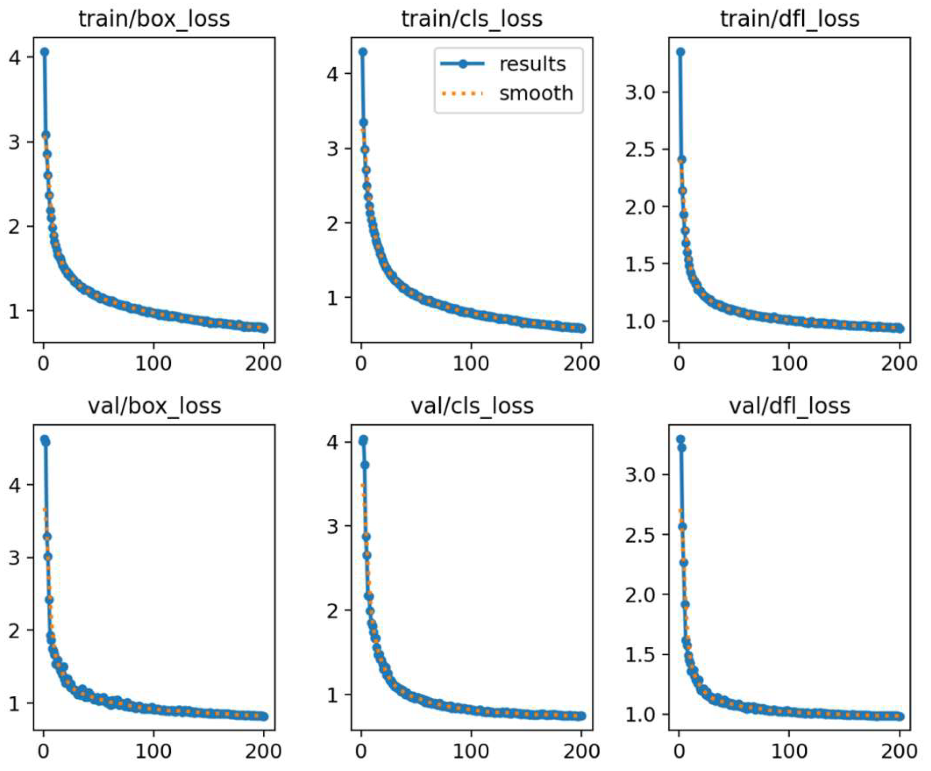 As shown in Figure 4, during the model training process, we closely monitored the trends of the bounding box loss (box_loss), classification loss (cls_loss), and distributed focal loss (dfl_loss). All loss components exhibited a steady decline throughout the training, indicating that the model effectively learned the underlying features of the data and gradually optimized its parameters to minimize the losses. This smooth downward trend reflects the model’s progression toward the optimal solution, without any noticeable oscillations or instability.