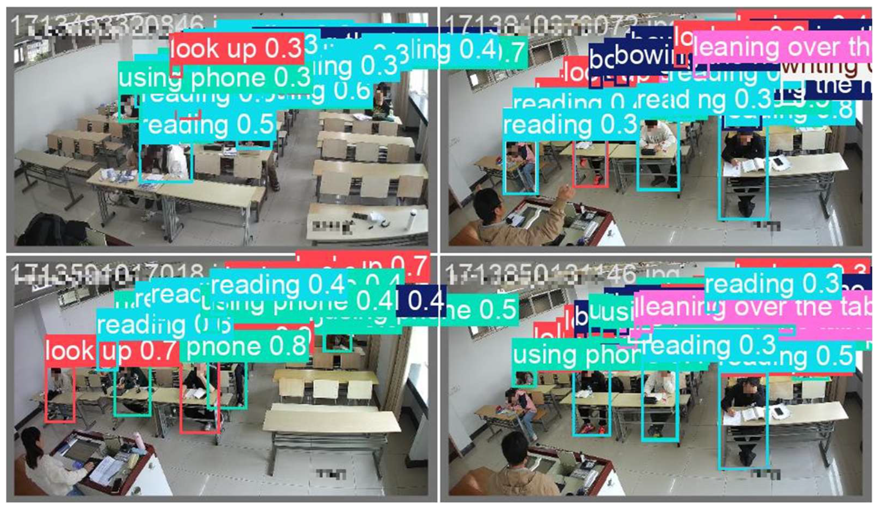 Annotation Process: A team of three annotators performed the labeling tasks following a standardized annotation protocol. A detailed annotation guideline was established to ensure consistency and accuracy. Key criteria for distinguishing similar behaviors included: ‘Reading’: Defined by the clear presence of a book or tablet held in the student’s hands. ‘Writing’: Required the visible presence of a pen or pencil and a notebook or paper on the desk. ‘Bowing the head’ vs. ‘Leaning over the table’: Distinguished primarily by the degree of torso inclination and the proximity of the head to the desk surface, with the latter indicating a more pronounced forward bend [16,17].