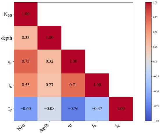 In this study, the linear association strengths between each feature (depth, qt, fs, and Ic) and the N60 value were systematically evaluated. Pearson correlation analyses revealed that qt exhibited a correlation coefficient of 0.73 with N60, indicating a significant linear correlation (|r| > 0.7). In contrast, Ic and fs demonstrated moderate linear correlations with N60, respectively (r = −0.60 and r = 0.55, respectively; 0.5 ≤ |r| < 0.7). Further analyses identified a strong negative correlation between qt and Ic (r = −0.76) and a strong positive correlation between qt and fs (r = 0.71). This implies that including qt, Ic, and fs simultaneously as input variables in subsequent linear regression model construction would cause severe multicollinearity, as the information contained in Ic and fs is largely represented by qt, resulting in a high degree of overlap in the information among them. Consequently, it becomes difficult to identify the independent contribution of each variable, leading to inaccurate coefficient estimation.