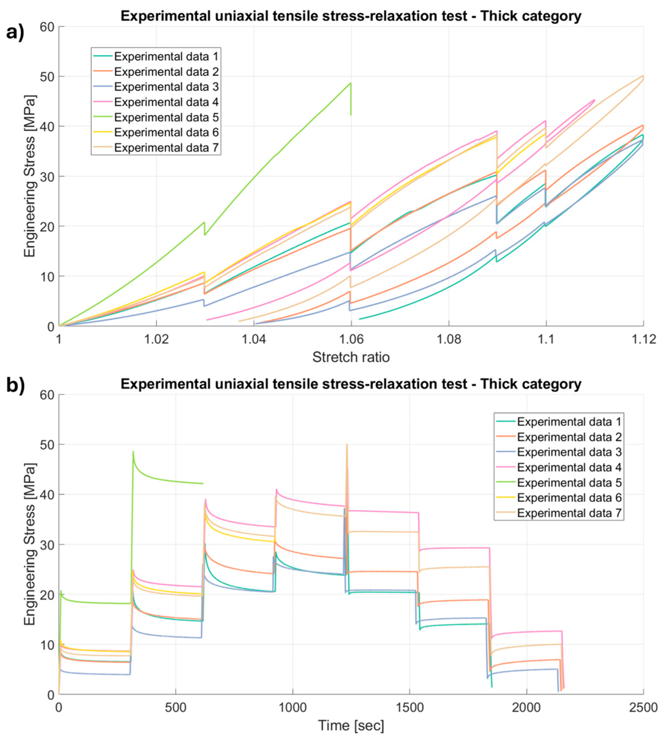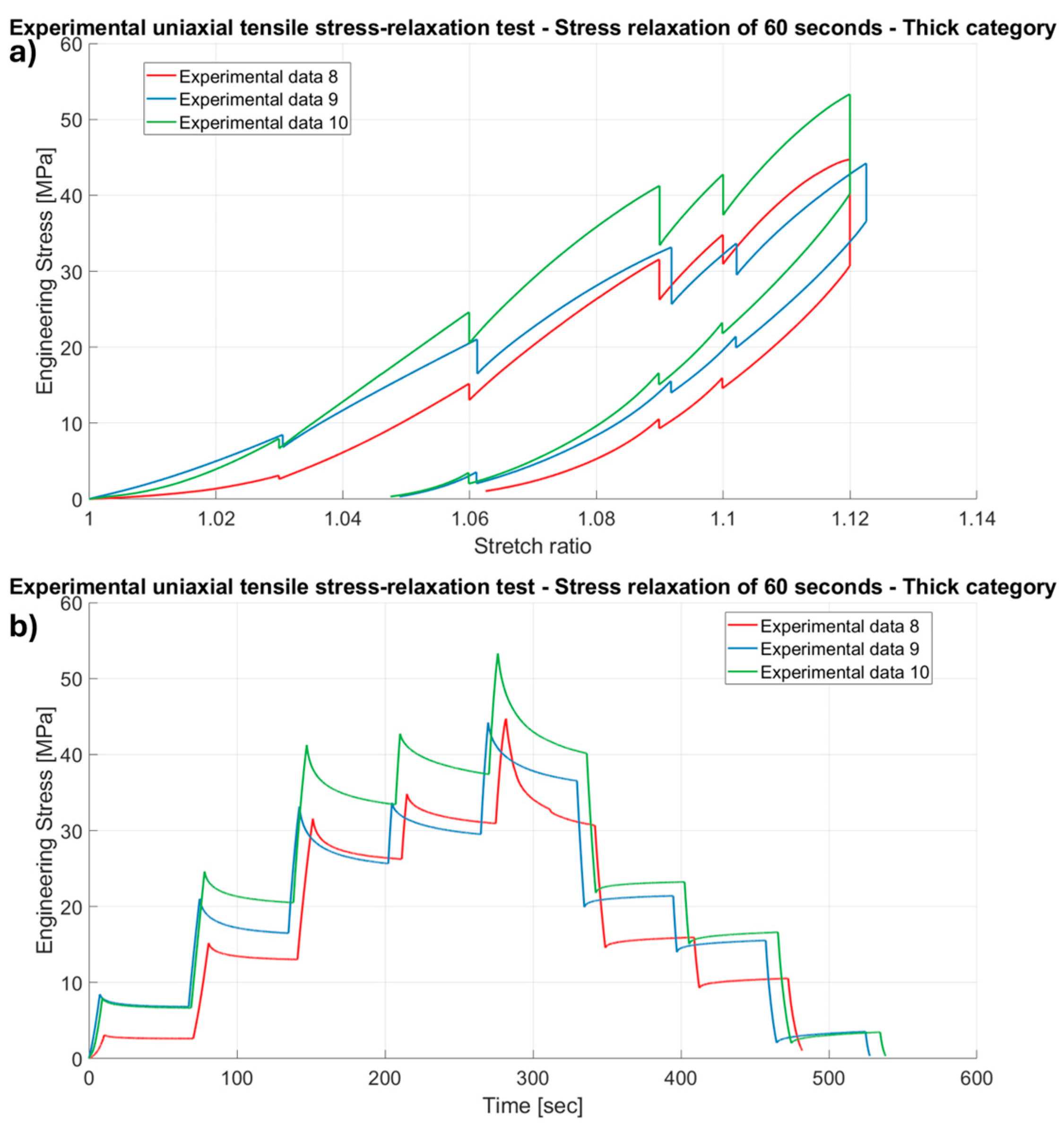 Results of the experimental uniaxial tensile stress-relaxation tests on porcine FDS tendons classified in the “Thick” category, with a relaxation time of 60 s, (a) Stretch ratio vs. Engineering Stress and (b) Time vs. Engineering Stress.