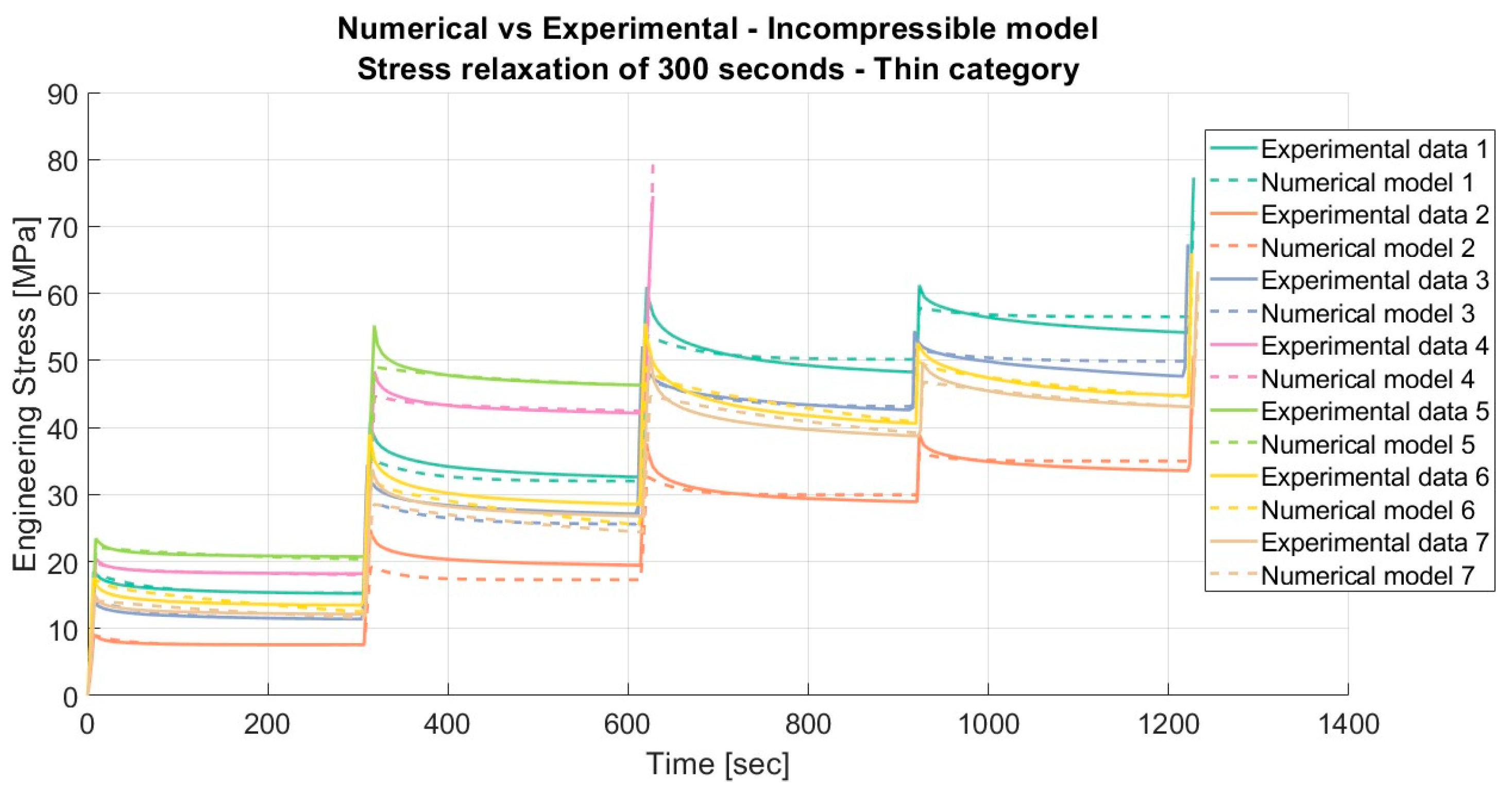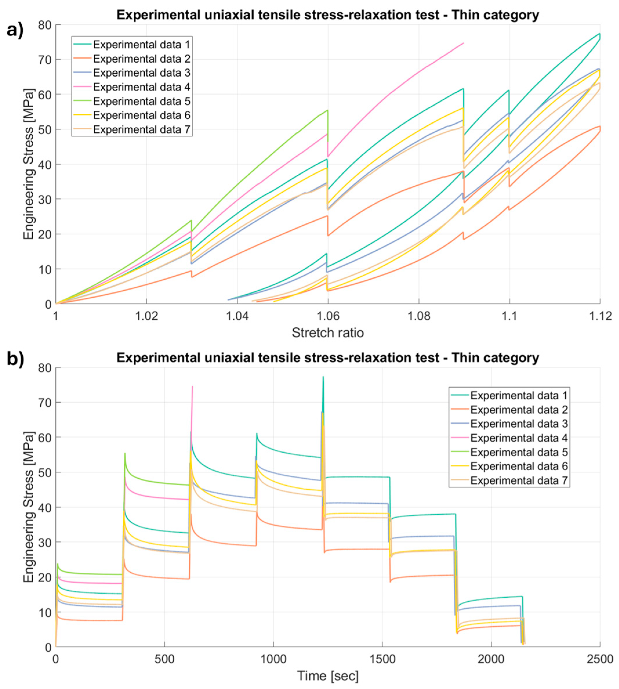 Results of the experimental uniaxial tensile stress-relaxation tests on porcine FDS tendons classified in the “Thin” category, with a relaxation time of 300 s, (a) Stretch ratio vs. Engineering Stress and (b) Time vs. Engineering Stress.