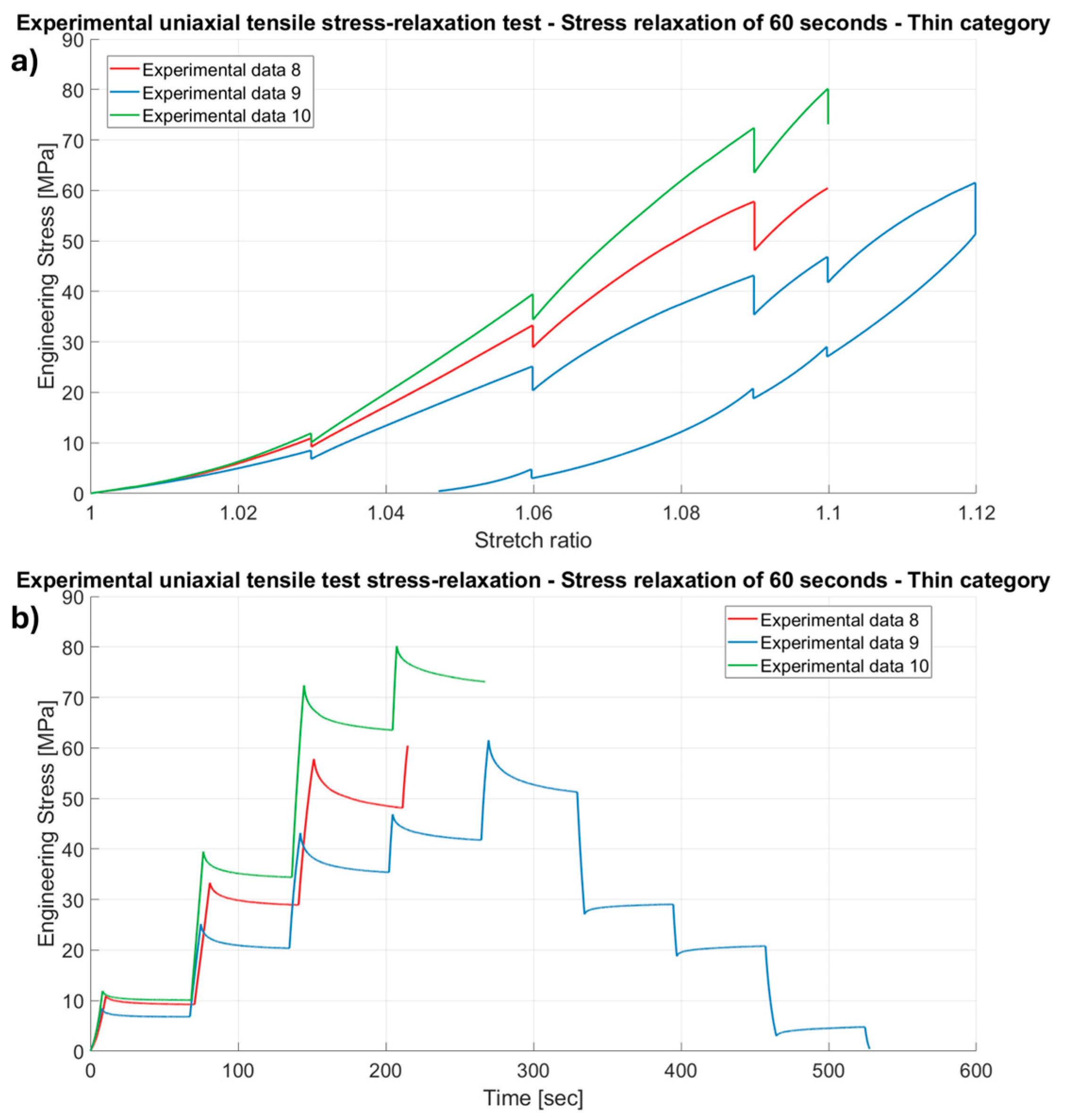 Results of the experimental uniaxial tensile stress-relaxation tests on porcine FDS tendons classified in the “Thin” category, with a relaxation time of 60 s, (a) Stretch ratio vs. Engineering Stress and (b) Time vs. Engineering Stress.