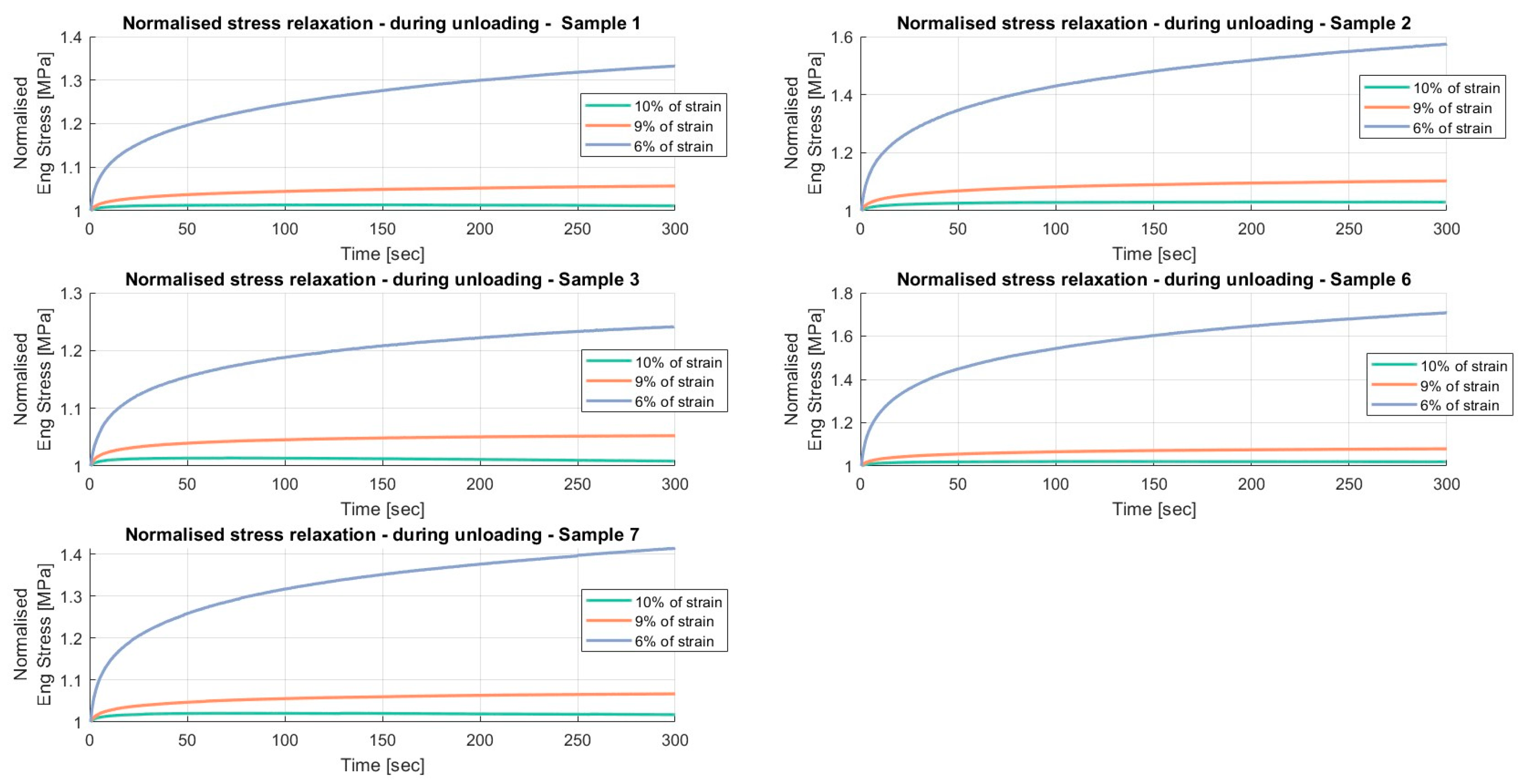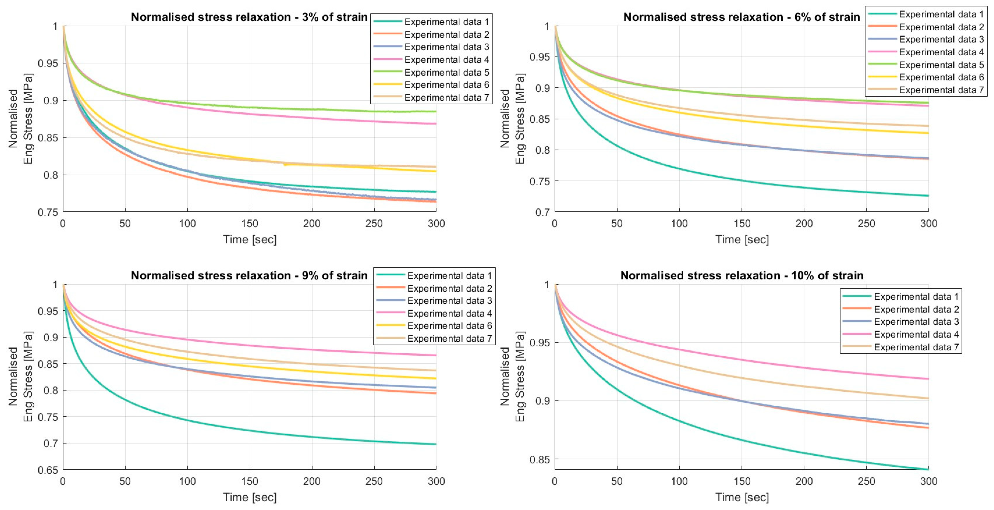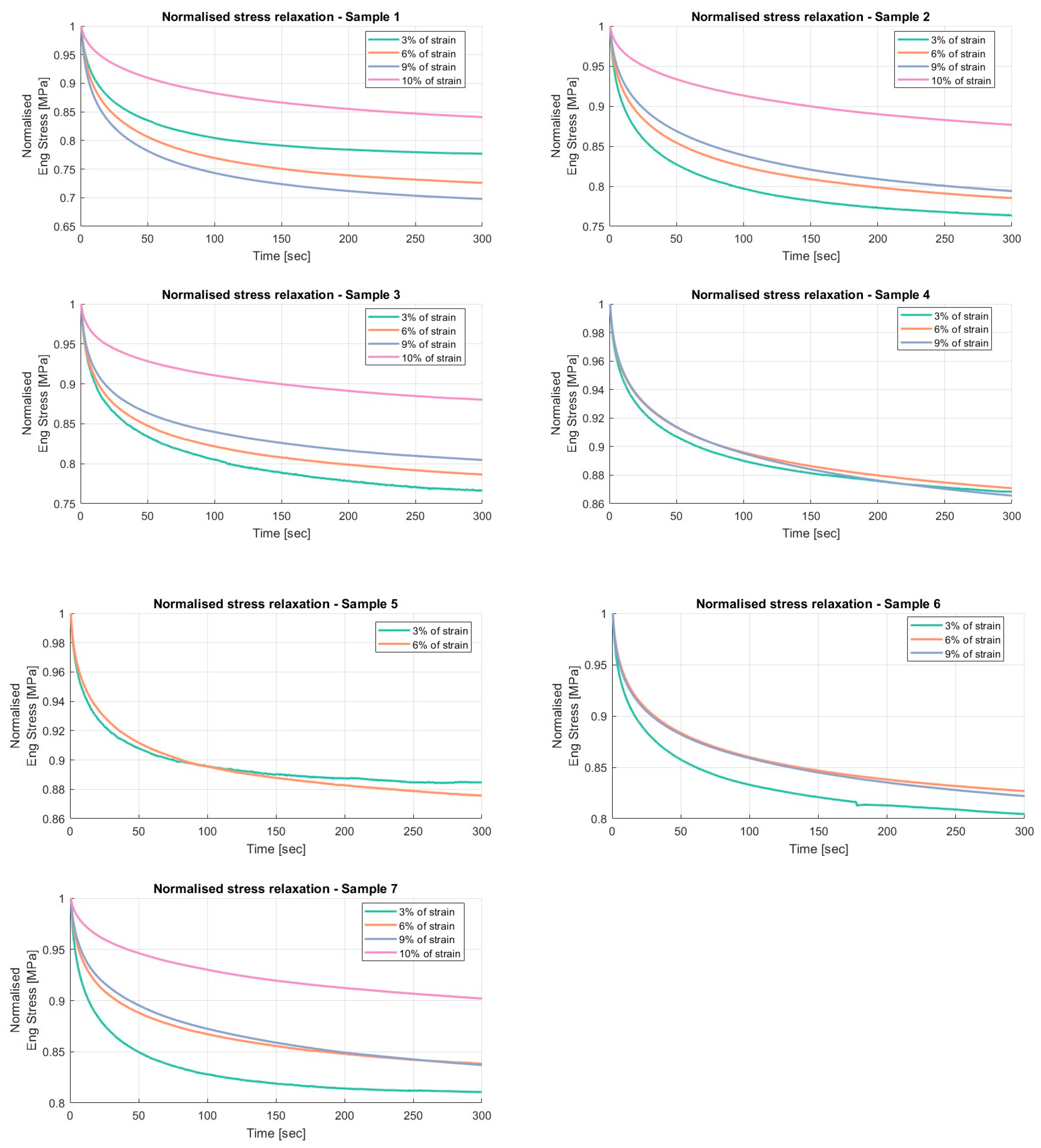 Results of the relaxation segments, during the loading phase, on porcine FDS tendons classified in the “Thin” category, with a relaxation time of 300 s. In each graph, the same normalised relaxation segment for all specimens is reported.