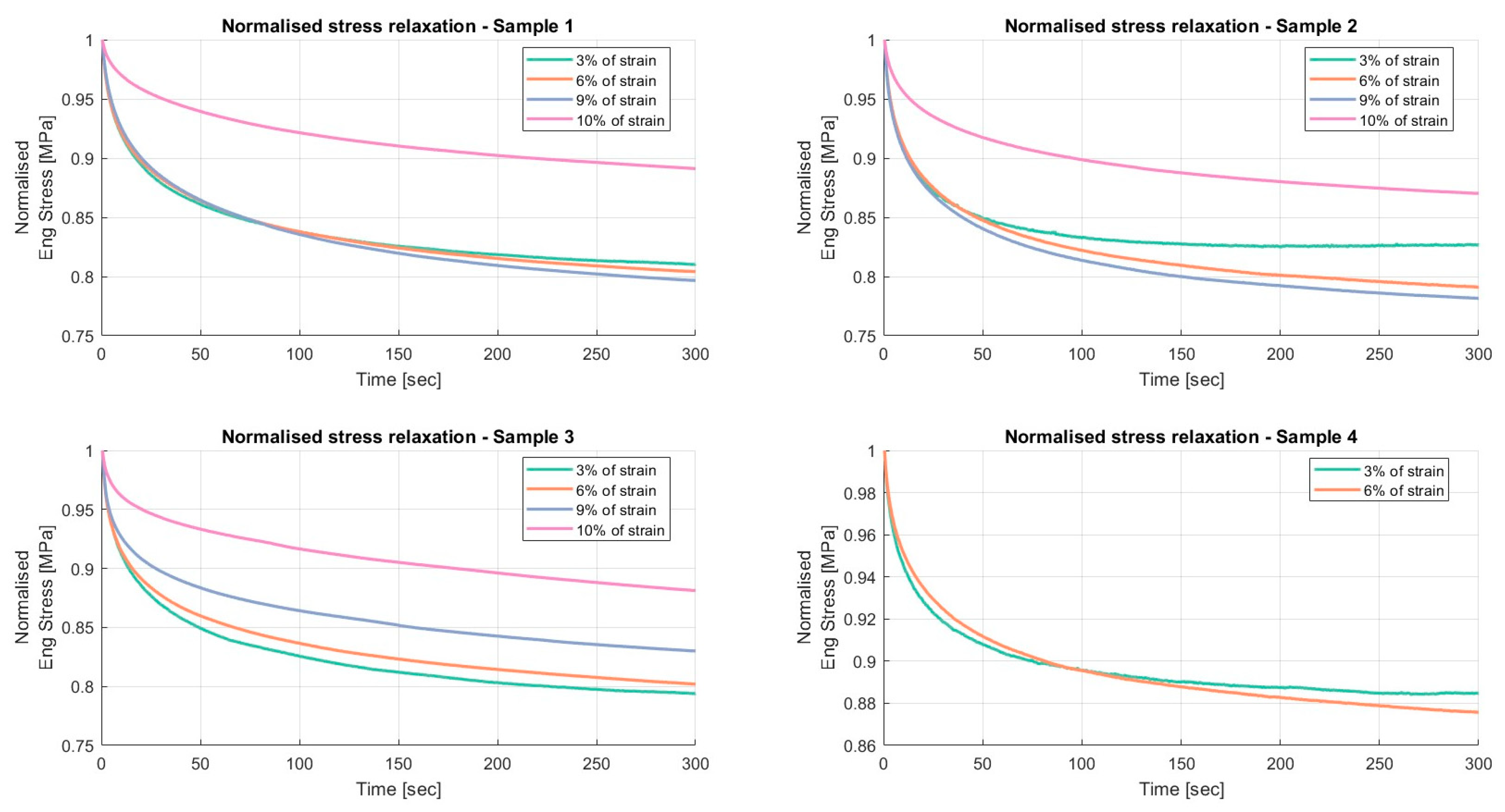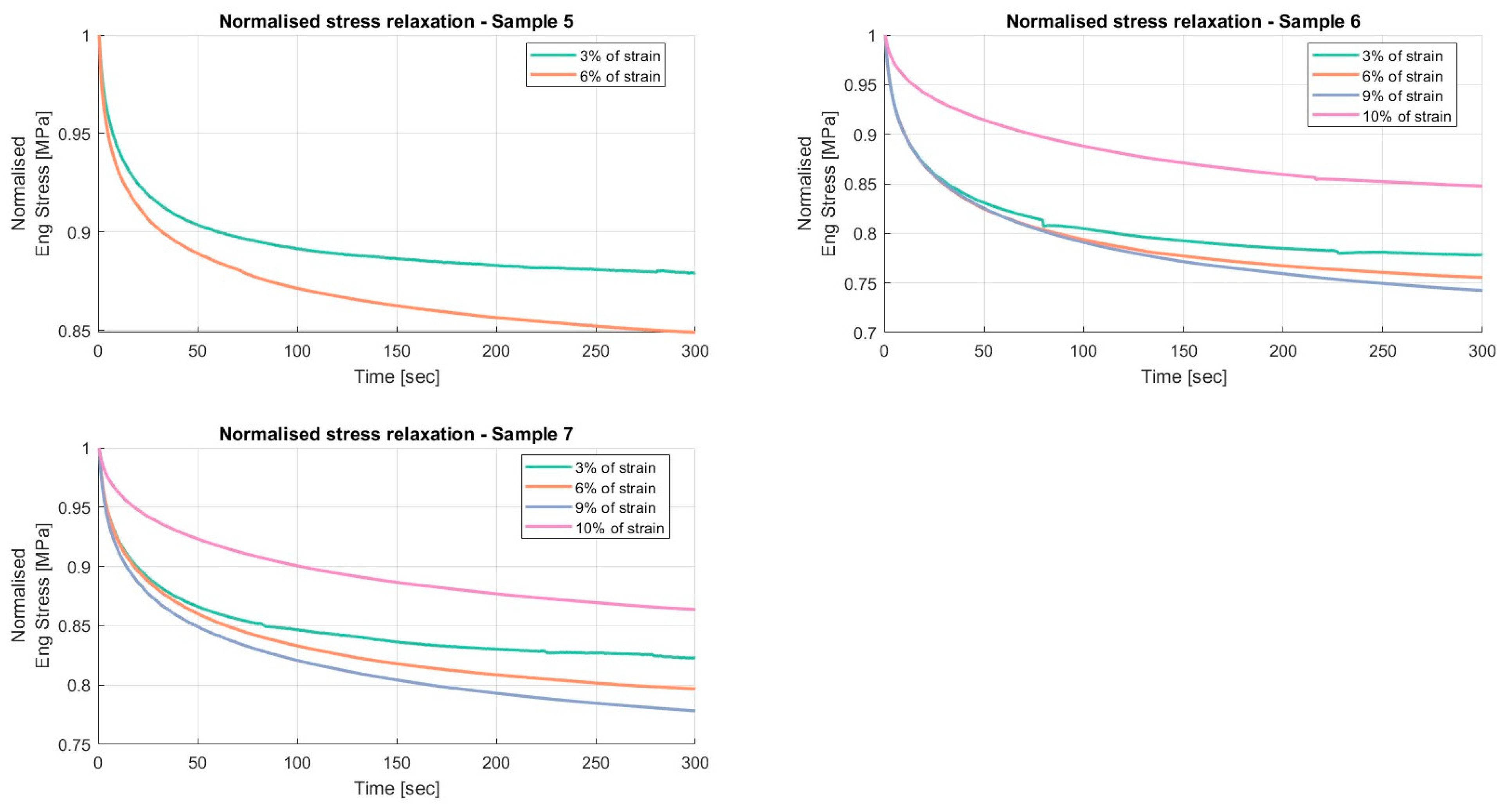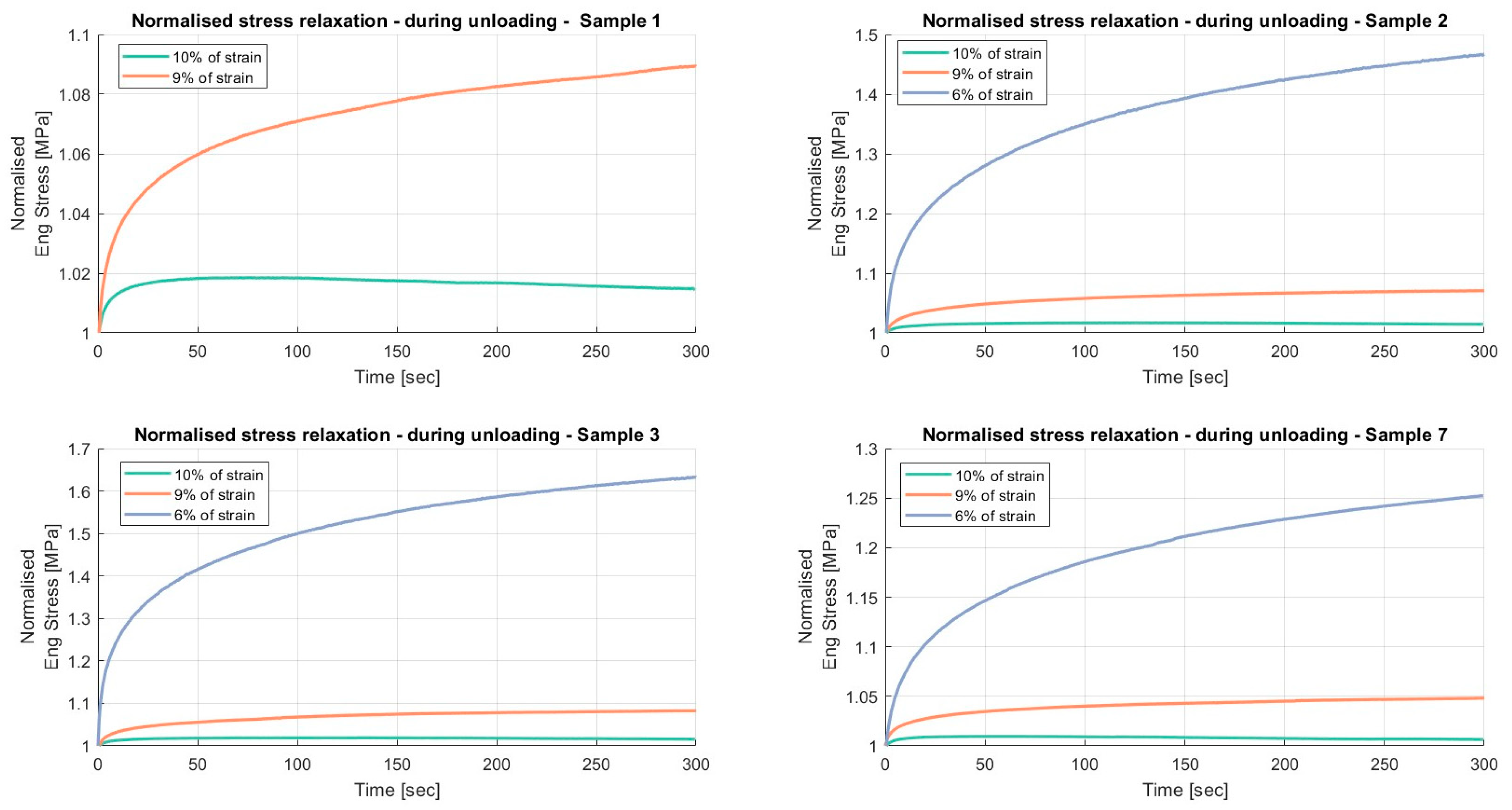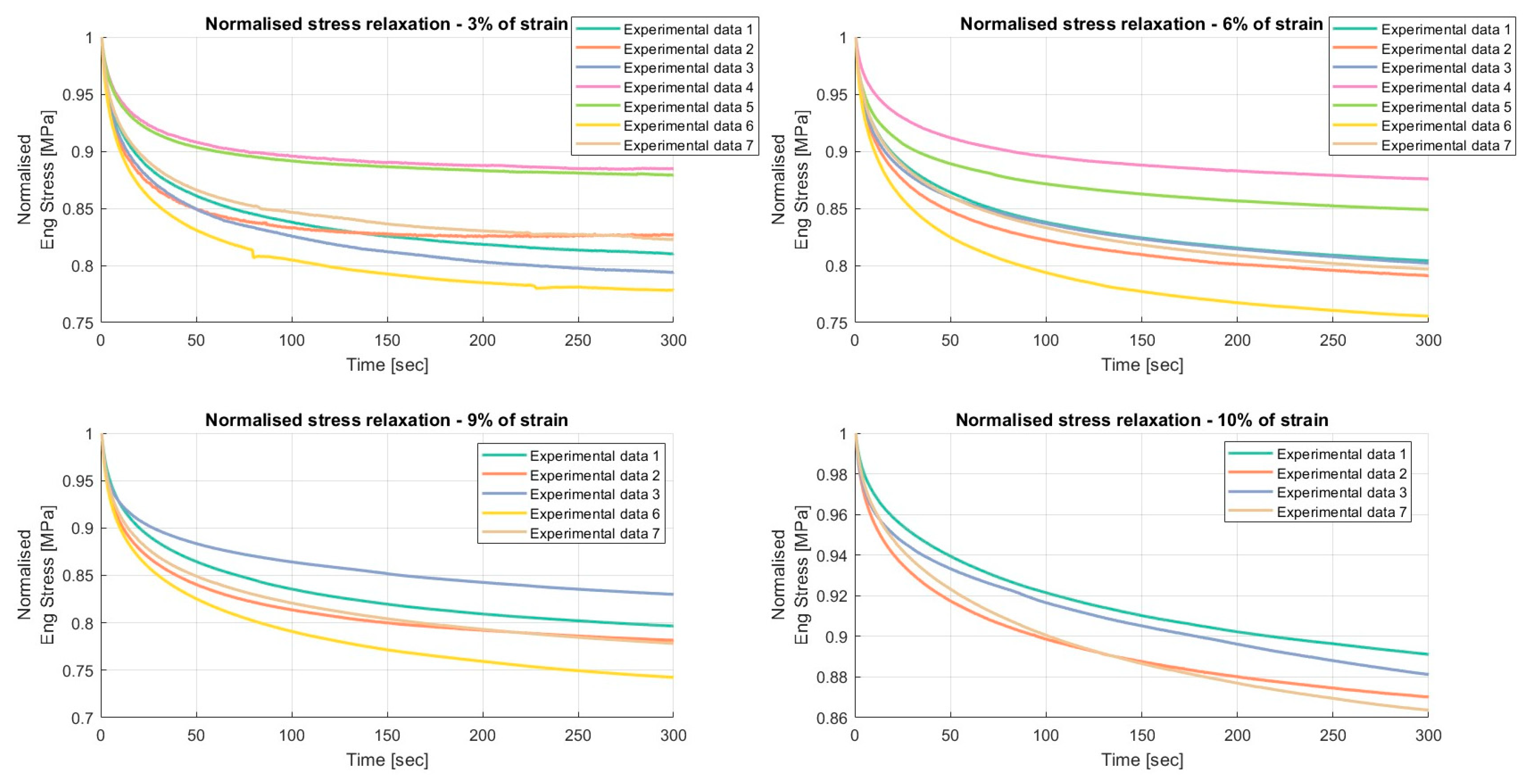 Results of the relaxation segments, during the loading phase, on porcine FDS tendons classified in the “Thin” category, with a relaxation time of 300 s. In each graph, the same normalised relaxation segment for all specimens is reported.