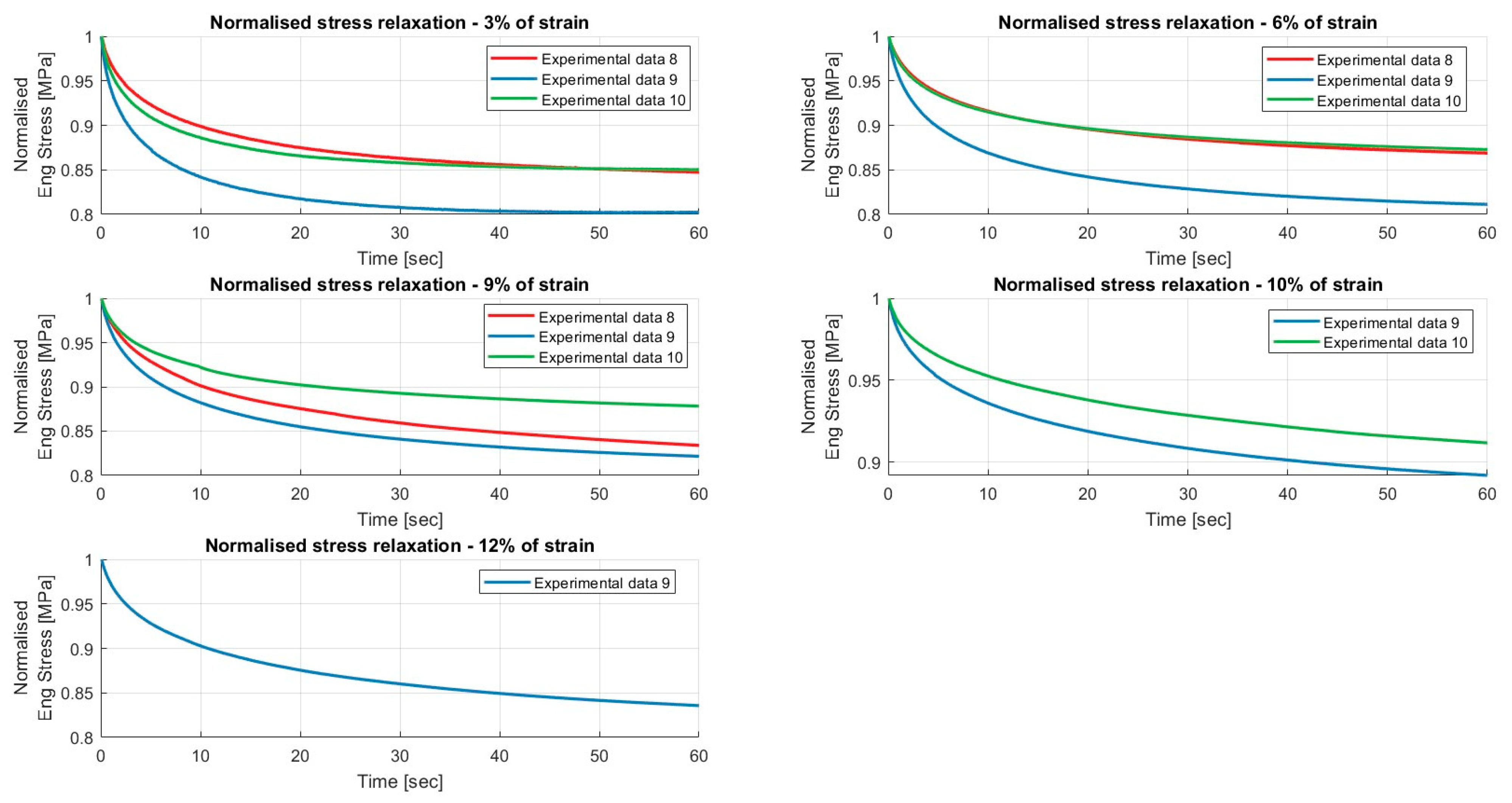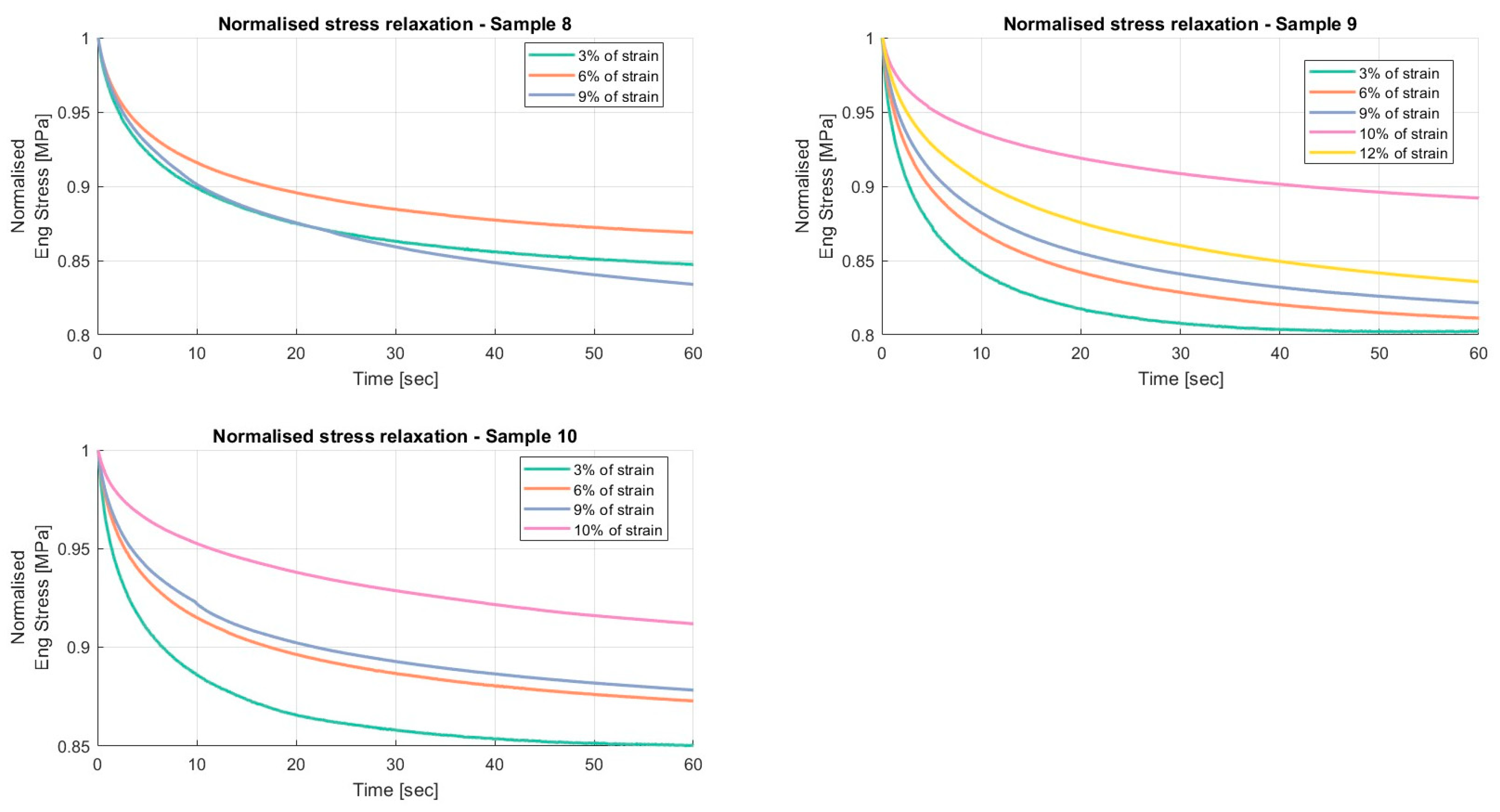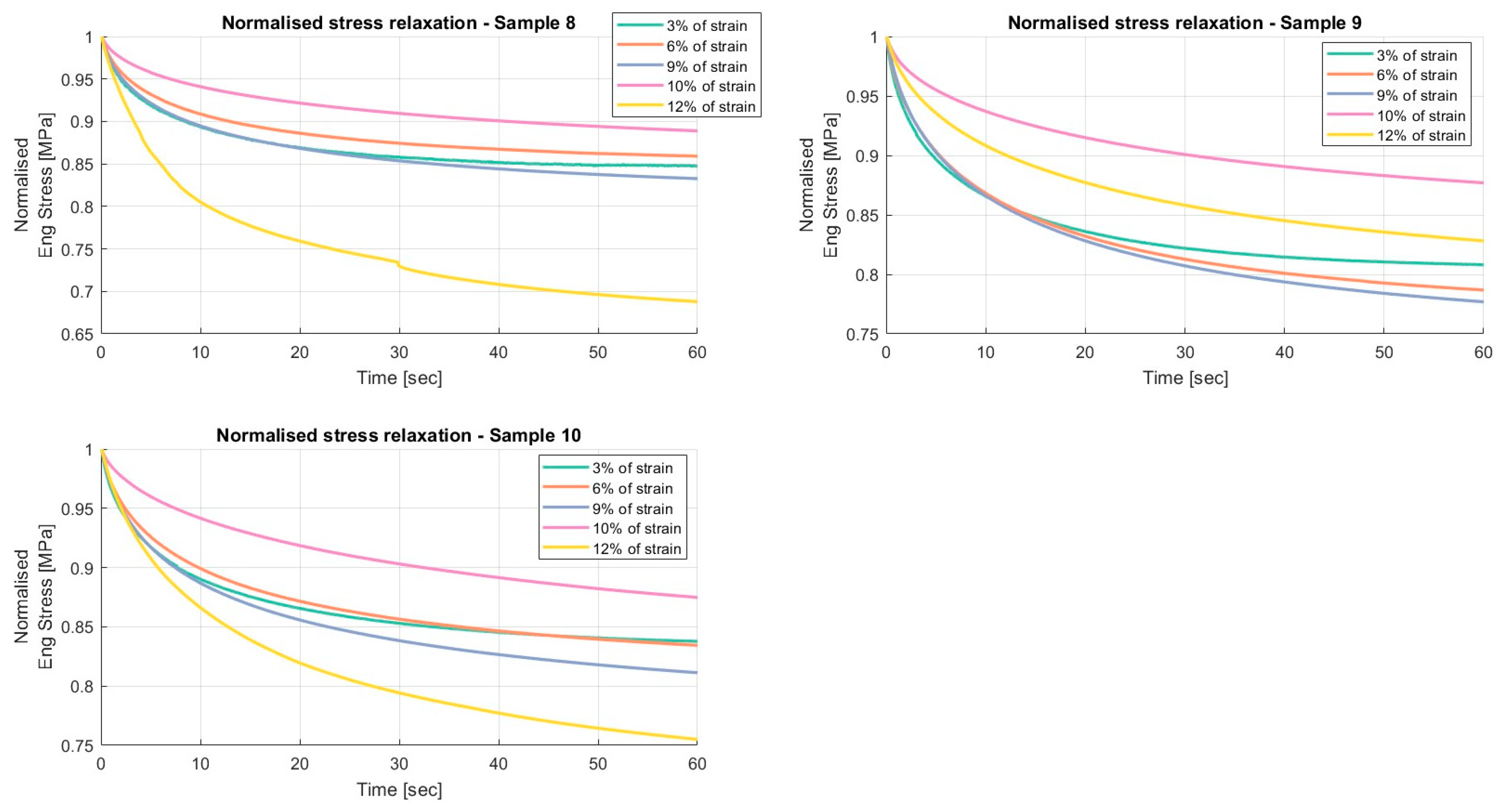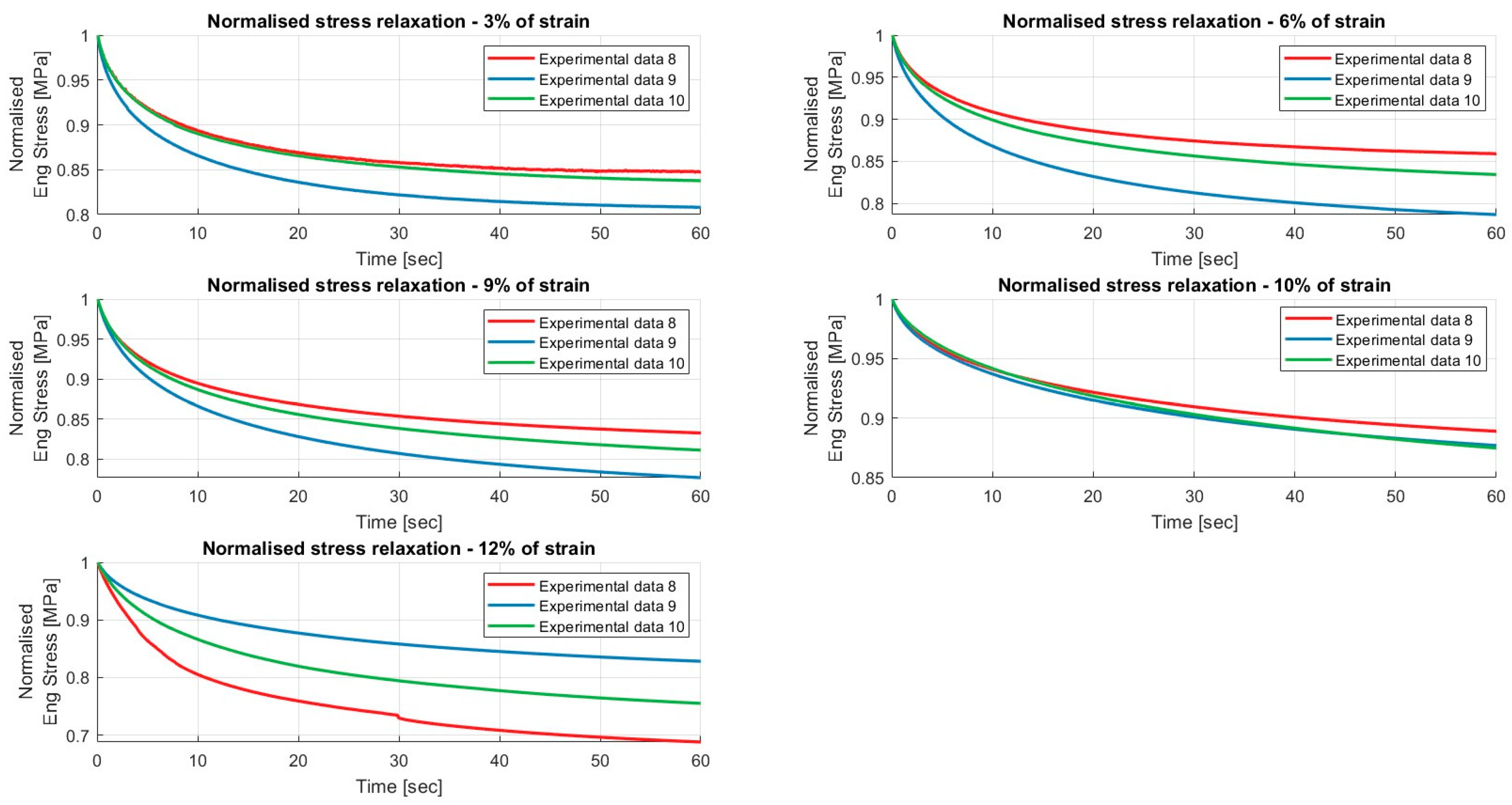 Results of the relaxation segments, during the loading phase, on porcine FDS tendons classified in the “Thin” category, with a relaxation time of 60 s. In each graph, the same normalised relaxation segment for all specimens is reported.