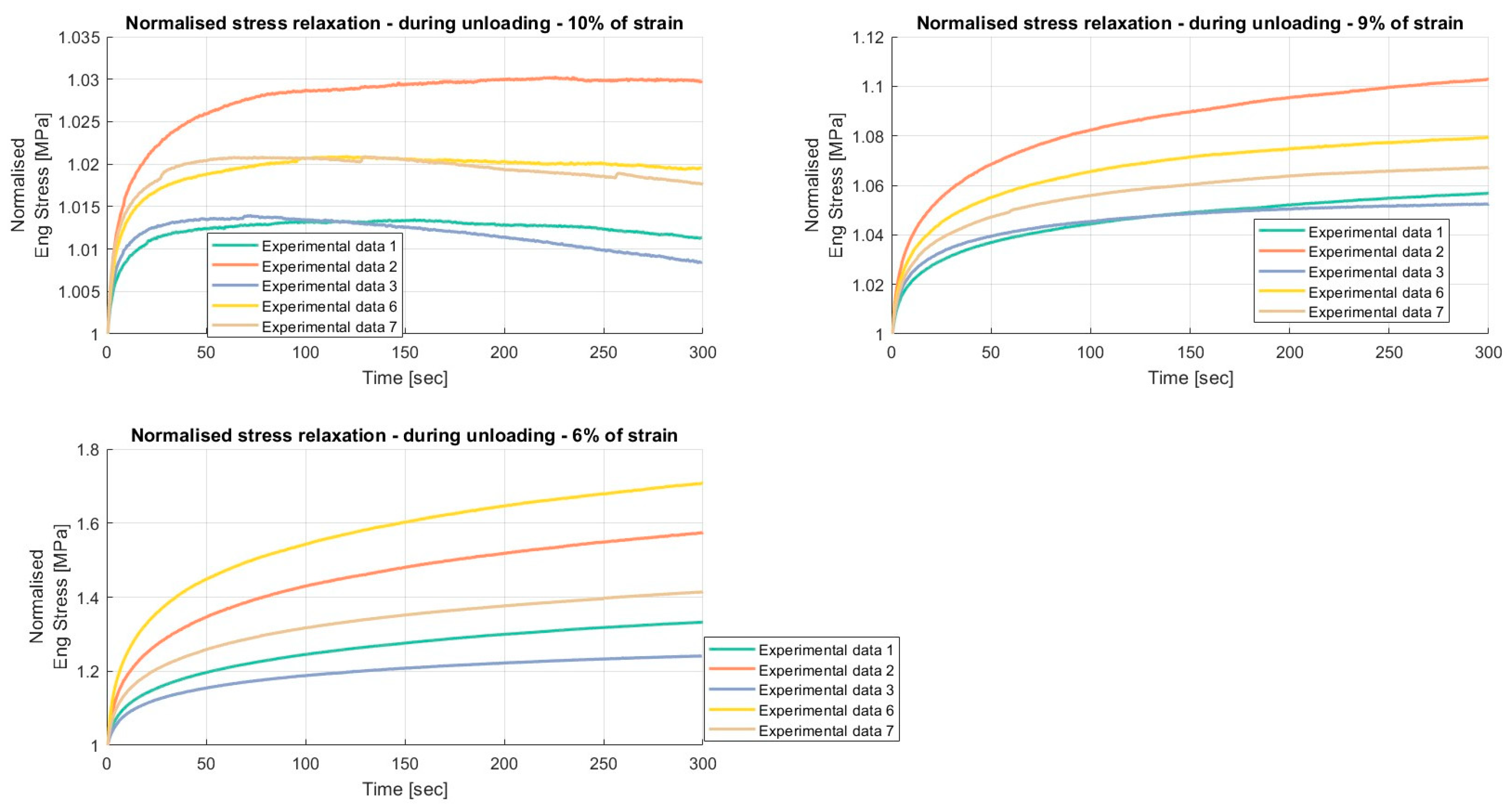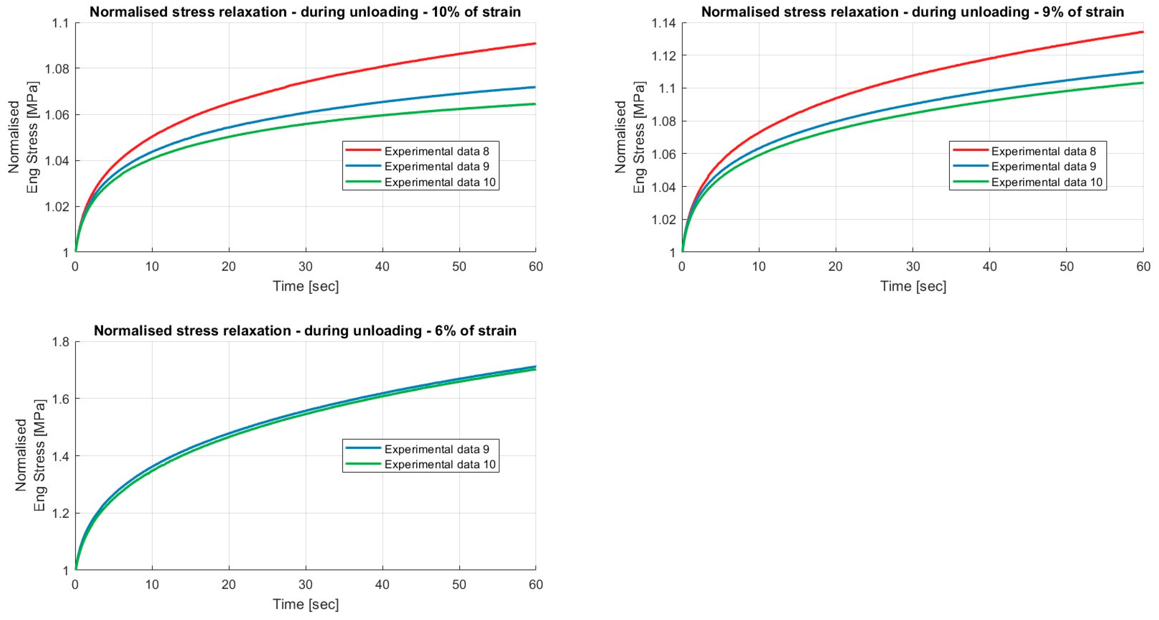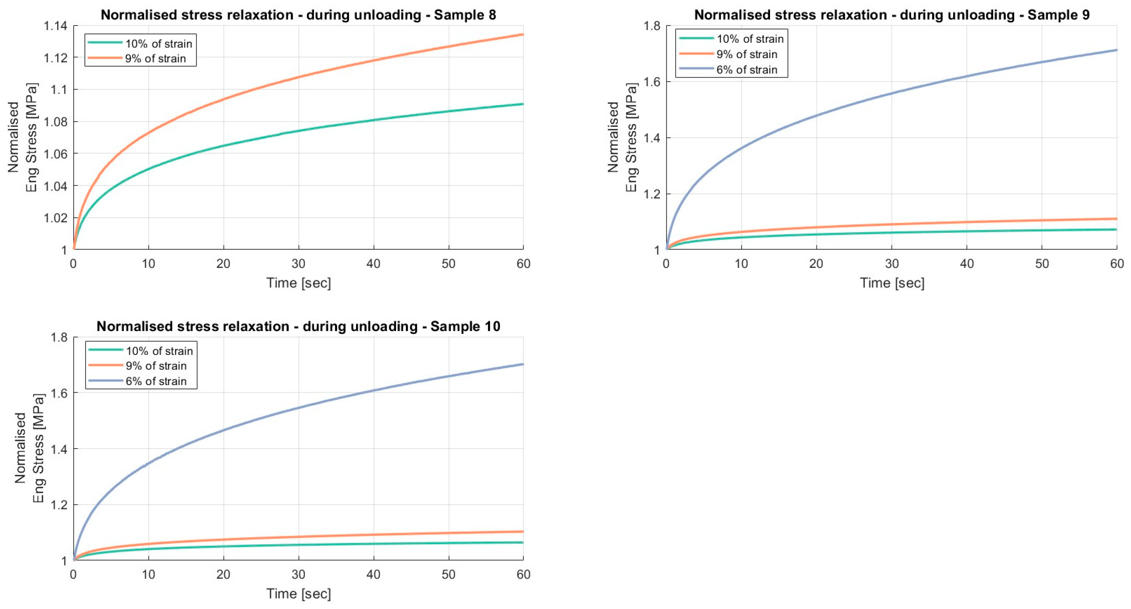 Results of the relaxation segments, during the unloading phase, on porcine FDS tendons classified in the “Thin” category, with a relaxation time of 60 s. In each graph, the same normalised relaxation segment for all specimens is reported.
