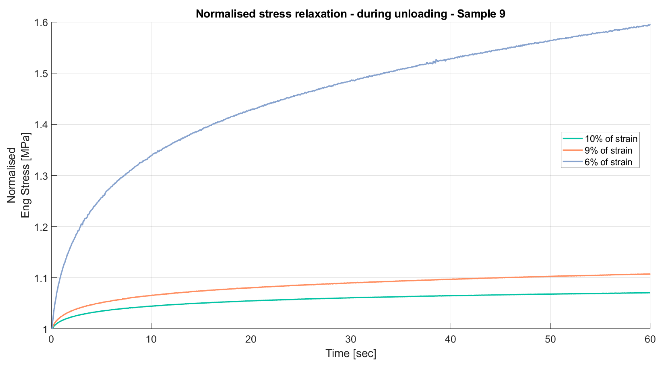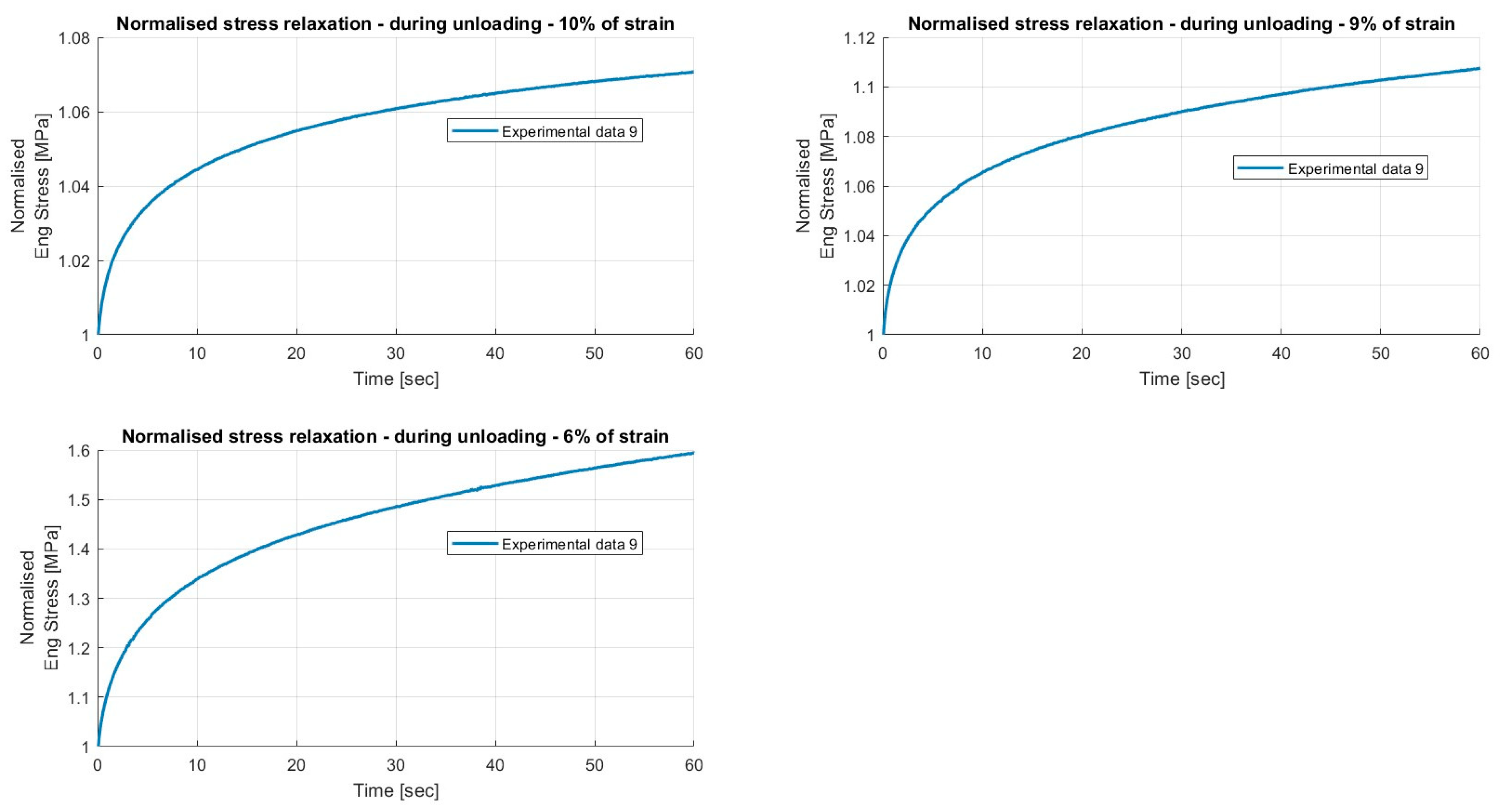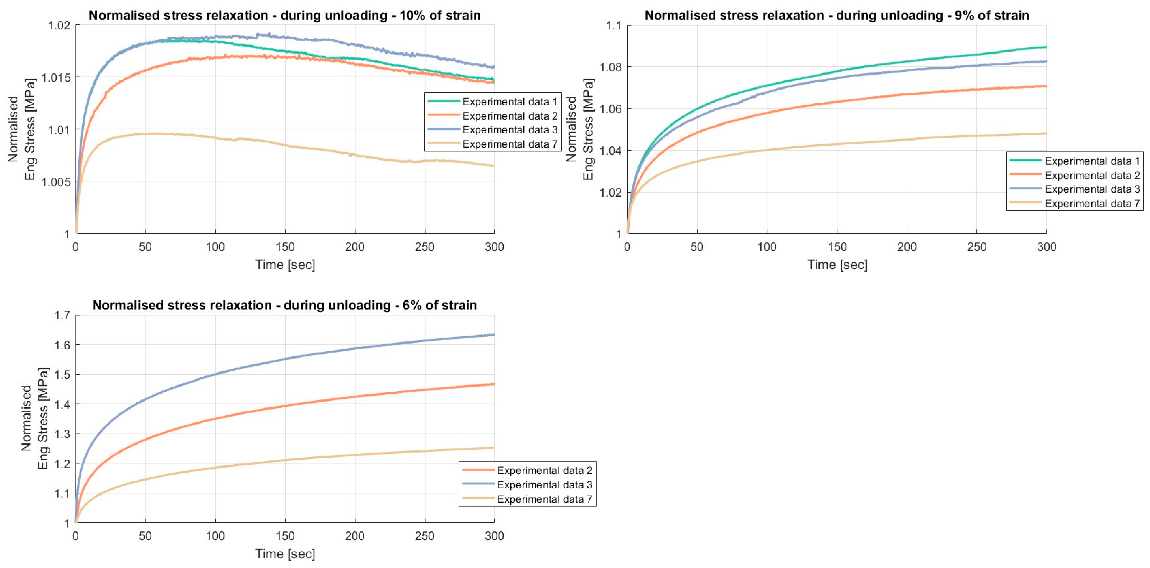 Results of the relaxation segments, during the unloading phase, on porcine FDS tendons classified in the “Thin” category, with a relaxation time of 60 s. In each graph, the same normalised relaxation segment for all specimens is reported.