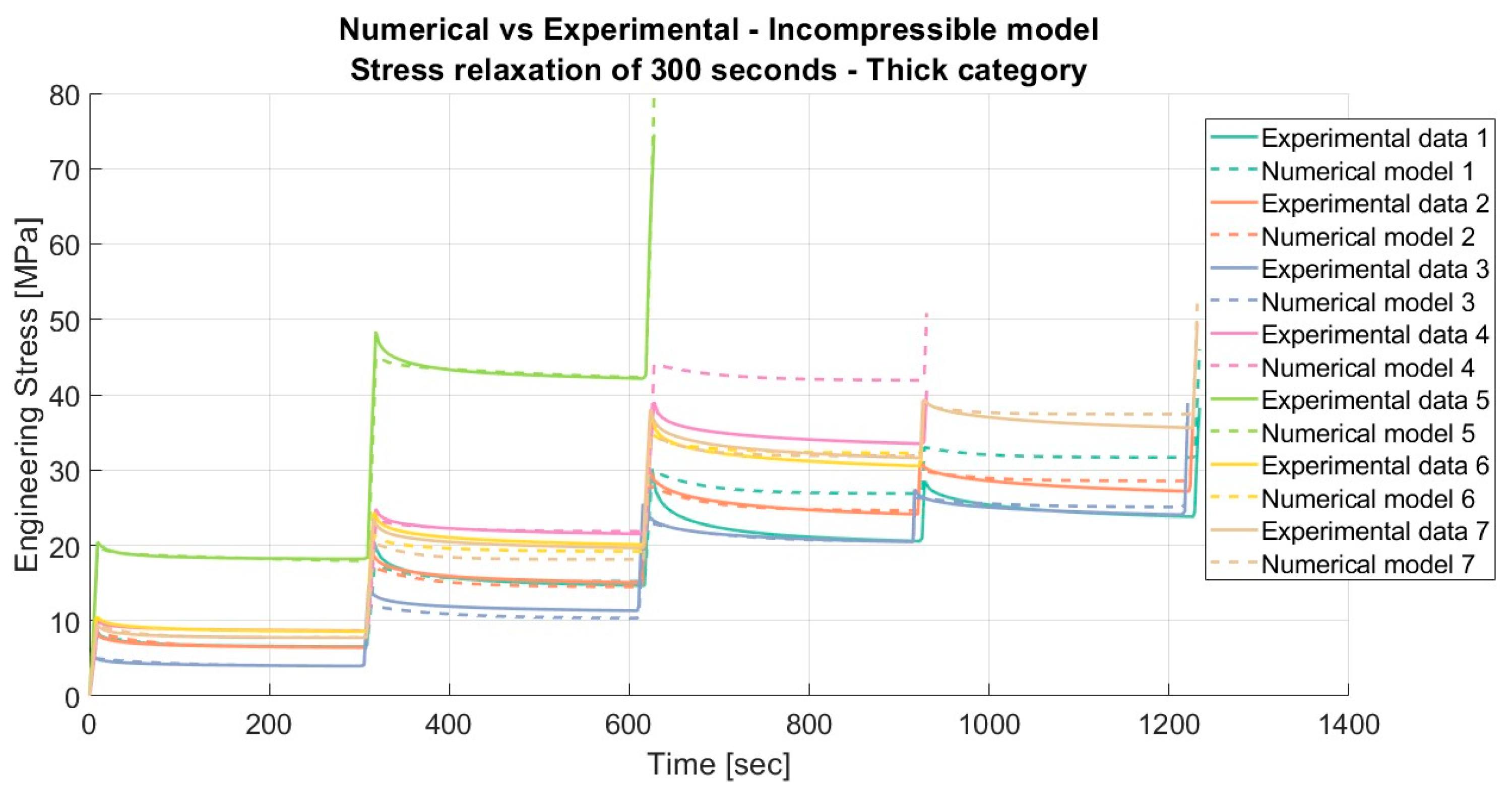 Results of the relaxation segments, during the loading phase, on porcine FDS tendons classified in the “Thick” category, with a relaxation time of 300 s. In each graph, the same normalised relaxation segment for all specimens is reported.