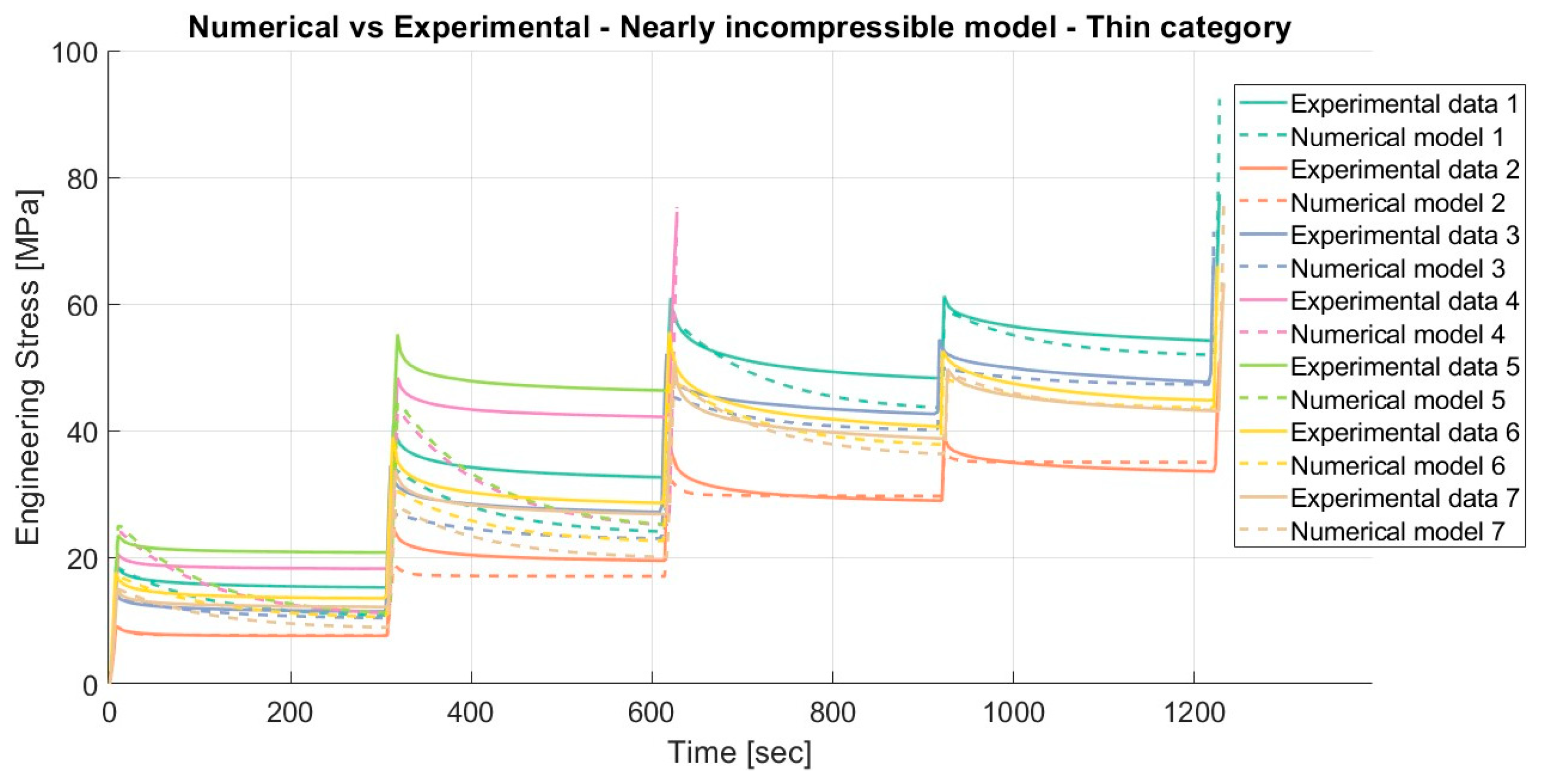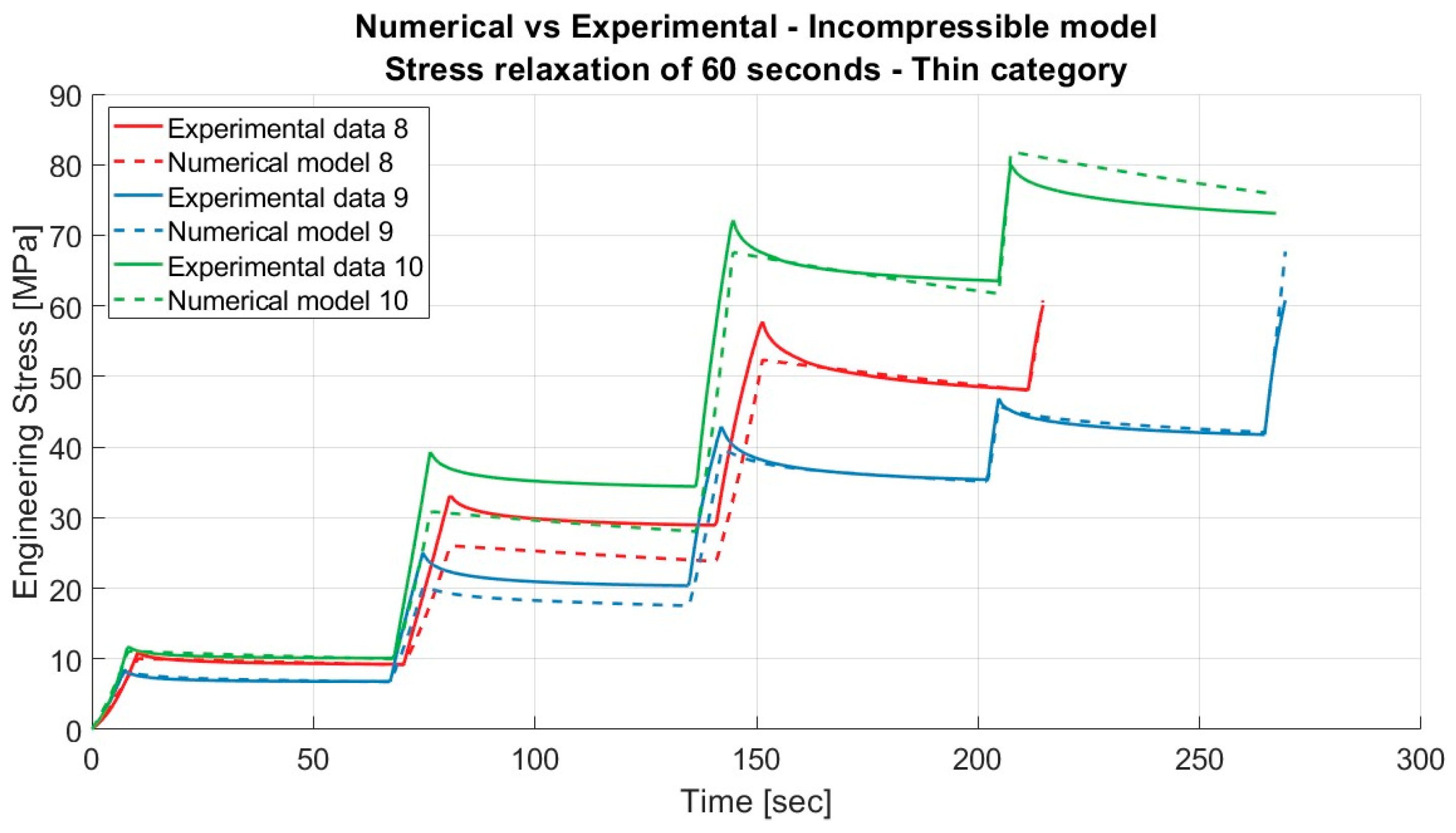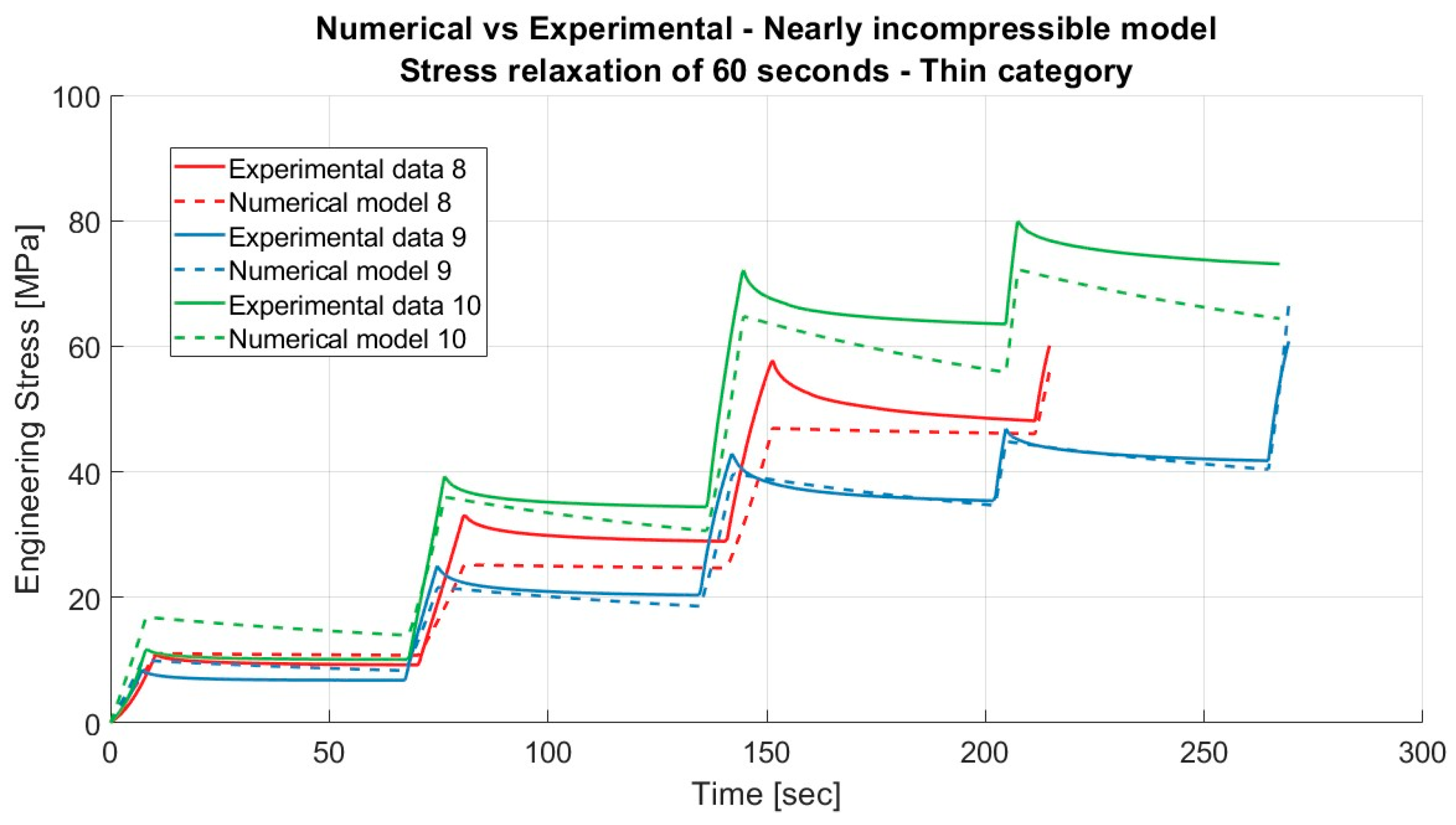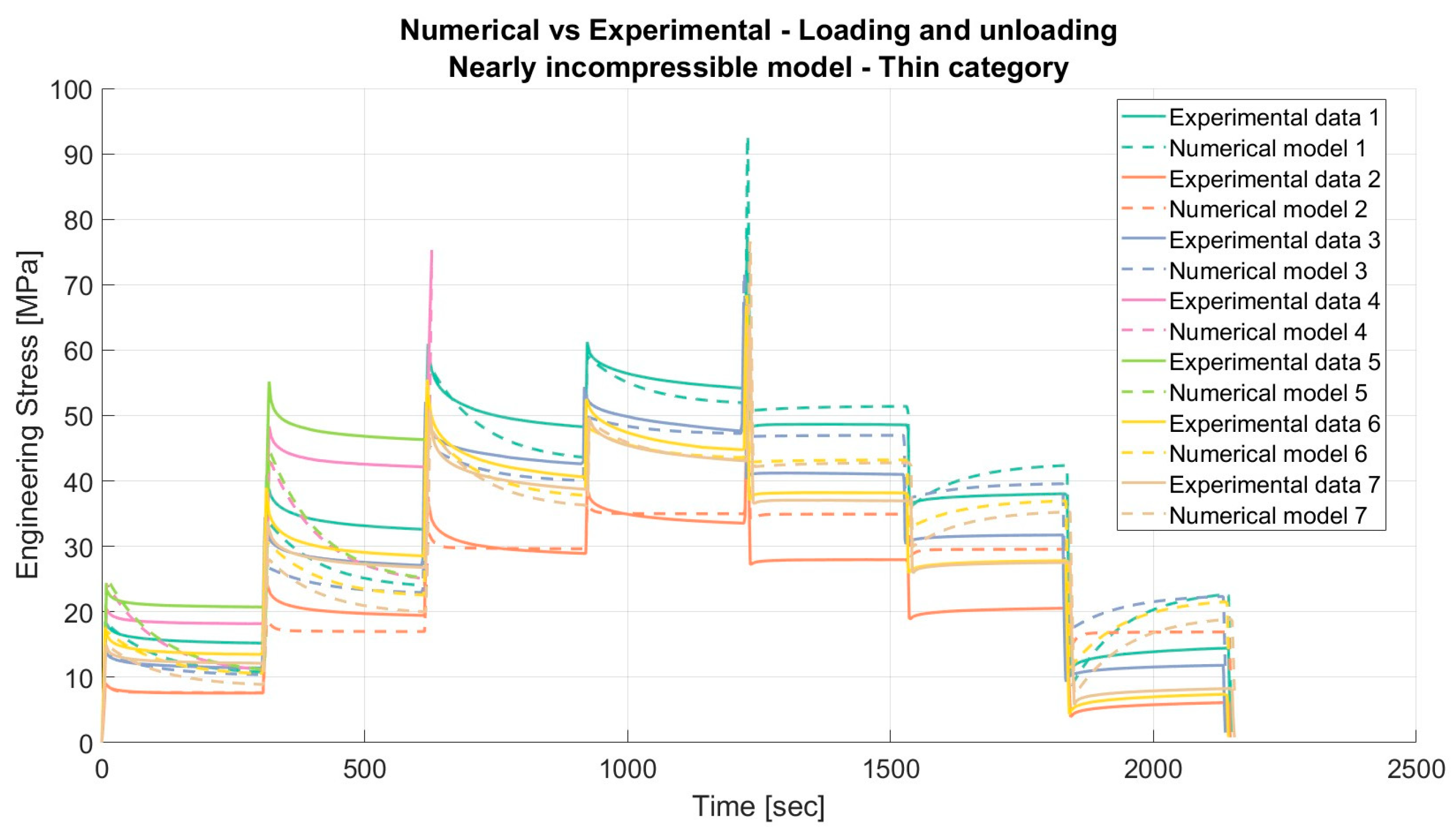 Results for the nearly incompressible material model applied to porcine FDS tendons of the “Thin” category for loading and unloading, with a relaxation time of 300 s.