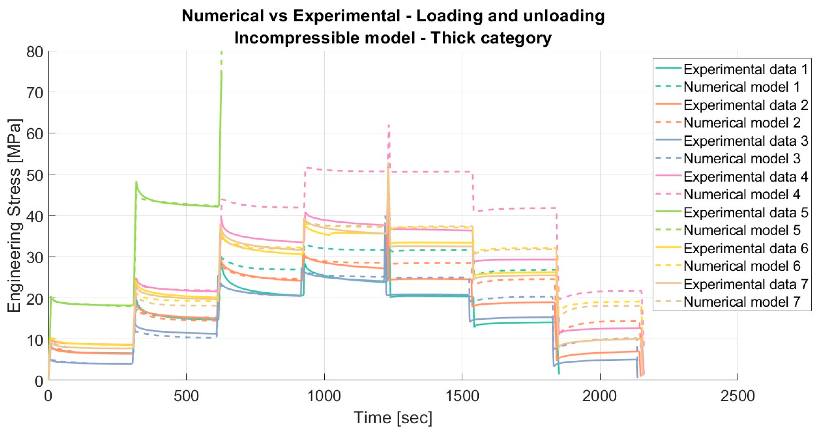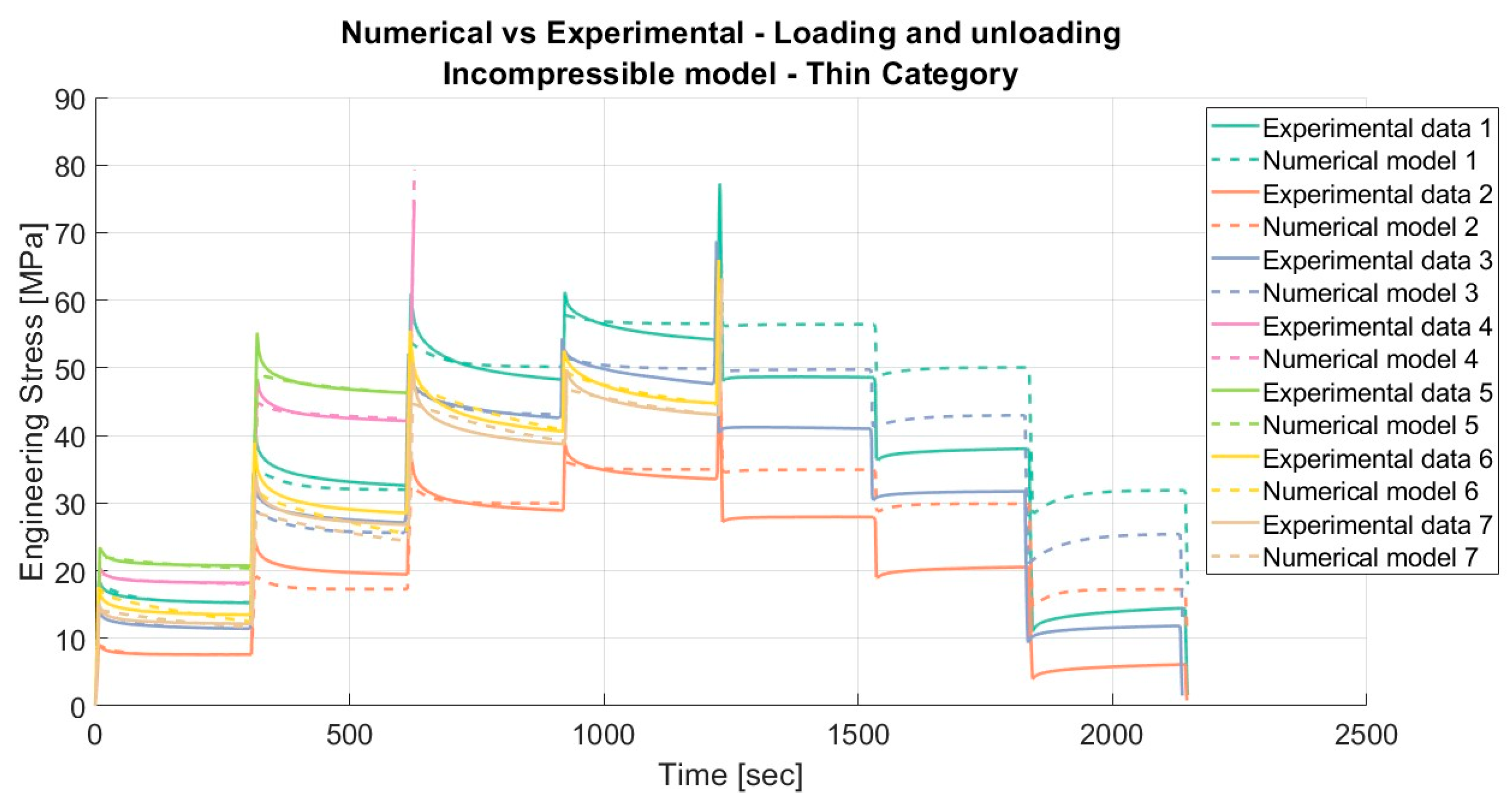 Results for the incompressible material model applied to porcine FDS tendons of the “Thin” category for loading and unloading, with a relaxation time of 300 s.