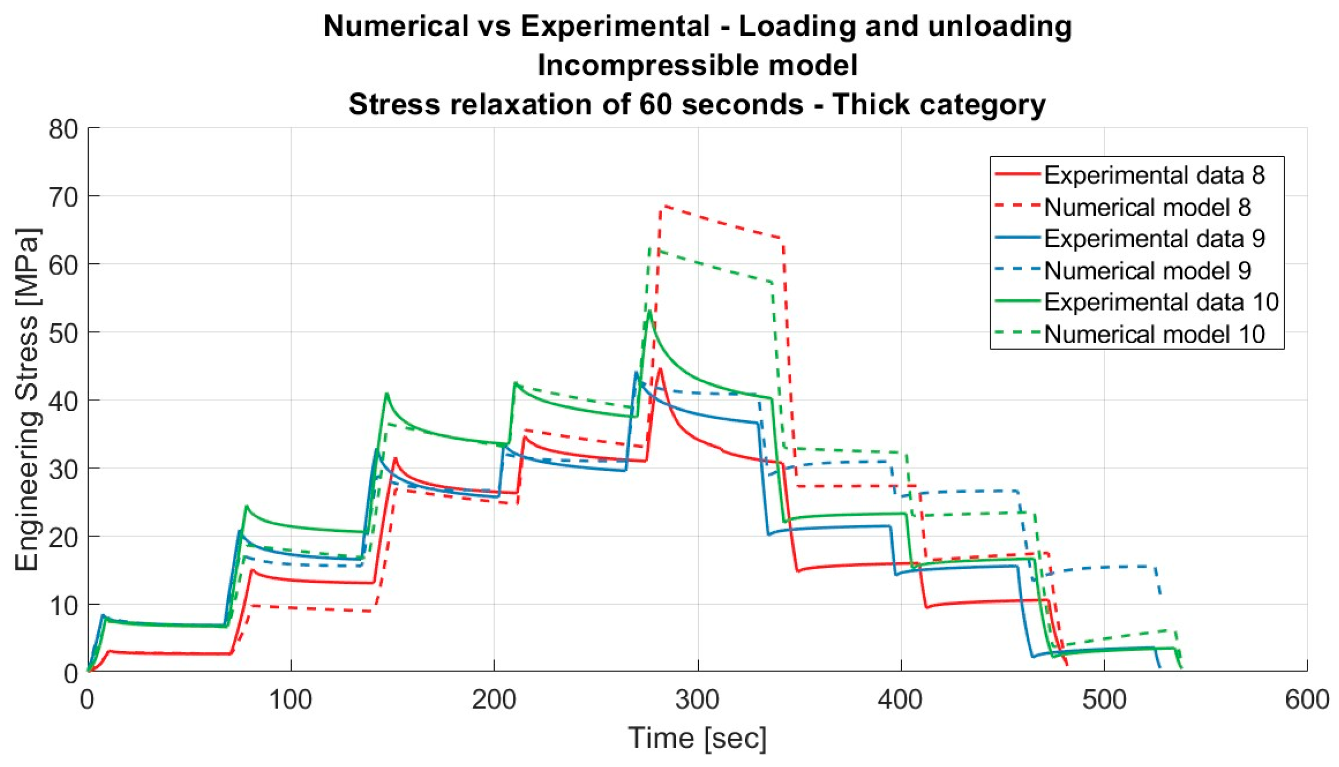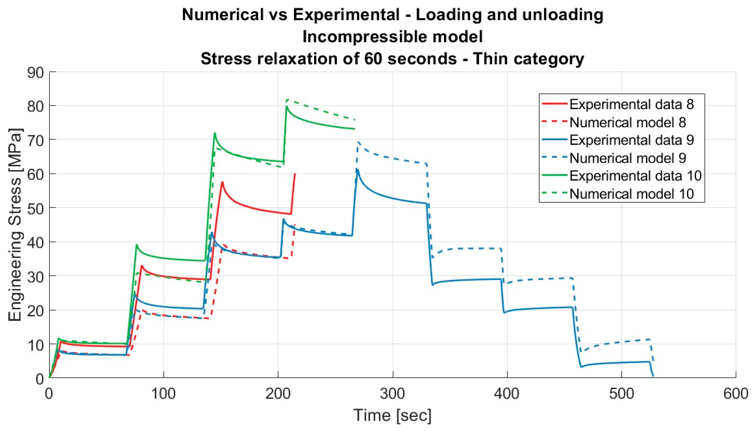 Results for the incompressible material model applied to porcine FDS tendons of the “Thin” category for loading and unloading, with a relaxation time of 60 s.