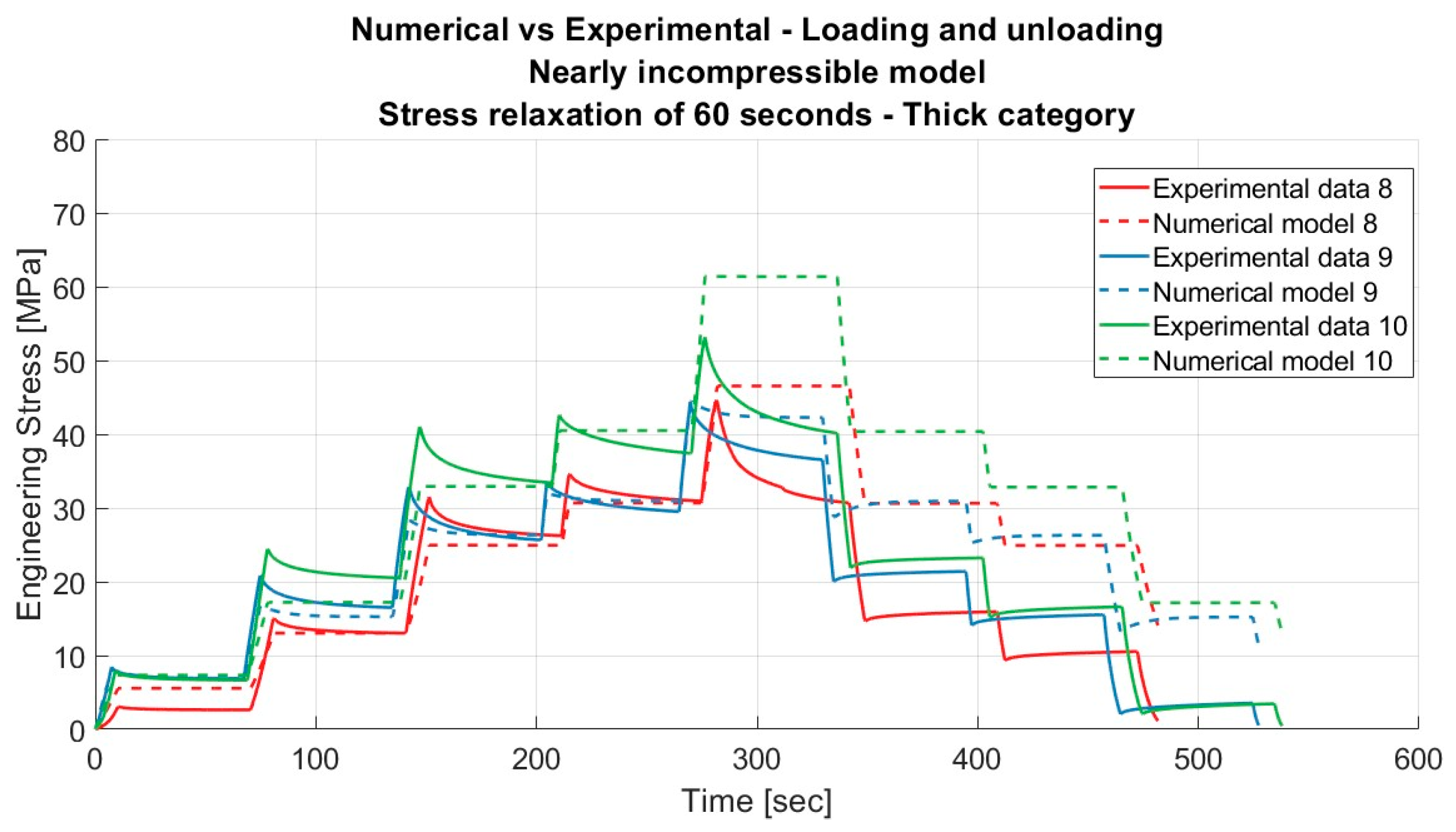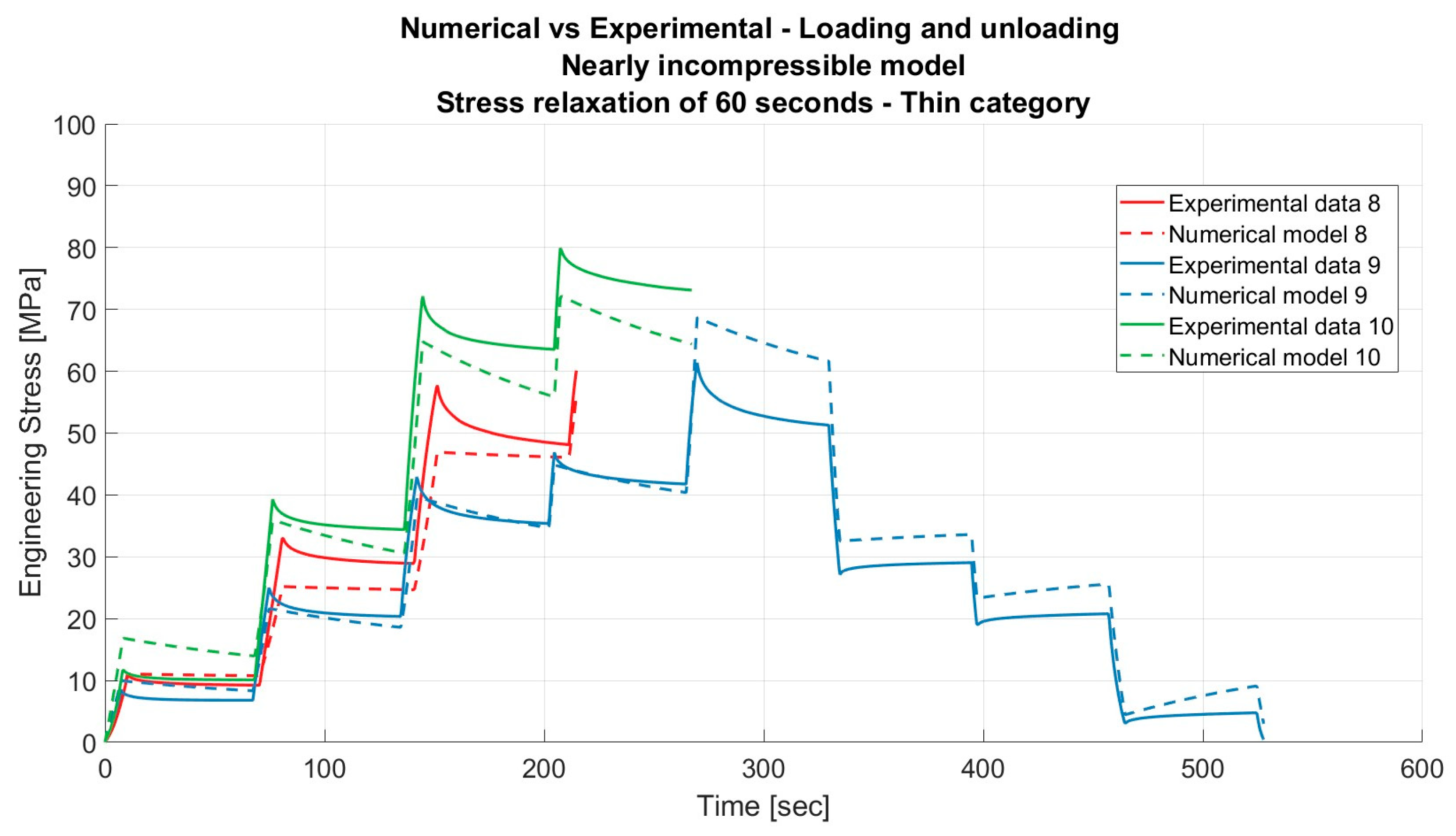 Results for the nearly incompressible material model applied to porcine FDS tendons of the “Thin” category for loading and unloading, with a relaxation time of 60 s.