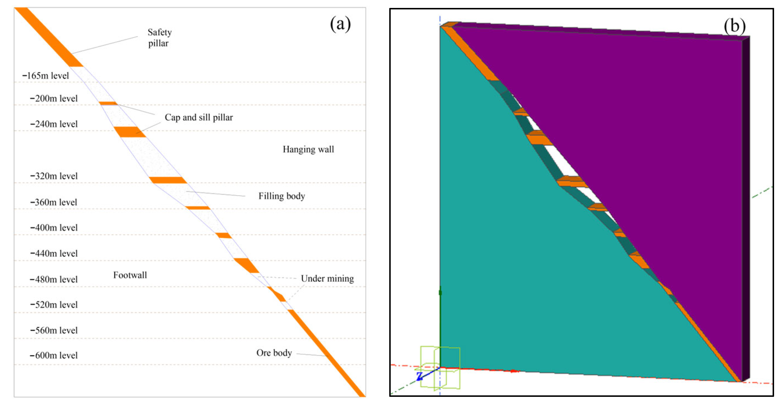 - The actual orebody model of the Sanshandao Gold Mine was established by the coupled Midas-Flac software, and the mining-stress distribution acting on the backfill at different mining levels were revealed. Thus, the theoretical compaction rate of the backfill in the stopes is calculated to be 0–2% by eliminating the shrinkage caused by water seepage of the backfill and the compaction effect of the shovel loader.