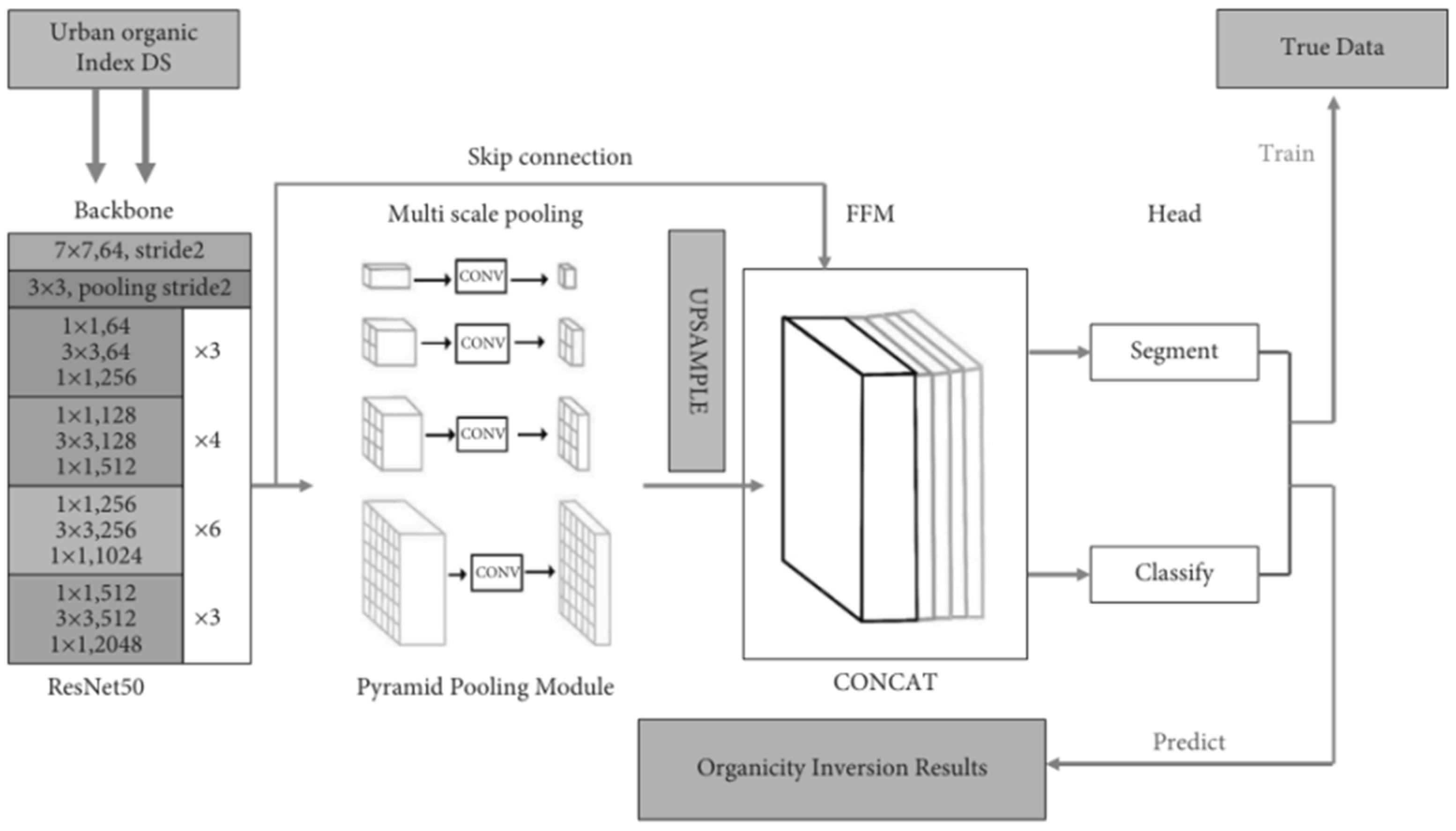 The three-channel input data are first processed by the designed front-end backbone module ResNet50. This module employs a 7 × 7 convolution kernel with 64 filters to generate a 64-channel feature map, followed by pooling using a 3 × 3 pooling window. Subsequently, after 48 convolution operations, the number of channels expands to 2048, fully extracting the features of the data information. The data then proceed through forward propagation into the pyramid pooling module, where pooling operations are performed under 1 × 1, 2 × 2, 3 × 3, and 6 × 6 pooling windows to obtain multi-scale feature maps. Next, 1 × 1 convolution is used to reduce the dimensionality of the channels, and bilinear interpolation upsampling is applied to restore the feature maps to an appropriate size before entering the feature fusion module. In the feature fusion module, two fusion methods are typically employed, i.e., one is channel concatenation (abbreviated as Concat), and the other is pixel-wise addition followed by convolution operations. Assuming the input channels are x