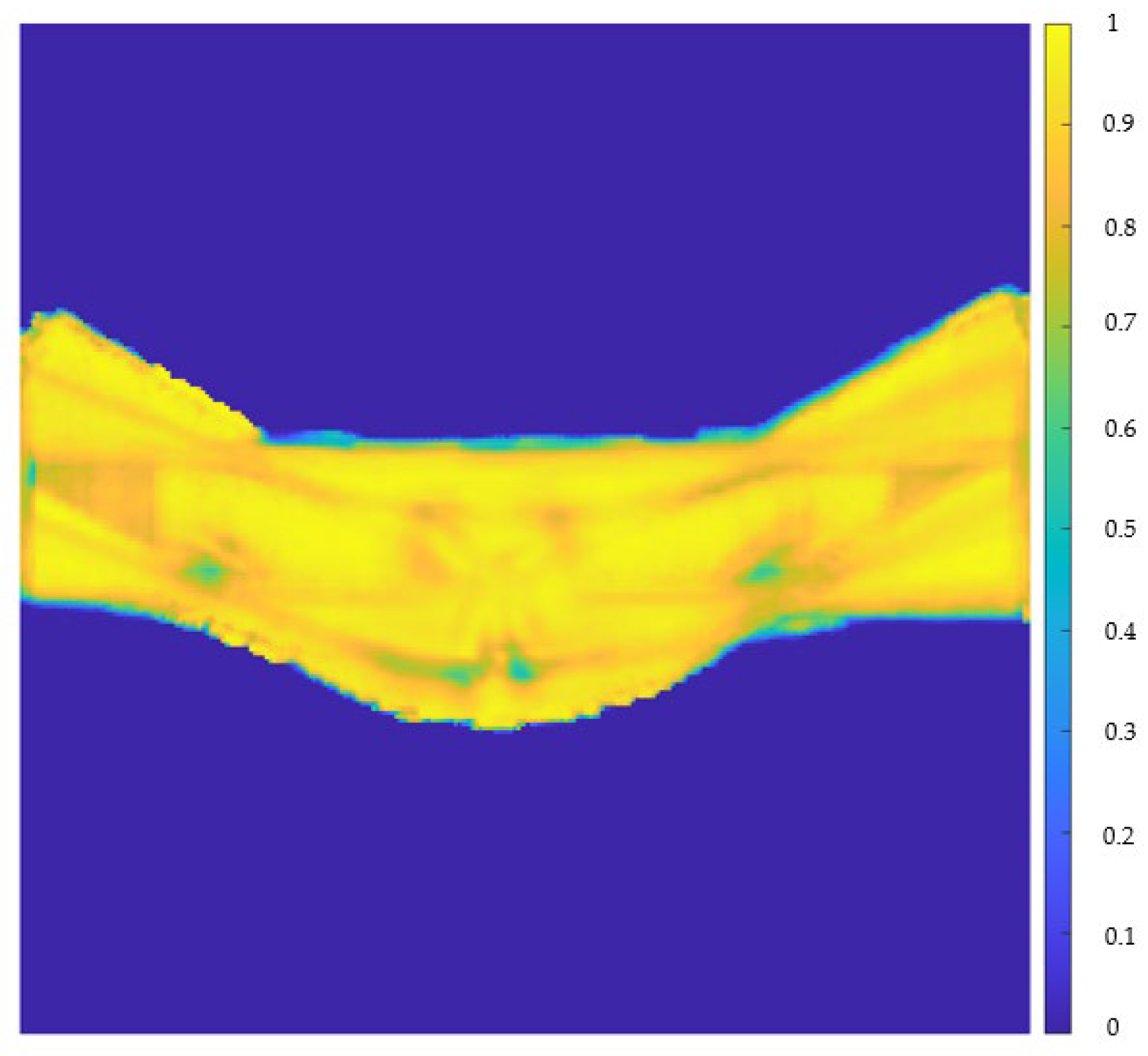 The central region corresponding to the deforming specimen exhibits uniformly high agreement (R2 ≈ 0.8–1.0), while the background and masked regions show lower values, as expected, due to near-zero temperature gradients that amplify relative errors. The predicted thermal fields obtained from the trained U-Net remained largely within this physically meaningful range, with values spanning from −0.0615 to 0.9825. The small drift into negative values (≈6% below zero) is expected for convolutional regression networks trained without an explicit output constraint or activation function at the final layer. Such networks can produce unbounded continuous outputs, and slight under- or overshooting near sharp gradients or data-sparse regions is common. These deviations are minor relative to the dynamic range of the normalized data and do not introduce structural artifacts. In practice, negative predictions can be safely clamped to zero during inference without loss of information, while the upper range remains relatively aligned with the true values.
