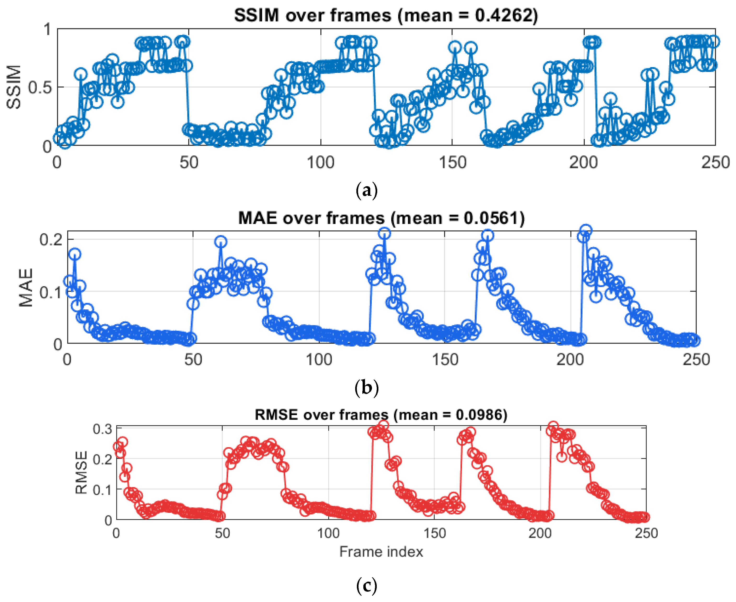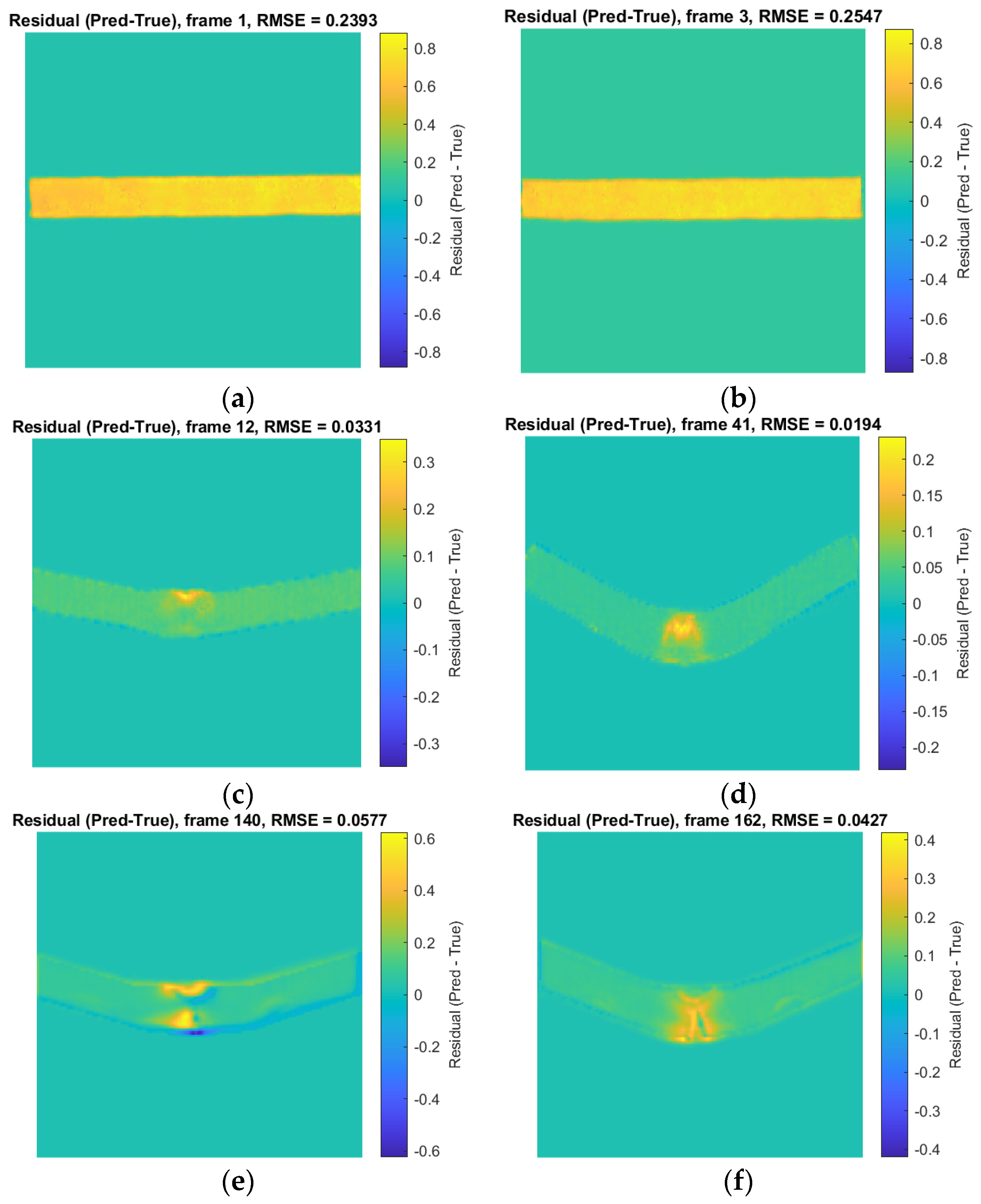 Figure 10), the MAE stabilizes around 0.02–0.04, the RMSE falls to 0.01–0.03, and the SSIM reaches 0.6–0.8, indicating very good agreement. Representative residual maps (e.g., frames 12 and 41, see
