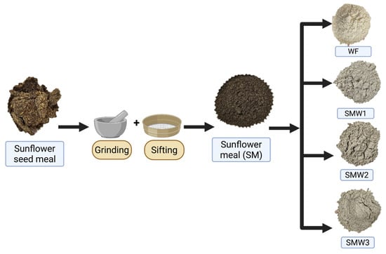 The sunflower meal was purchased from Soloverde SRL in Timisoara (Romania), while the type 650 wheat flour was purchased from the Selgros supermarket in the same city. As part of this study, three types of flour composed of sunflower meal and wheat were formulated (see Figure 1), in accordance with the work of [25]. The compound flours are designated SMW1, SMW2, and SMW3. They are composed of 10% sunflower meal flour (SM) and 90% wheat flour (WF), 20% SM and 80% WF, and 30% SM and 70% WF, respectively. This methodical approach enables the identification of an optimal incorporation threshold, considering both the improvement in nutritional value and the constraints related to bread making, as well as the acceptability of the final product.