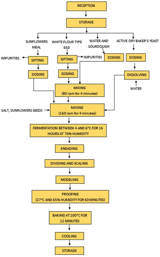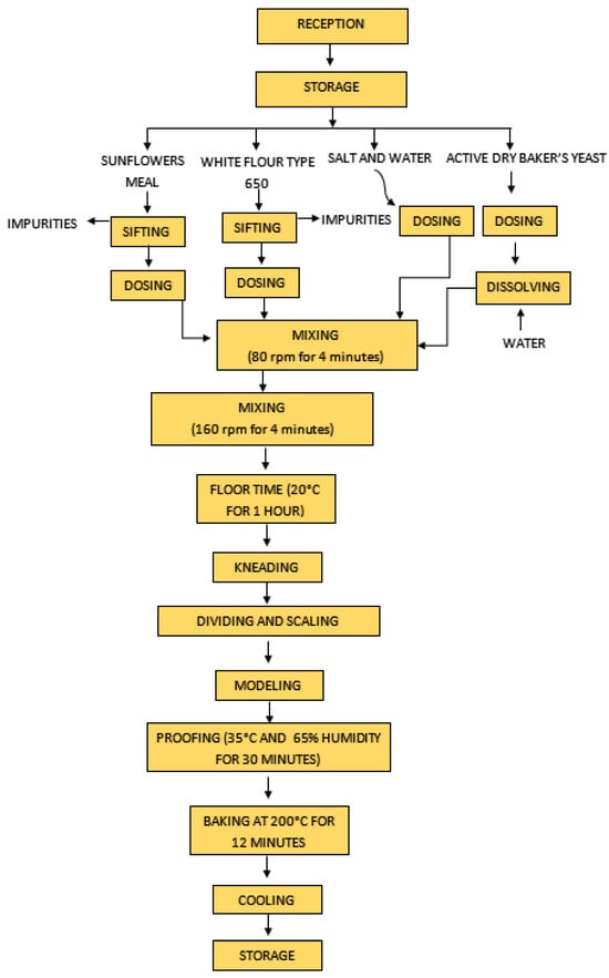 Preparation of the different types of bread was carried out according to the methods described by [27], with a few adjustments. Four bread formulations (CB, SMWB1, SMWB2, and SMWB3) were prepared using the previously obtained WF, SMW1, SMW2, and SMW3 flours, respectively. All ingredients used in bread making (type 650 wheat flour, salt, and active dry baker’s yeast) were purchased from the local Selgros supermarket in Timisoara, Romania, except sunflower meal. The breads obtained and their compositions are presented in Table 1. The technological process used to make the bread is illustrated in Figure 2.