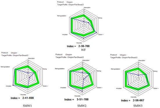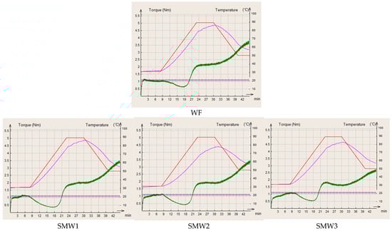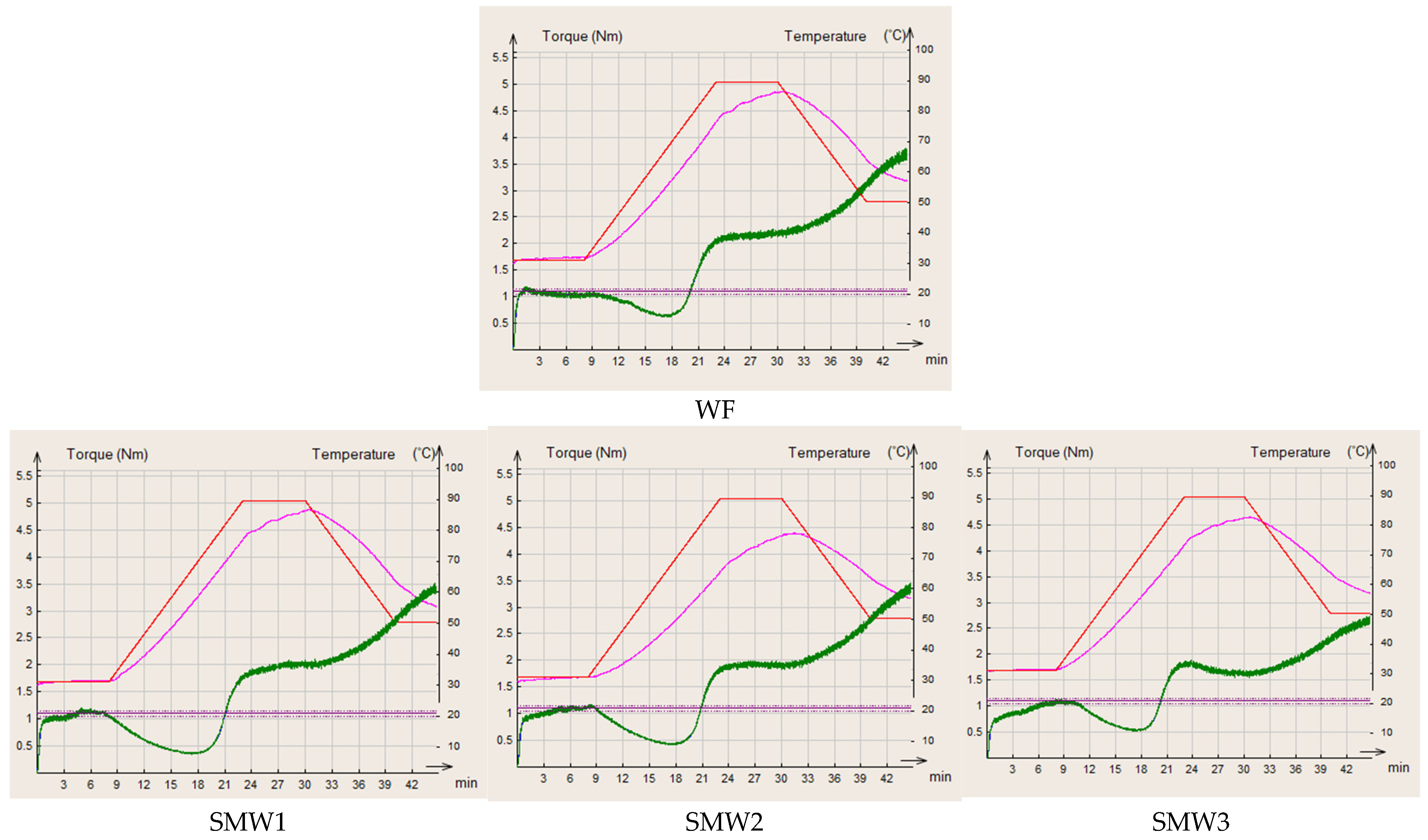 To evaluate the effect of replacing wheat flour with sunflower meal flour on rheological properties, a rheological analysis was performed on each of the flour samples (WF, SMW1, SMW2, and SMW3) using Chopin Mixolab equipment (Chopin Technologies, Paris, France) and the ‘Chopin+’ protocol. Quantities ranging from 42 to 49 g of each sample were placed in the Mixolab bowl, depending on the moisture content (determined by a Kern & Sohn GmbH thermobalance, D-72336 Balingen, Germany) and the sample’s water absorption, and mixed. Once the solids had been tempered, water was added to the mixture to achieve the desired consistency. Particular attention was paid to determining water absorption to ensure that all components were fully hydrated. The parameters measured in the Mixolab profile study included water absorption, dough development time, stability (measured by dough resistance to mixing), maximum torque during mixing—C1, protein weakening—C2, which manifests itself as mechanical stress when the temperature rises, starch gelatinization rate—C3, minimum torque—C4, and torque—C5 after cooling to 50 °C. In addition, Mixolab determined the following parameters: cooking stability (C4/C3), protein weakening under the effect of heat (alpha slope), starch gelatinisation rate (beta slope), enzymatic degradation rate (gamma slope), and starch retrogradation during cooling (C5–C4), which represents the shelf life of the final products [26].