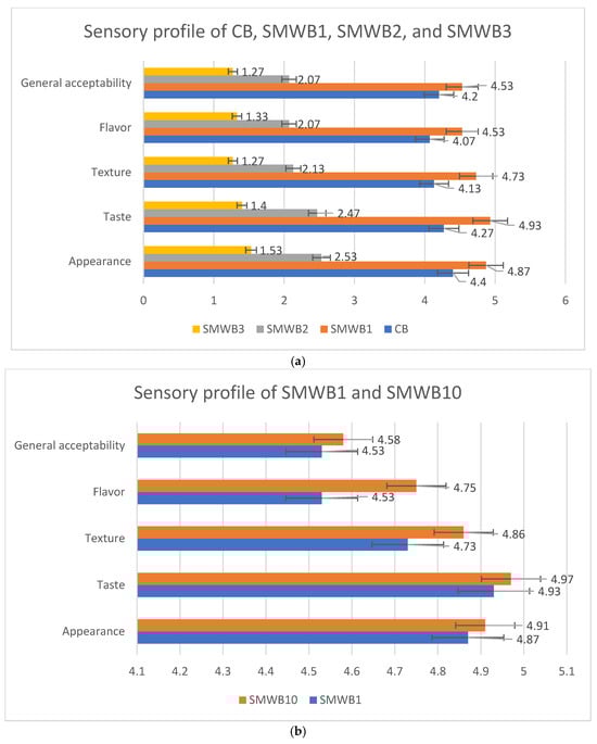 The sensory evaluation of the different bread samples (CB, SMWB1, SMWB2, SMWB3, and SMWB10) was conducted by a panel of 43 volunteer assessors (21 men and 22 women), selected and trained in accordance with ISO 6658:2017 [35]. All panelists were non-smokers, aged between 20 and 51, and had no history of food allergies, to assess their acceptability and preferences. As part of this study, the appearance, taste, aroma, texture, and overall acceptability of each type of bread were rigorously evaluated. To do this, the study subjects were asked to use a 5-point hedonic scale, where 1 = extremely disliked, 2 = slightly disliked, 3 = neither liked nor disliked, 4 = slightly liked, and 5 = extremely liked. The bread samples were sliced and presented individually to each evaluator on paper plates marked with three-digit codes. They were asked to rinse their mouths with plain water between each tasting. In the context of this study, approval from the Bioethics Committee is not necessary due to the non-invasive nature of the research, which does not involve the use of live animals in an experimental setting. All 43 participants consented to take part in the experiment on a voluntary basis.
