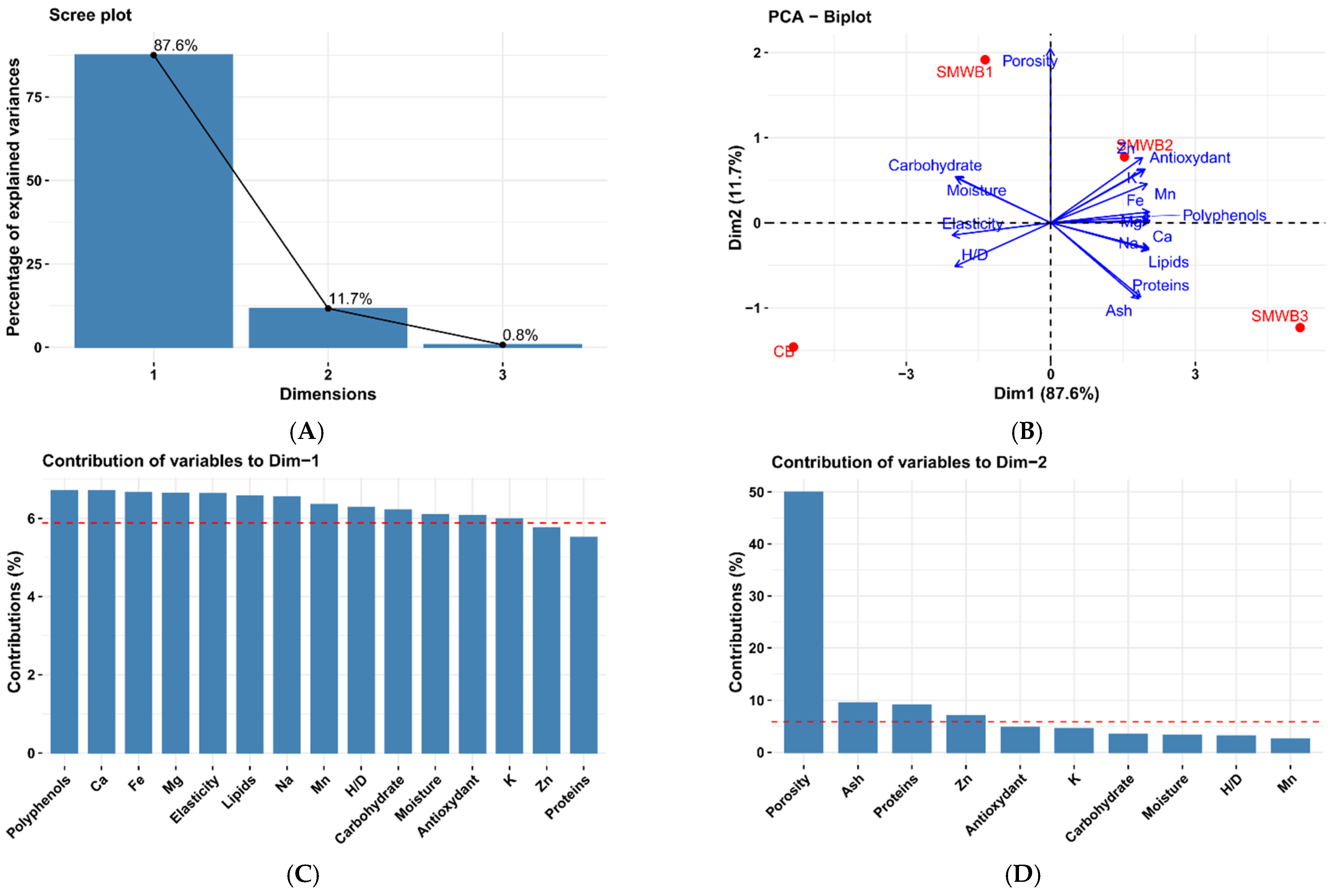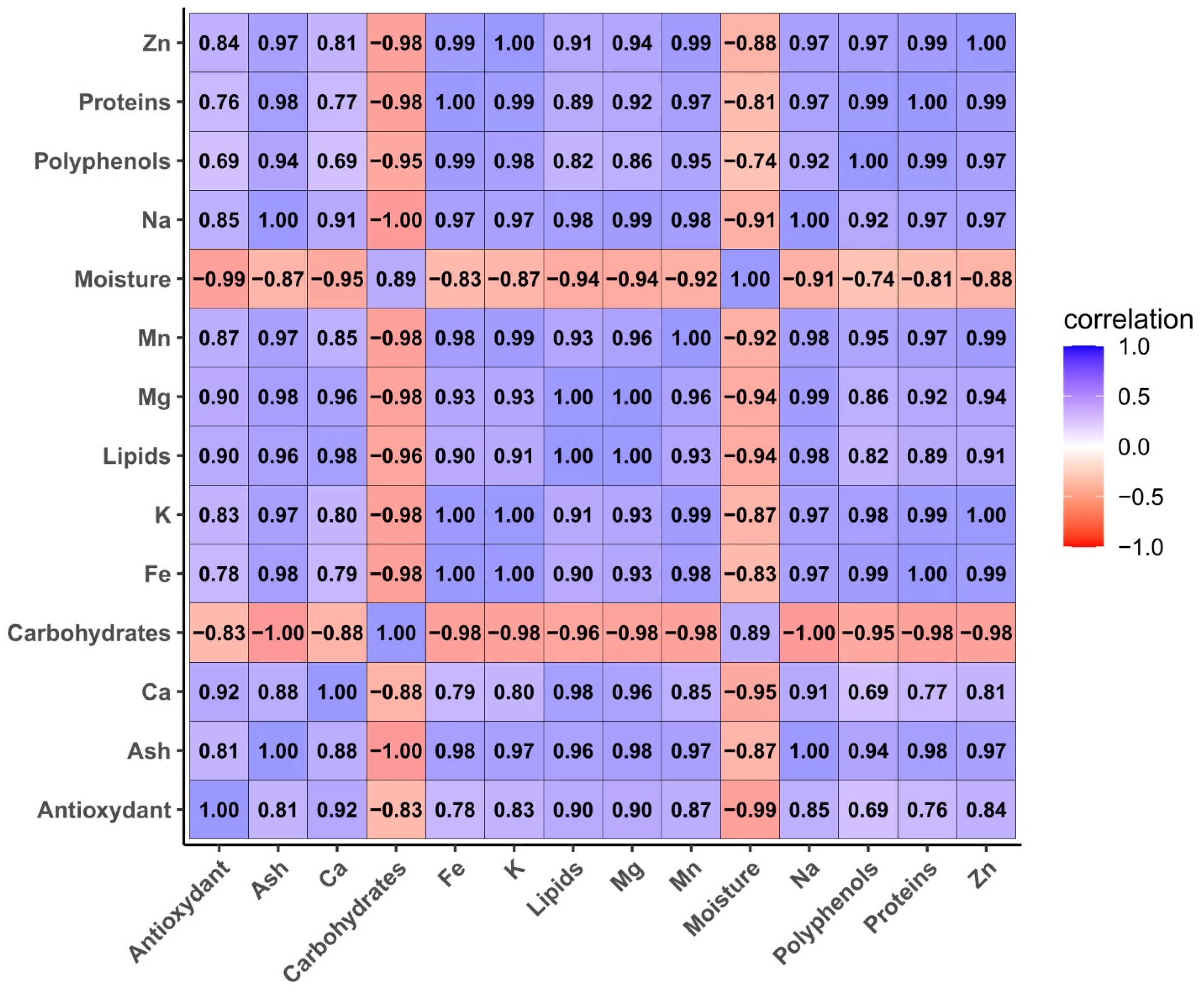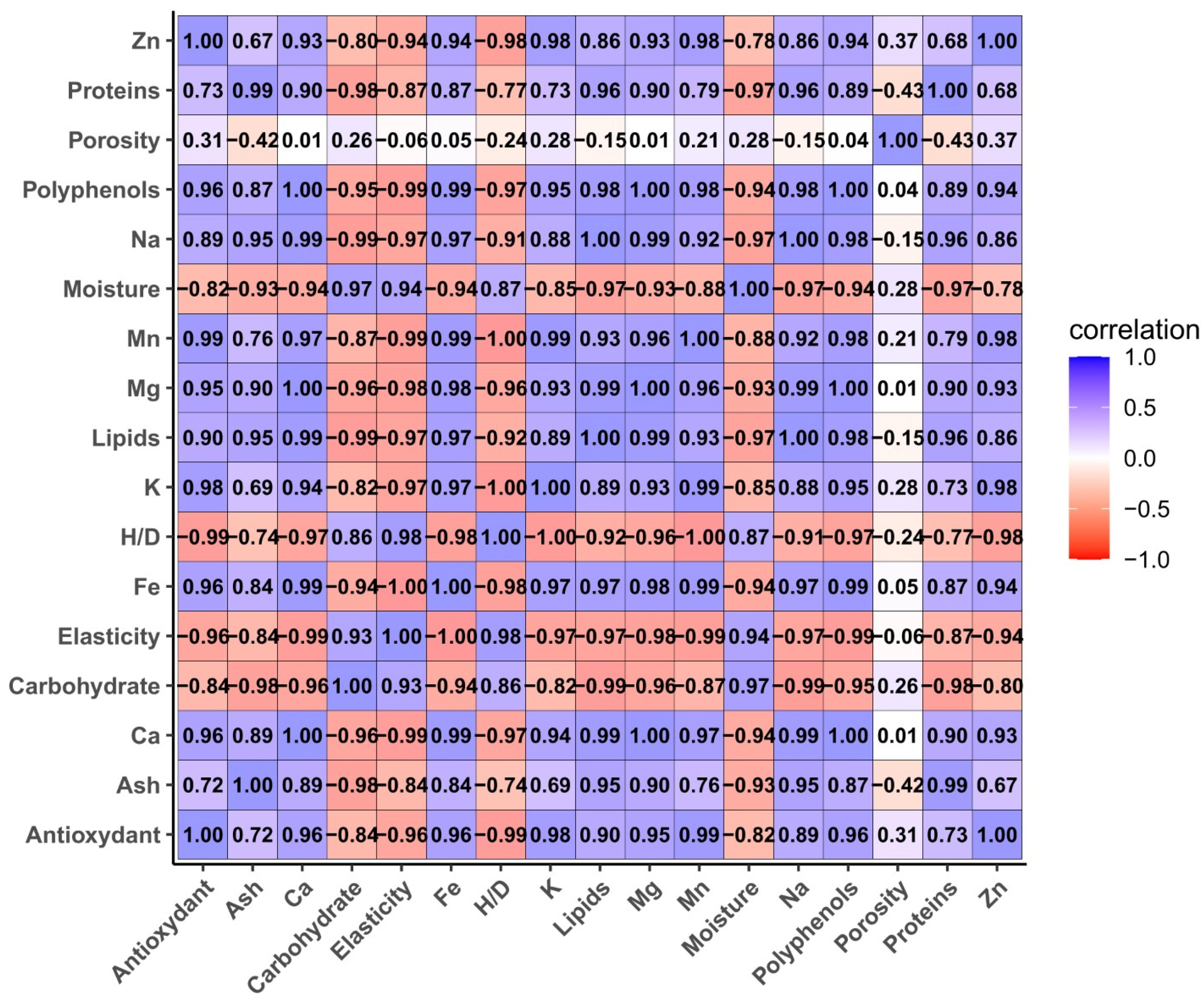 All measured data were initially subjected to Duncan’s multiple range test (after ANOVA) to compare means and identify statistically significant differences (p < 0.05) among samples for both flour and bread parameters. Following this initial comparative analysis, three multivariate statistical methods were applied sequentially: Linear Correlation Analysis, Principal Component Analysis (PCA), and Cluster Analysis. For the flour samples, these multivariate analyses considered the following 14 parameters: Zinc (Zn), Proteins, Polyphenols, Sodium (Na), Moisture, Manganese (Mn), Magnesium (Mg), Lipids, Potassium (K), Iron (Fe), Carbohydrates, Calcium (Ca), Ash, and Antioxidants. For the bread samples, the same three multivariate methods were applied to an expanded set of 18 parameters: Zinc (Zn), Proteins, Porosity, Polyphenols, Sodium (Na), Moisture, Manganese (Mn), Magnesium (Mg), Lipids, Potassium (K), Height/Diameter ratio (H/D), Iron (Fe), Elasticity, Carbohydrates, Calcium (Ca), Ash, and Antioxidants. Linear Correlation Analysis was used to assess the strength of linear relationships between variables. PCA was employed for data reduction and the identification of underlying patterns, while Cluster Analysis was used to classify the samples based on their similarity in characteristics. All statistical computations were performed using the R statistical computing environment (v4.3.3; R Core Team, 2023, Vienna, Austria).