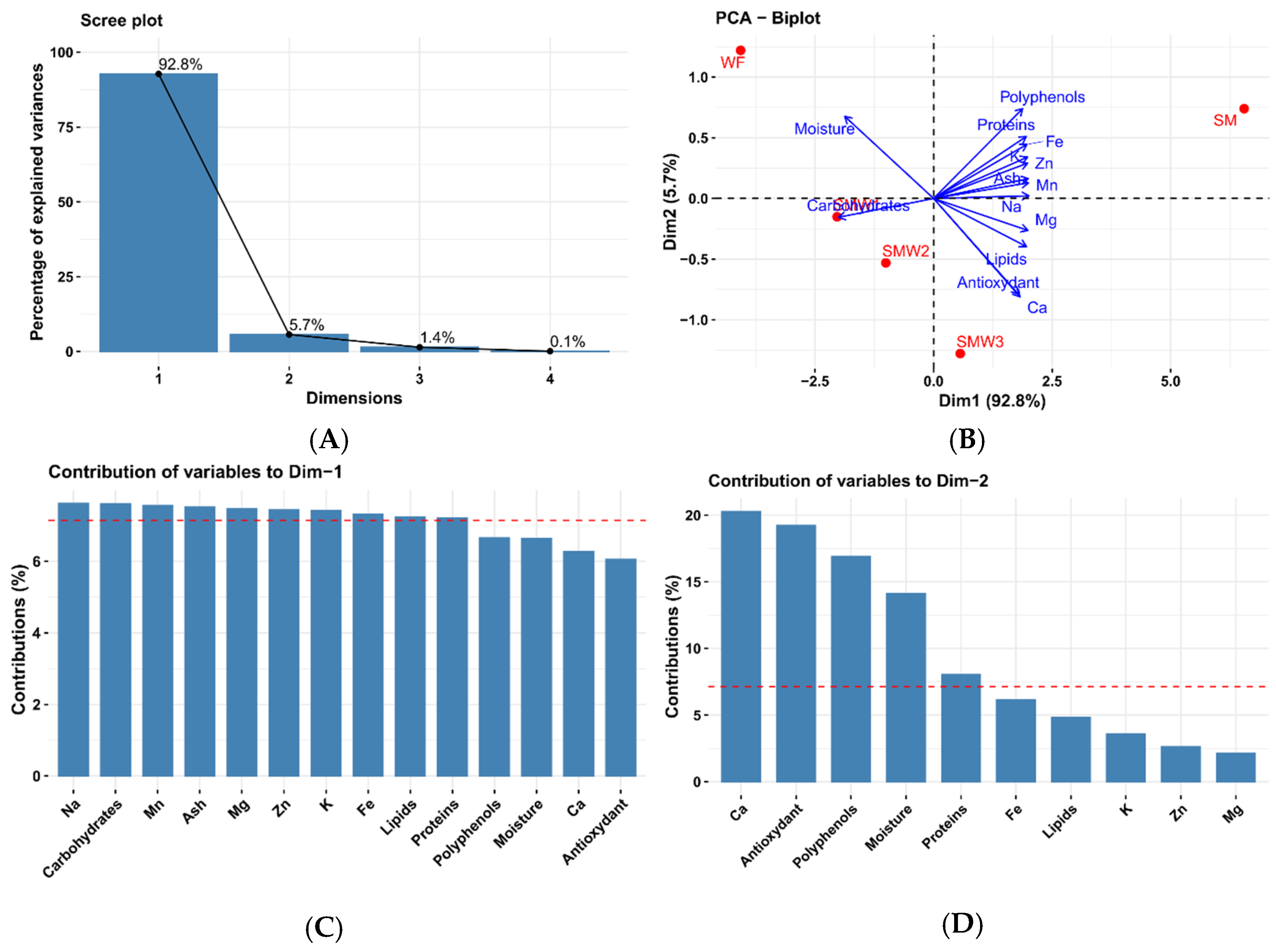 The impact of replacing WF with SM on the mineral composition of different flour samples (WF, SM, SMW1, SMW2, and SMW3) and bread samples (CB, SMWB1, SMWB2, SMWB3, and the improved bread: SMWB10) was studied. To this end, the macro- and microelement composition of each sample was determined using the methodology established by [27]. The analyses were performed in triplicate, and the results are expressed in milligrams per kilogram (mg/kg).