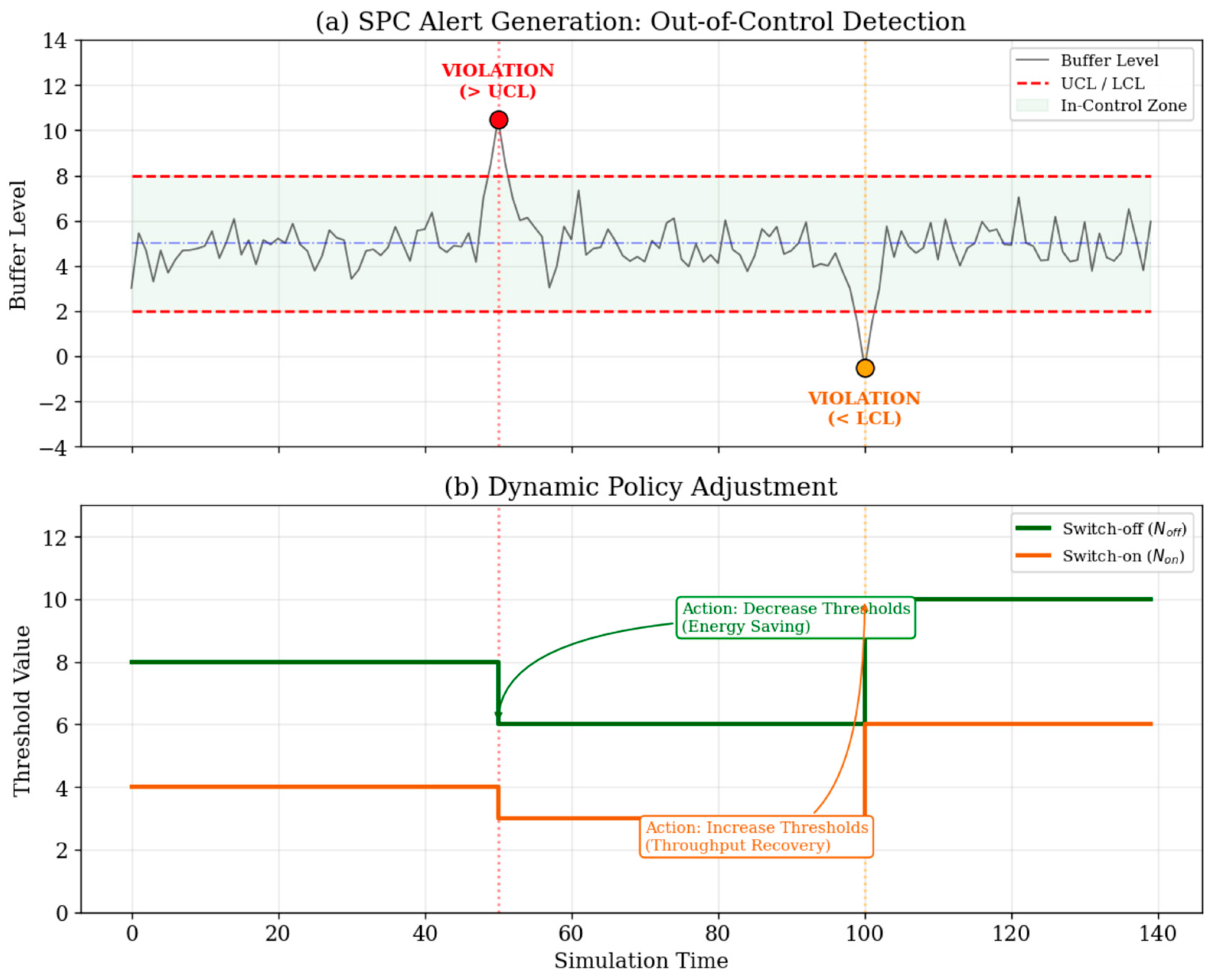 In the proposed framework, out-of-control signals do not indicate statistical instability of the process. Instead, they act as operational indicators of sustained buffer accumulation or depletion, triggering corrective threshold adjustments. This interpretation reflects current Industry 4.0 practices, where SPC-inspired tools are increasingly used as real-time, explainable decision-support mechanisms in non-stationary and feedback-driven systems.