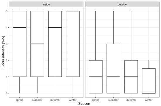 Seasonality in odour perception was observed exclusively in open outdoor spaces, whereas odour intensity inside the facility remained consistently high throughout the year. This finding underscores the dominant role of local microclimatic and operational conditions and explains the masking of seasonal effects in aggregated datasets.