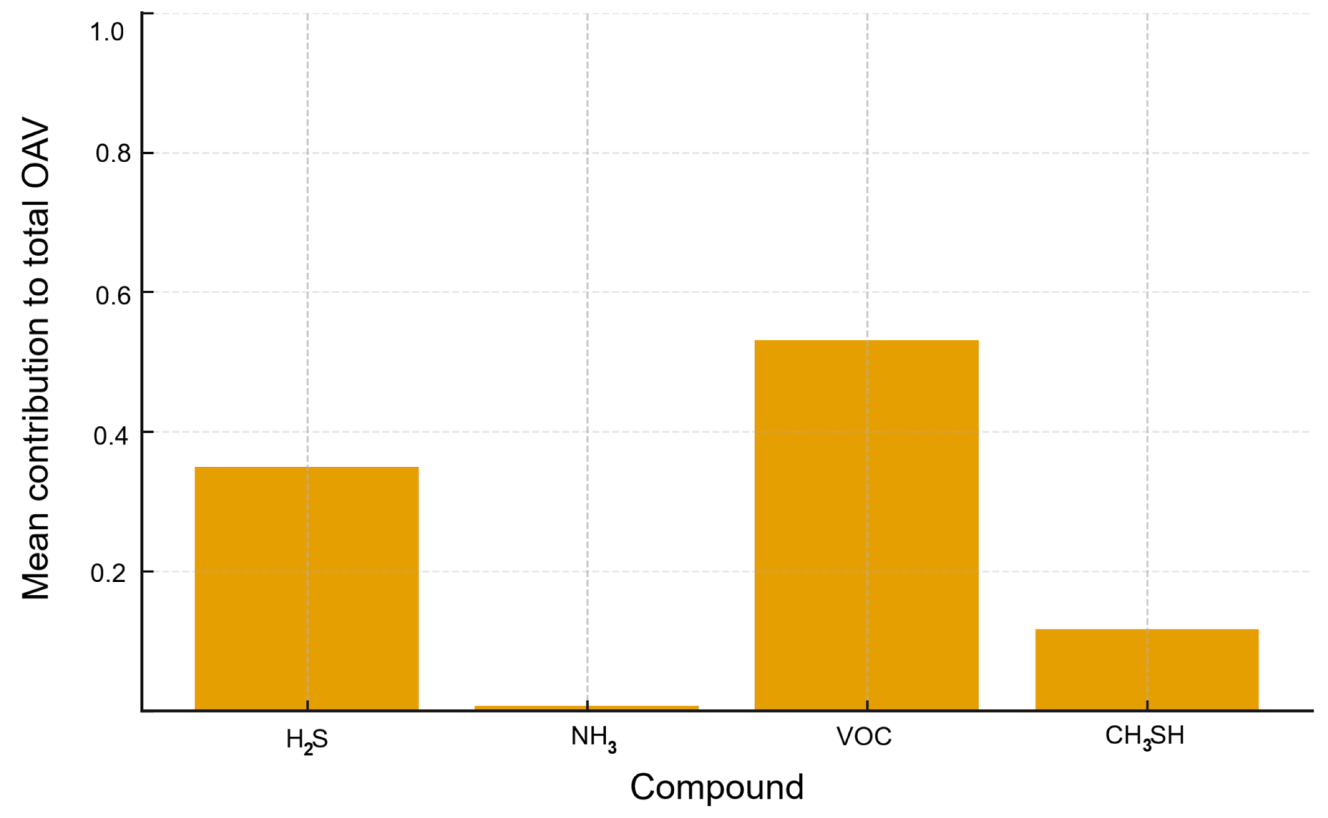 A formal sensitivity analysis using alternative odour detection thresholds was not performed, as OAV was applied primarily as a relative indicator for ranking dominant odorants rather than for absolute prediction of odour perception. Changes in threshold values would proportionally affect absolute OAV magnitudes but would not alter the relative dominance of key compounds, particularly H2S and sulphur-containing species with very low detection thresholds. Consequently, the main conclusions regarding dominant contributors and high-risk odour episodes are robust to reasonable variations in the literature-based threshold values.