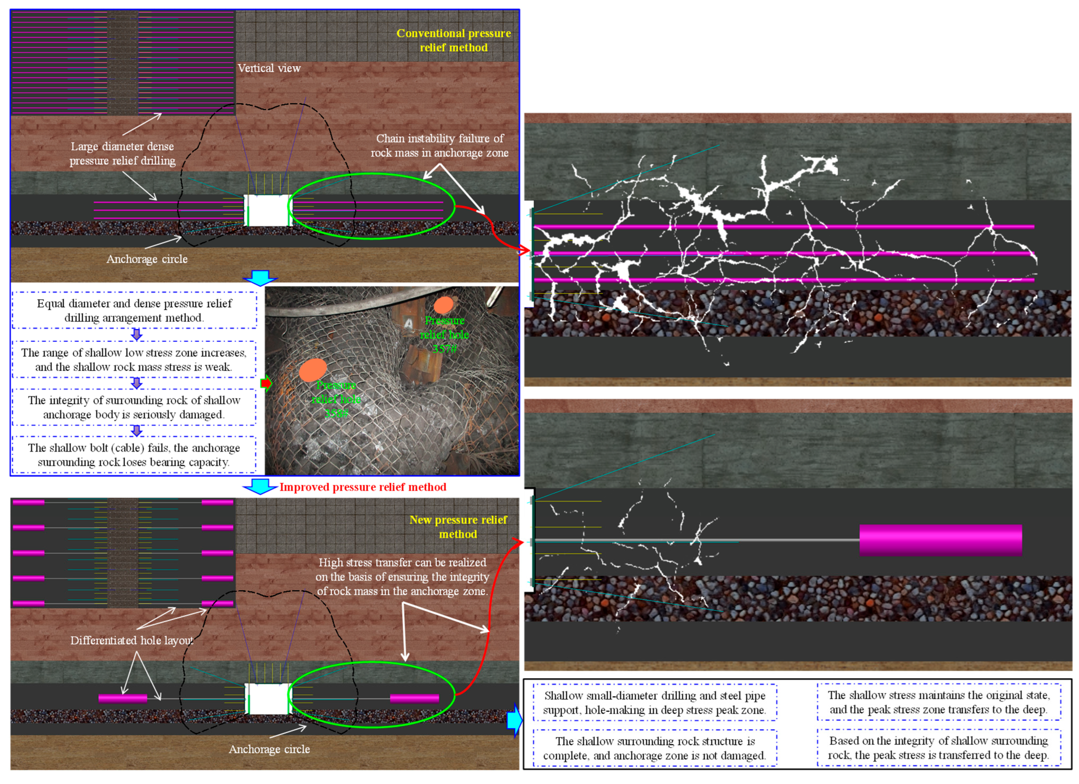 - Wang, M.; Wang, X.Y.; Xiao, T.Q. Borehole destressing mechanism and determination method of its key parameters in deep roadway. J. China Coal Soc. 2017, 42, 1138–1145. [Google Scholar]