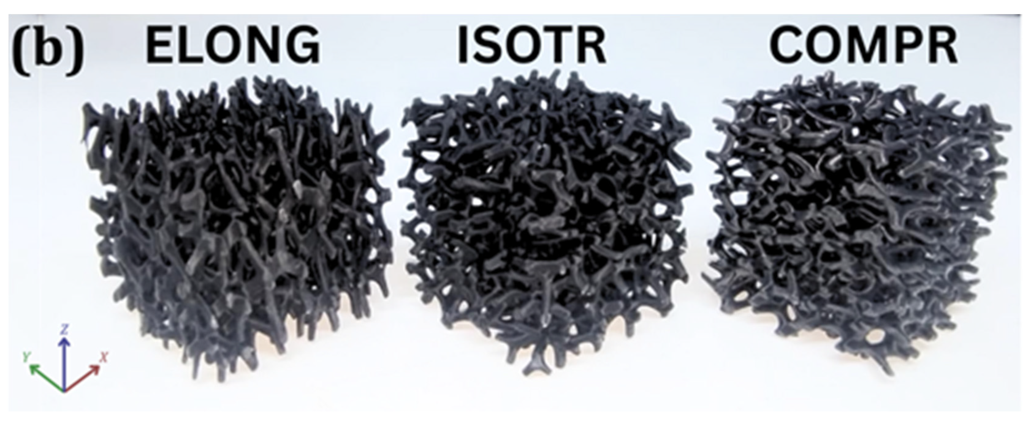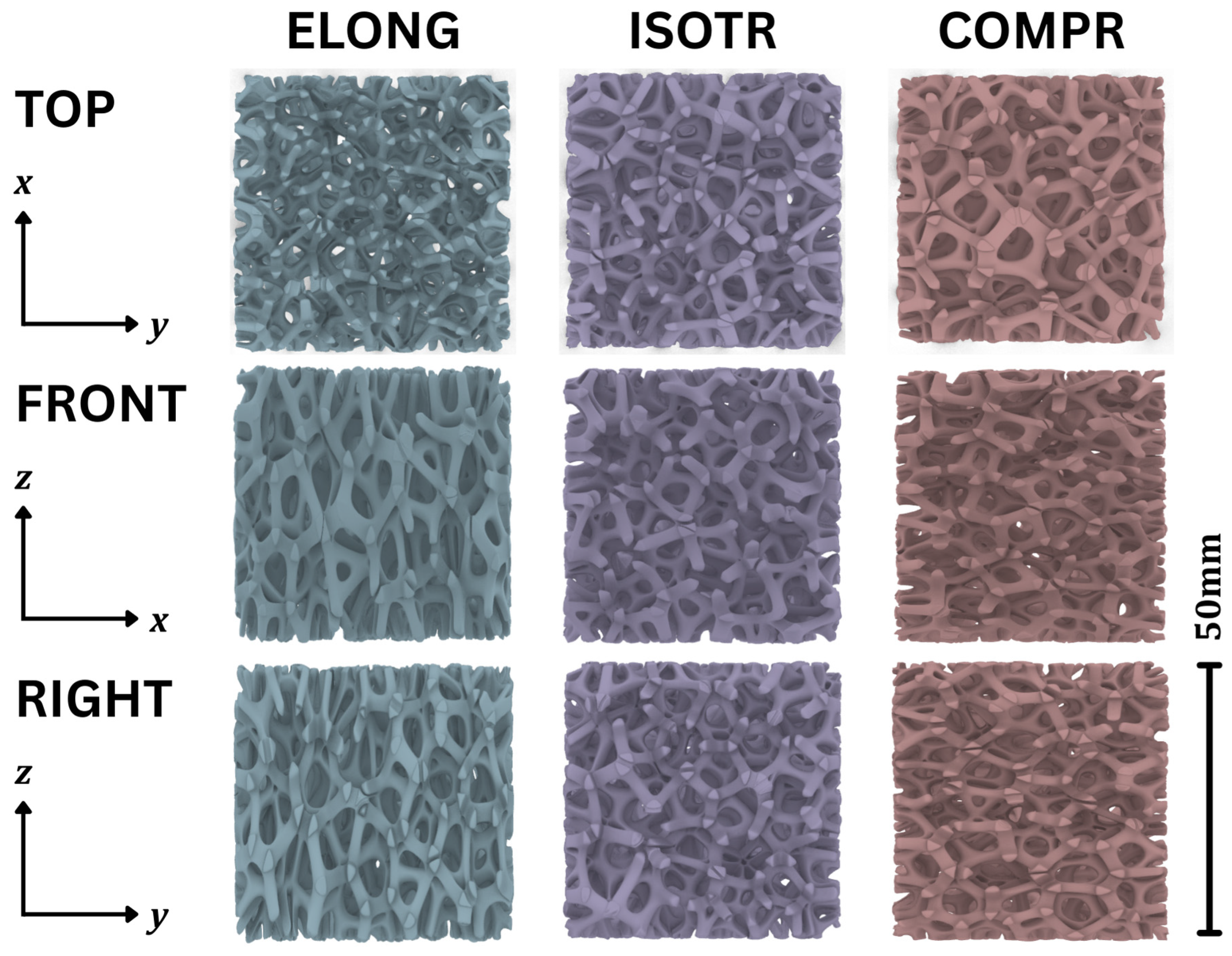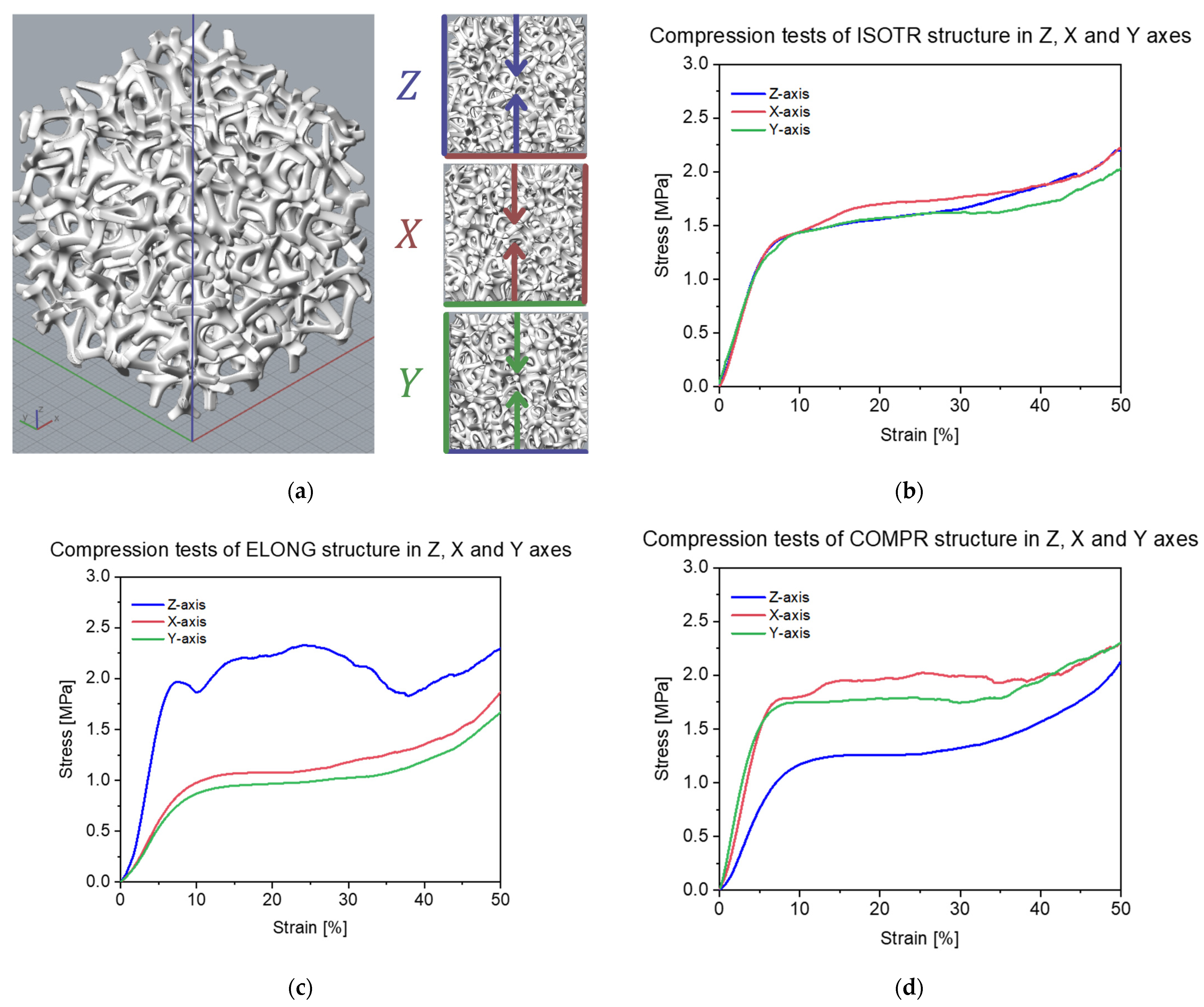 - Yamada, S.; Suzuki, H.; Sawada, K.; Okada, S.; Nishimura, A.; Todoh, M. Novel strut-based stochastic lattice biomimetically designed based on the structural and mechanical characteristics of cancellous bone. Mater. Des. 2025, 251, 113657. [Google Scholar] [CrossRef]