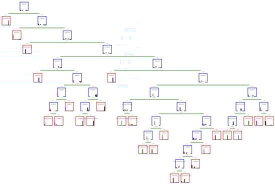 Figure 3. Decision tree No. 5 (blue—vertices (25); red—leaves (26)).