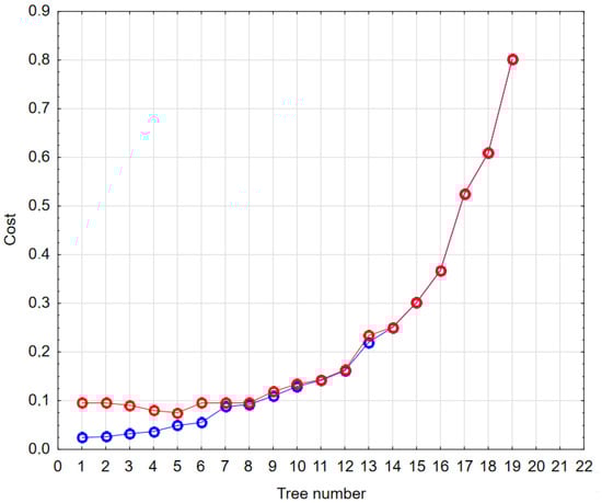 Figure 5. Cost sequence (resubstitution cost—blue line, SK cost—red line).