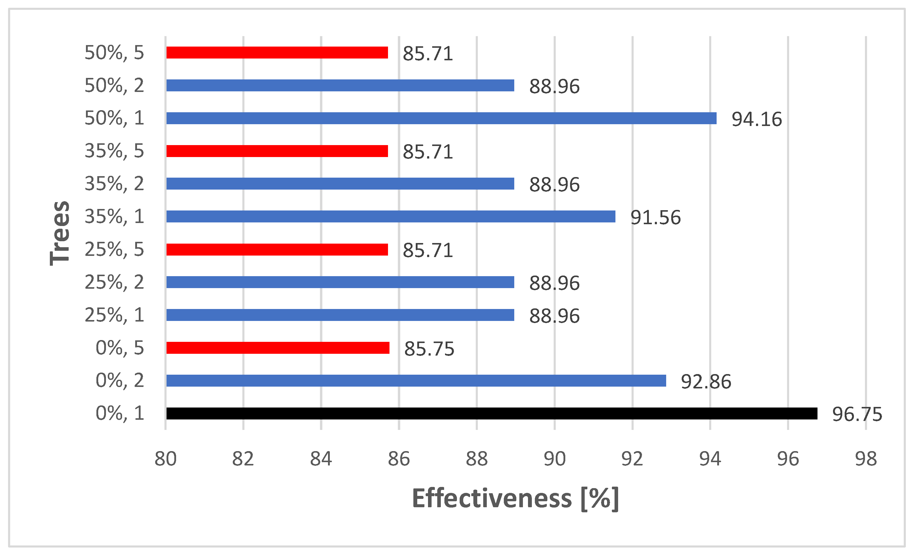 - Developing models by conducting a training phase of these models along with changing two parameters (% pruning and minimum number of examples forming a leaf)—changing these parameters also allowed for reducing the effect of model overfitting;