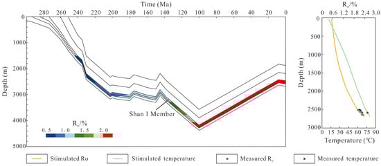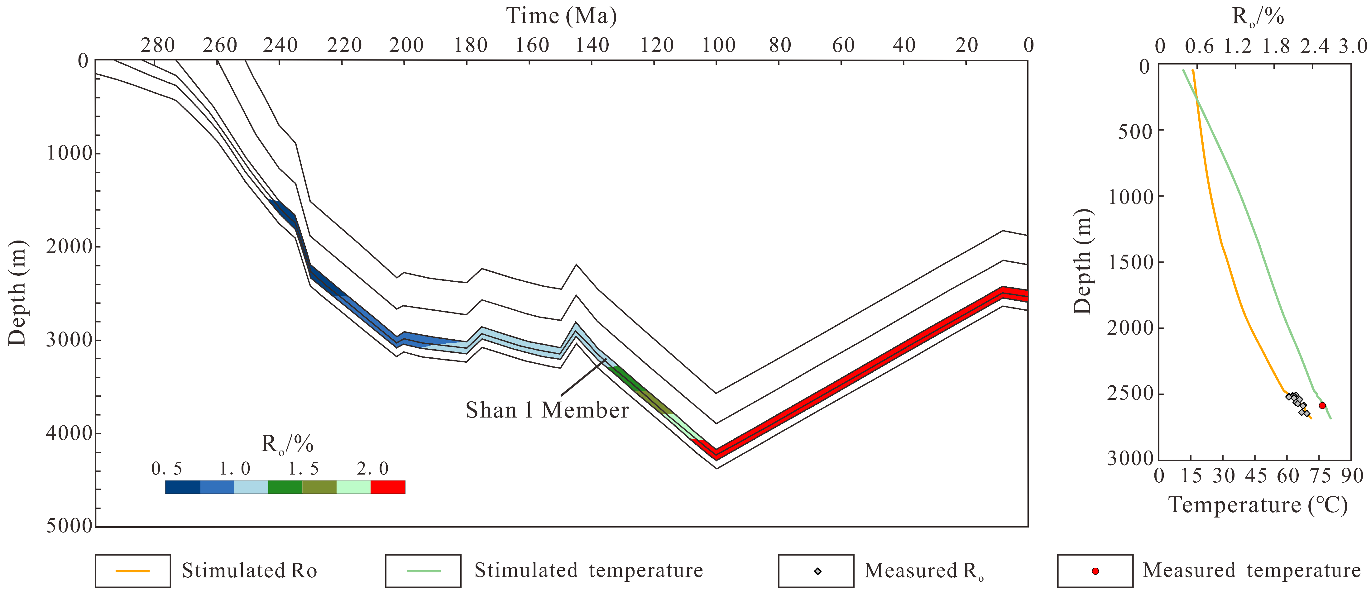 - Cheng, M.; Li, C.; Yin, J.T.; Wang, P.; Hu, C.Z.; Yu, Y.X.; Lei, Y.H.; Zhang, L.K. Modeling of Burial History, Source Rock Maturity, and Hydrocarbon Generation of Marine-Continental Transitional Shale of the Permian Shanxi Formation, Southeastern Ordos Basin. ACS Omega 2024, 9, 20532–20546. [Google Scholar] [CrossRef]